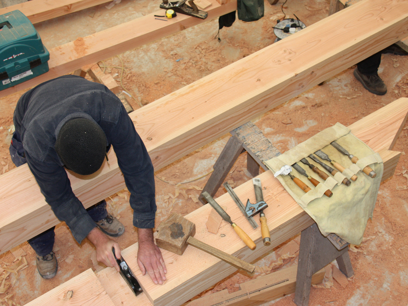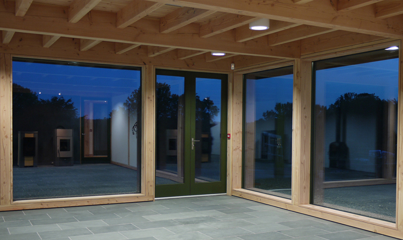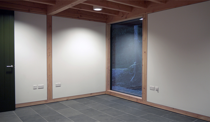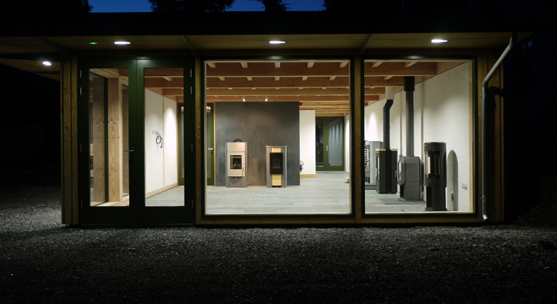 A new showroom for a renewable energy retailer, located in a remote village in North Carmarthenshire. A simple pavilion built from douglas fir, felled from the client’s nearby woodland. The structural span allows the floor plan to be flexible with no internal load bearing walls, so as the business develops, the layout may alter to suit future needs. This building celebrates wood as a living organism, a renewable fuel, and a construction material. This project won RSAW Small Project of the Year Award 2012: “... to elevate something from the everyday to something special is an achievement. This small showroom ... is beautifully detailed, highly crafted and an eloquent demonstration of the client’s commitment to sustainability.”