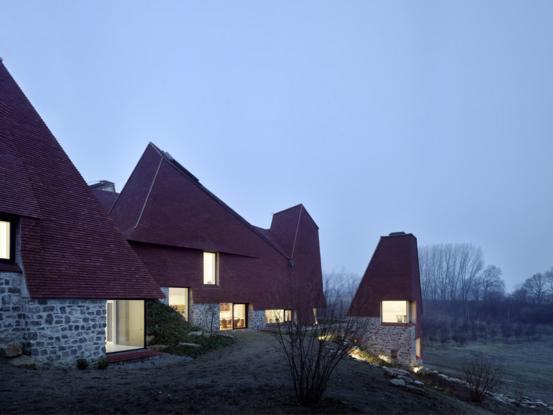 A zero-carbon country estate set in 83 acres of rural countryside near Maidstone, Kent. The clients requested a country home of outstanding quality, rooted in its context, where they, their three daughters and their families could coexist as one: a house for four in one. It is modern & sculptural in design yet remains infused with a spirit of regional identity. The house responds strongly to the slope of the site determining the layout and organisation in section and plan. The house presents itself as the extrovert, embracing the outside; welcoming and open to guests, but also as an introvert, turning its back on the view to focus on a central contemplative courtyard. Extending beyond the house an estate cottage and barn complete the settlement. This project was designed with James Macdonald Wright