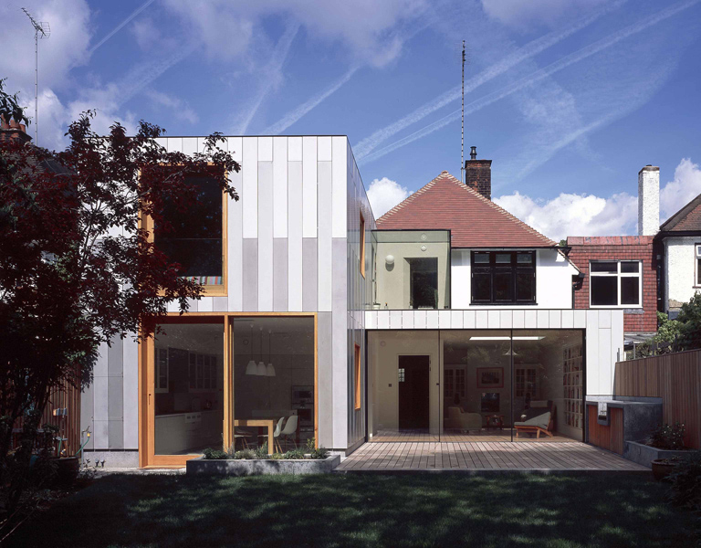 A radical extension and re-modelling of a 1920s detached house, with excellent environmental credentials. The project significantly increases the living space and reconfigures it to take advantage of the lovely rear garden. An existing side extension from the 40s was demolished to make way for a large new kitchen which can be closed off with sliding doors when required. From the living room slender framed full height glass doors maximise the views to the garden and open onto a decked area framed by a timber clad boundary wall and concrete BBQ block. On the first floor the extension adds a master bedroom with a Juliet balcony over the garden together with a dressing area and shower room with a secret terrace. The new built element is clad with polished concrete panels which contrast with the traditional white render of the main house. A frameless glass box looking over a planted roof to the garden links the extension to the existing house. The client has made a substantial investment in the long-term sustainability of the house with solar water heating, photovoltaic cells, heat recovery, recycled water and insulation which is 20% above regulations. The project recently featured in Building Design magazine.