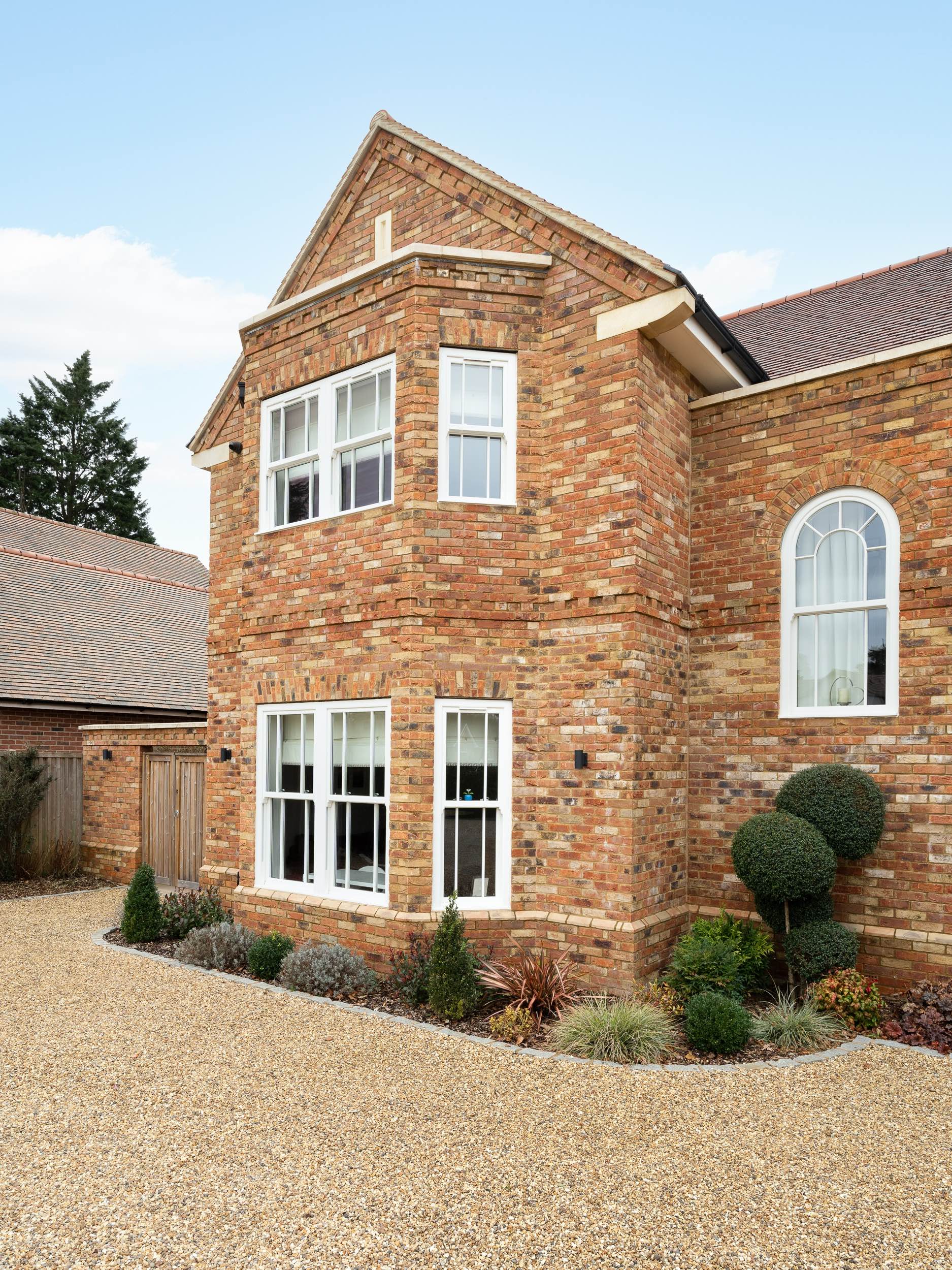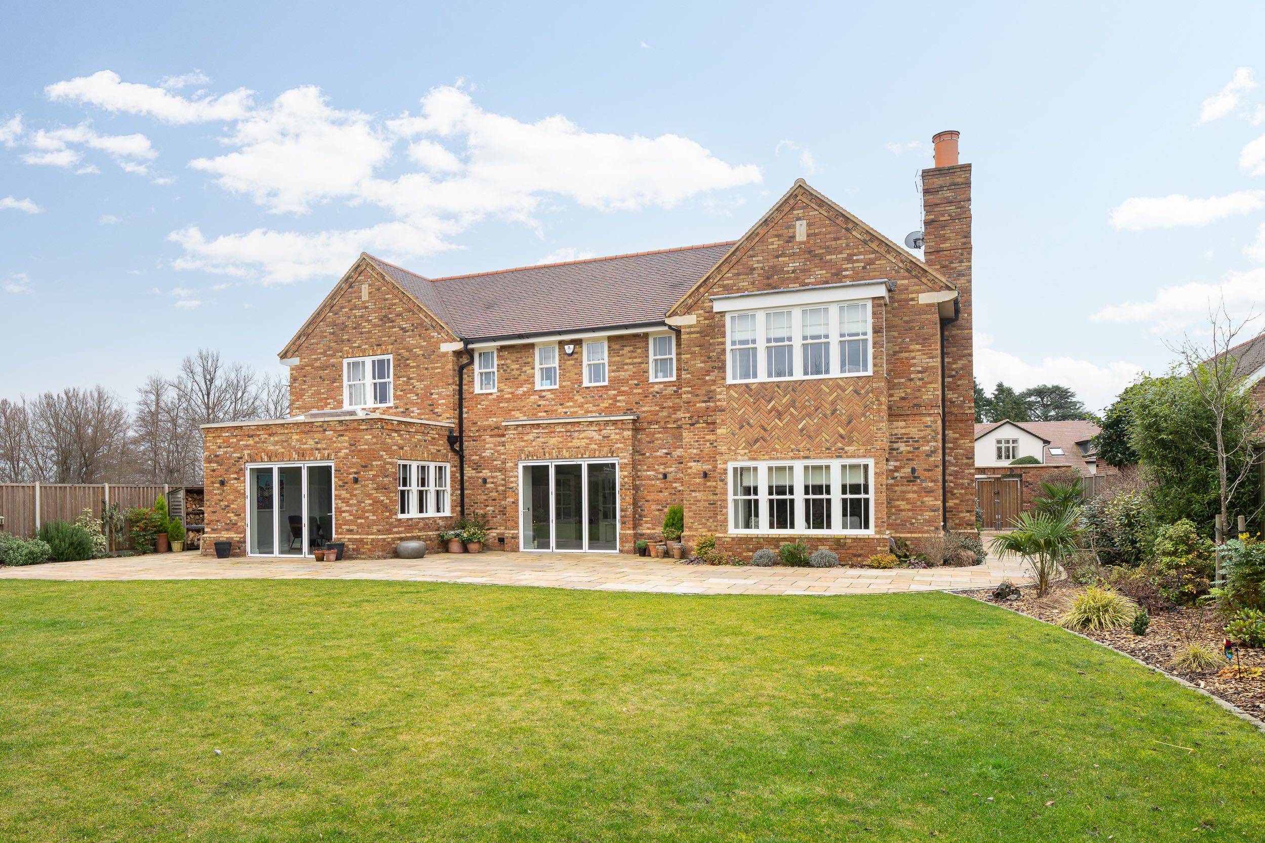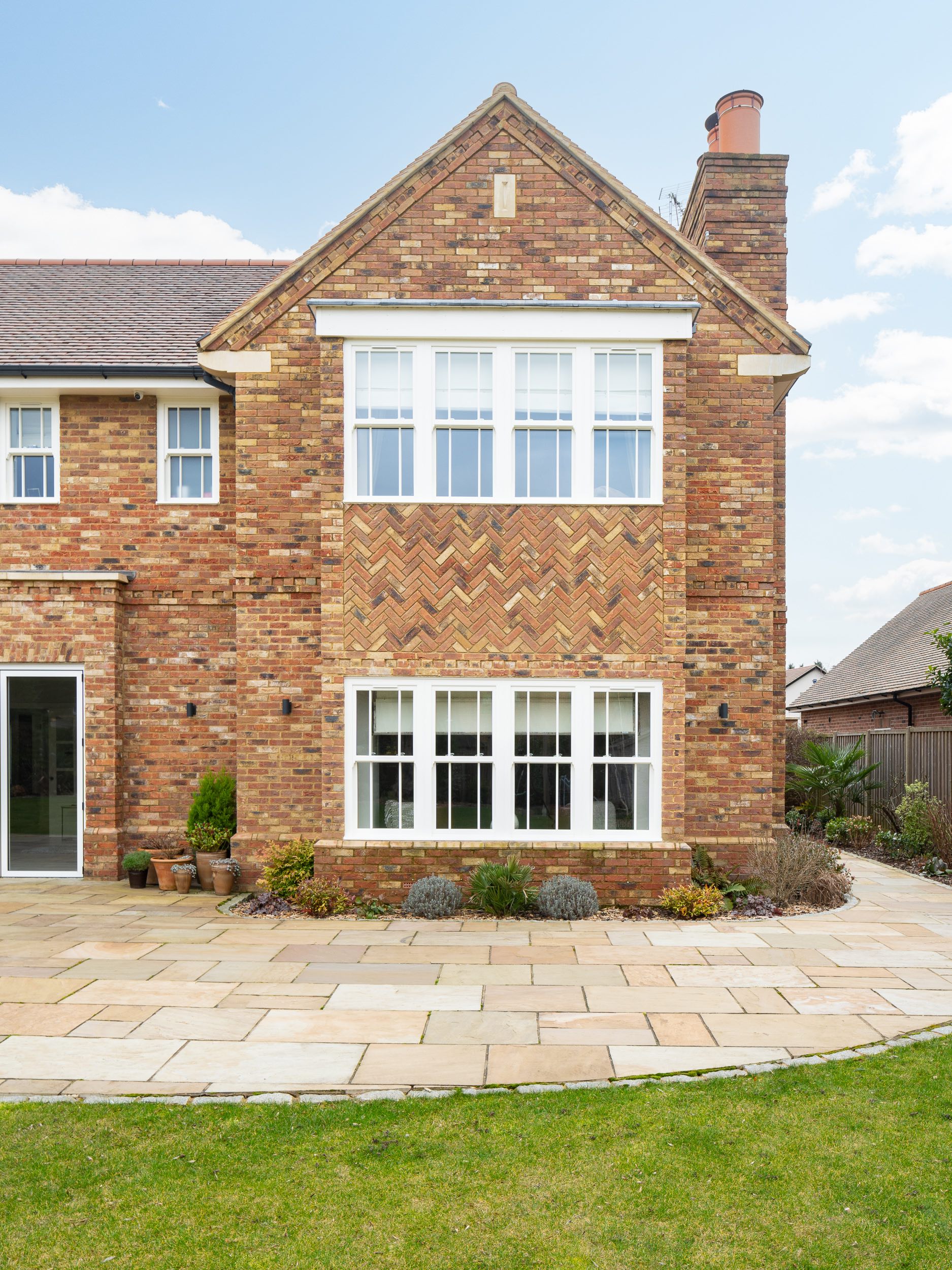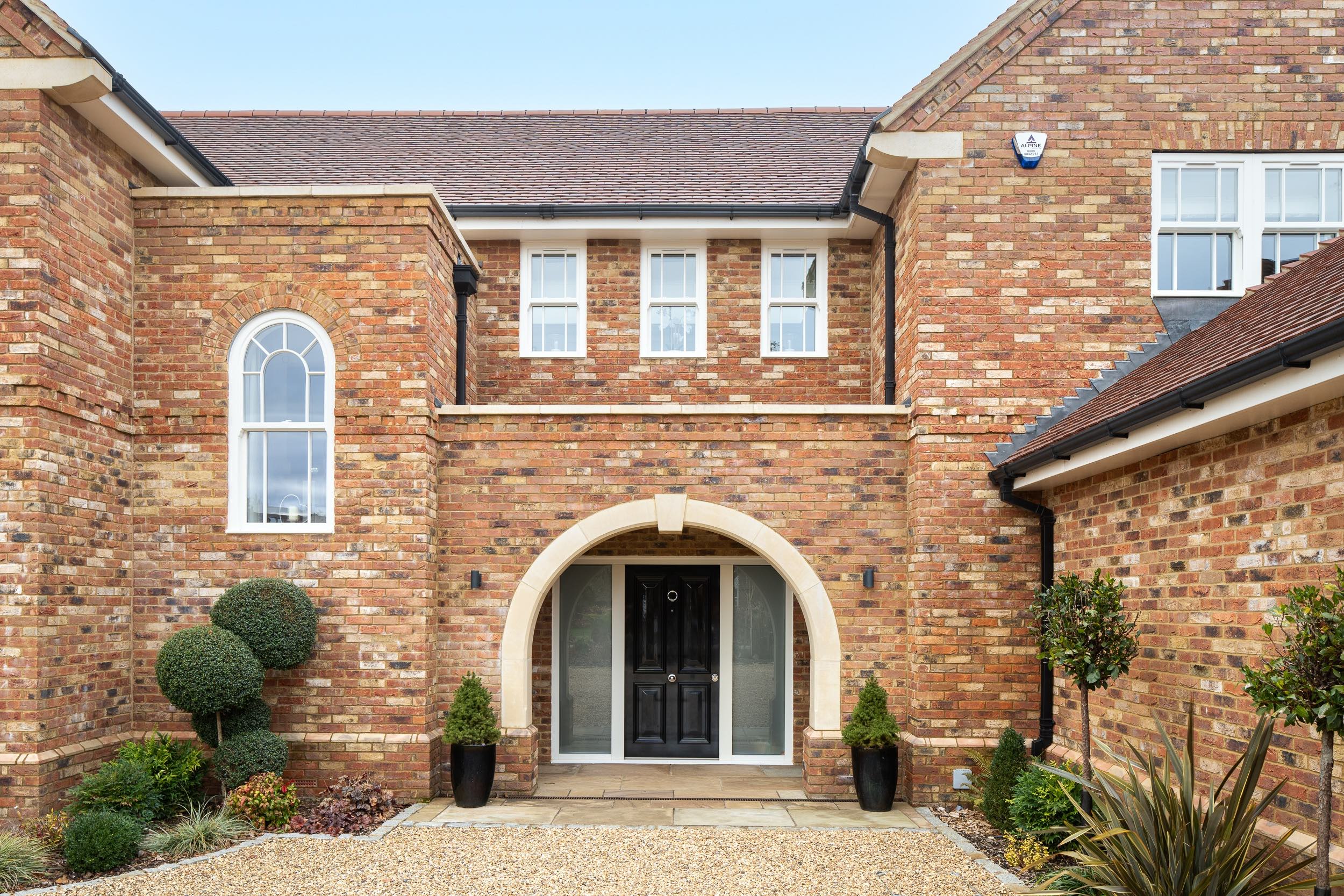 A spectacular new build house in the prestigious West Common area of Harpenden in Hertfordshire. The new build house replaced a smaller dwelling with a spacious five bedroom property with a large double garage. The layout includes an open plan kitchen and dining area and separate formal lounge and family room. The design incorporates the high quality use of brickwork including a brick plinth detail, brick headers and brick dentil courses. A herringbone brickwork panel creates a dramatic feature to the rear bay window. Reconstituted stone has been used the create a large arch to the front entrance door and to the eaves corbels.