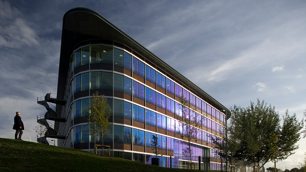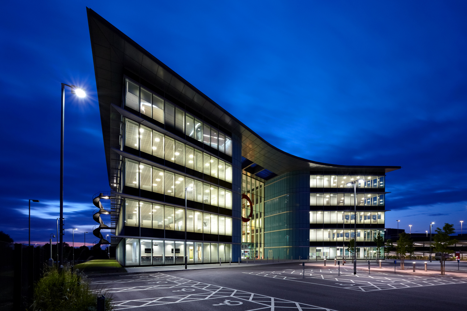 Green Park is a 180 acre business park with access from the A33 off junction 11 of the M4. The site has permission for 2.25m sq ft of predominantly business space divided amongst 14 plots, each with its own access to the Park’s road network. 500 Brook Drive consists of 13,285 sq m (143,000 sq ft) of office accommodation over five storeys. The building has a bold sculpted shape that wraps around a full height central atrium. At ground and first floor, two parallel wings are joined by the entrance hall to a split service core. Three further floors form a ‘U’ shaped single space that wraps around the entrance hall. Cantilevered bridges are the primary means of access from the atrium to the office space at the upper levels which are served by a triple lift core. The entrance is a cube centred within the full height glazed façade, shaded by the oversailing roof and flanked by two opaque glass-clad stair towers. Further staircases form external sculptural features. These are unique in their integral structural support, using an inner string cut from a single steel tube which takes the form of a helix ribbon. Additional bracing is provided in the connecting floor landings which help counter the torsional forces. A BREEAM ‘Excellent’ rating is achieved with displacement floor ventilation and chilled beams which greatly enhance the occupier’s working environment.