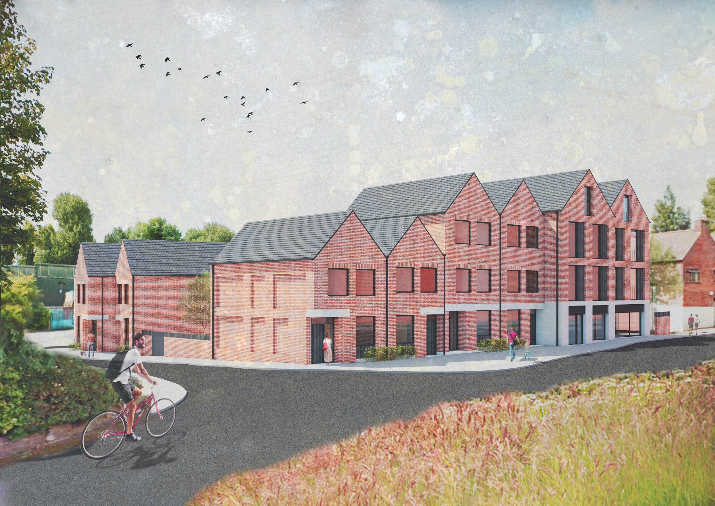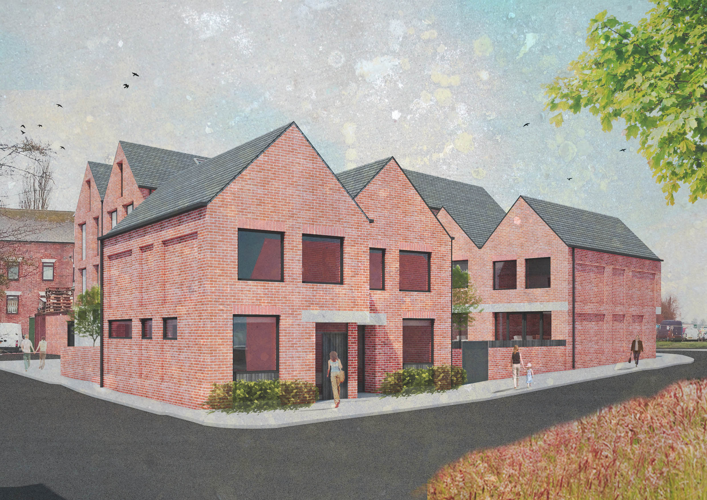 We were commissioned by Catton Homes to design a high quality development acting as a gateway to Harpenden from Lower Luton Road, Batford. The proposed site will compliment not just the historic surrounding context but also the new school buildings opposite. It will replace an ugly and introverted industrial building and enhance this important corner. Modern Mill Site Interpretation The proposal is sympathetic in materials, forms and heights. However the scheme is also contemporary in its detailing and fenestration. An appropriate 21st century interpretation of a mill site. We envisage a larger scale apartment block to the west, with a row of townhouses running along the northern boundary and two more on the south eastern corner. Two small retail units are located under the apartment building, providing active frontage at ground floor. This provides an interesting mixed development, with varying scales of building related to the surrounding context. A Sensitive Stepped Approach We have developed a sensitive massing model that relates sympathetically to the various surrounding buildings and picks up on the vernacular forms present. There are three building types highlighted within the massing - yellow being the two storey houses, green the three storey townhouses and blue the apartment building. Active Street Frontage The apartment building offers a strong street frontage, which gives active retail space at ground floor. This is expressed by a concrete base that relates to the neighbouring mill building. Robust and Simple Detailing We are interested in taking as inspiration from the local context and re-interpreting these elements and materials in a contemporary manner. There are a number of local architectural elements that inspired us for our own new facades such as: pitched roofs, use of red brick and an expressed base to the buildings. Inspired by Industrial Mill Buildings The apartment building has larger openings than the houses, which reflects the scale of the building and is inspired by its industrial neighbour and past. Black timber panels sit next to the fixed glazing and are openable to provide ventilation. The architecture of the apartment building offers a ‘base’, ‘middle’ and ‘top’ as per classical doctrine and makes it a well-balanced facade. The textures of brick and timber work well together and produce an appealing mix of materials that are appropriate to the context. Deep reveals provide contrasting light and shadow and help animate the facade. Greening the site In contrast to the existing site condition of hard surfacing (mainly tarmac and concrete) the proposal seeks to add significant soft landscaping to the site. Generous gardens are at the rear of every townhouse and shared amenity space is included alongside the apartment building. Appropriate Scale and Articulation The scale of the houses along Crabtree Lane are appropriate to the road and how each house is articulated. The traditional garden walls offer privacy and a material consistency around the development. Blind windows offer texture and interest to the otherwise blank flank walls.