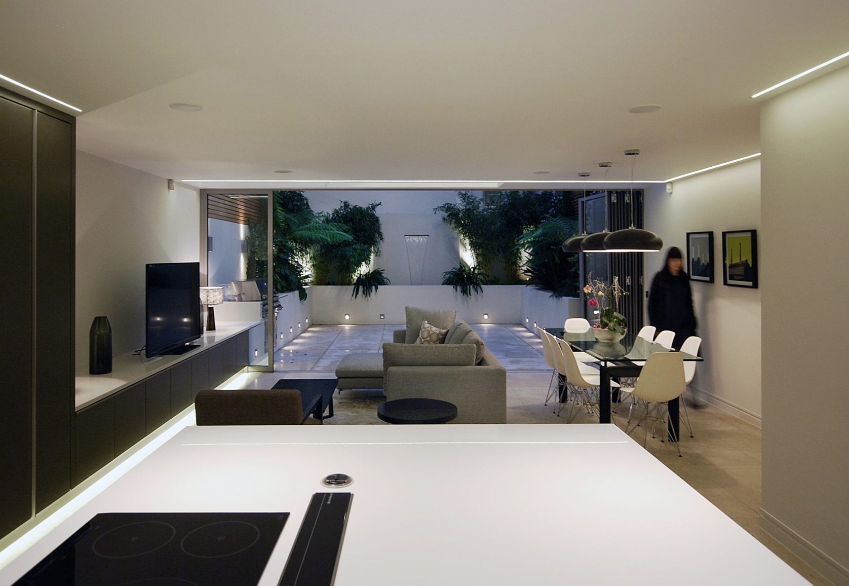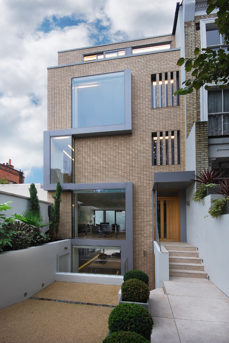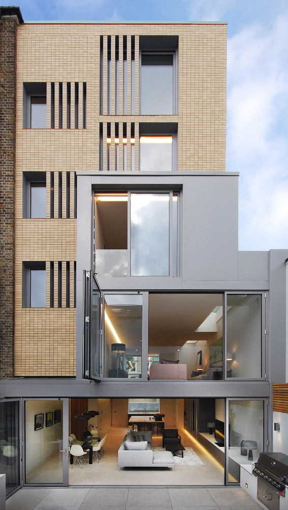 Set amongst the period villas and terraces that surround Holland Park in London's Royal Borough of Kensington and Chelsea the new build family house arranged over five floors with a strongly contemporary appearance has full width folding glazed doors to the lower two floors enabling the living spaces to be opened up to the courtyard garden beyond.