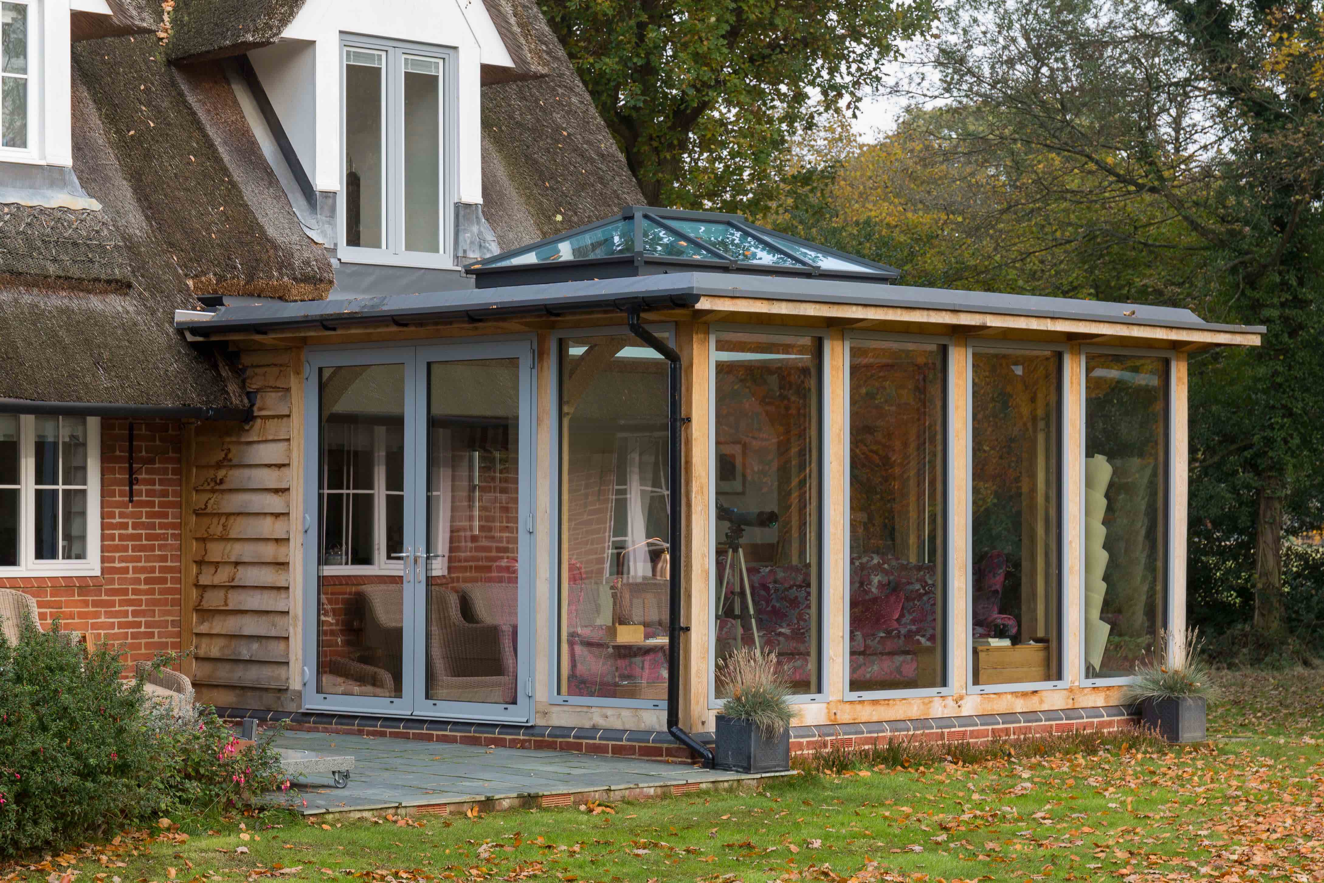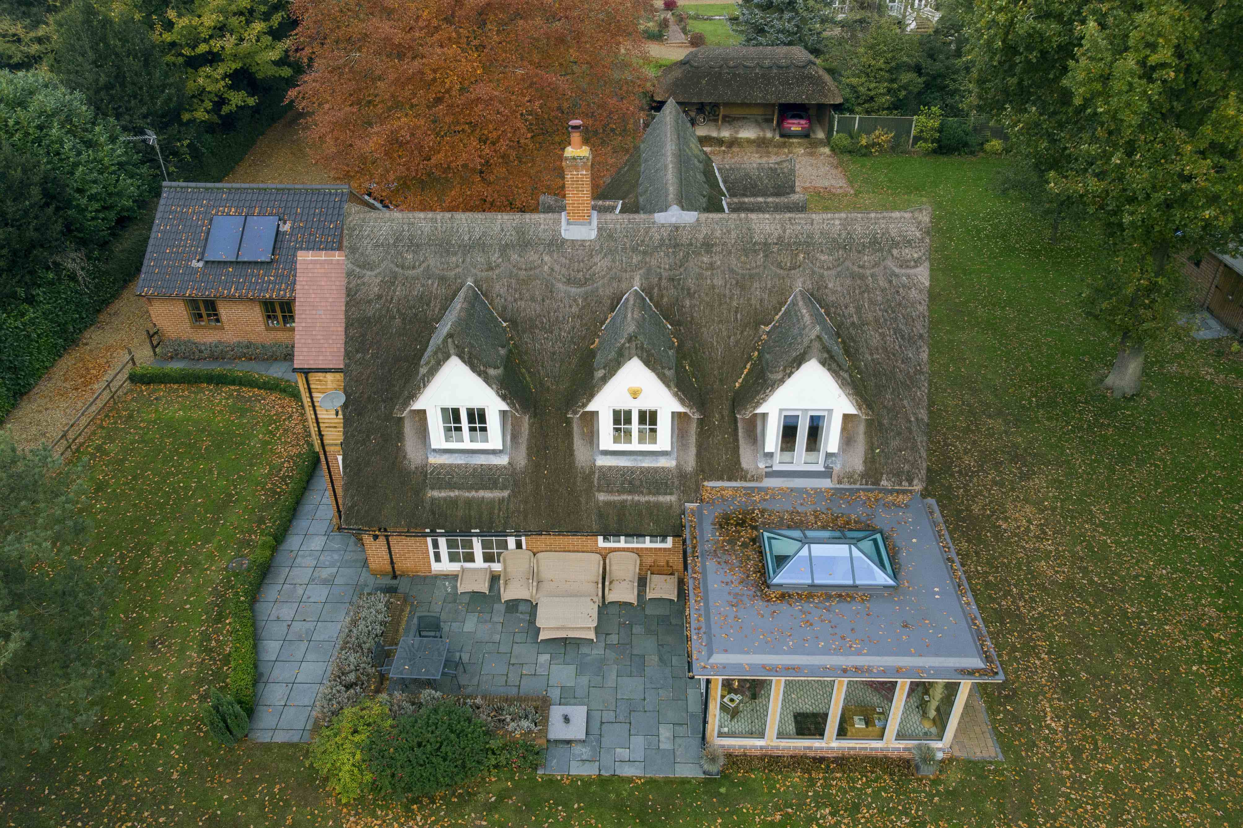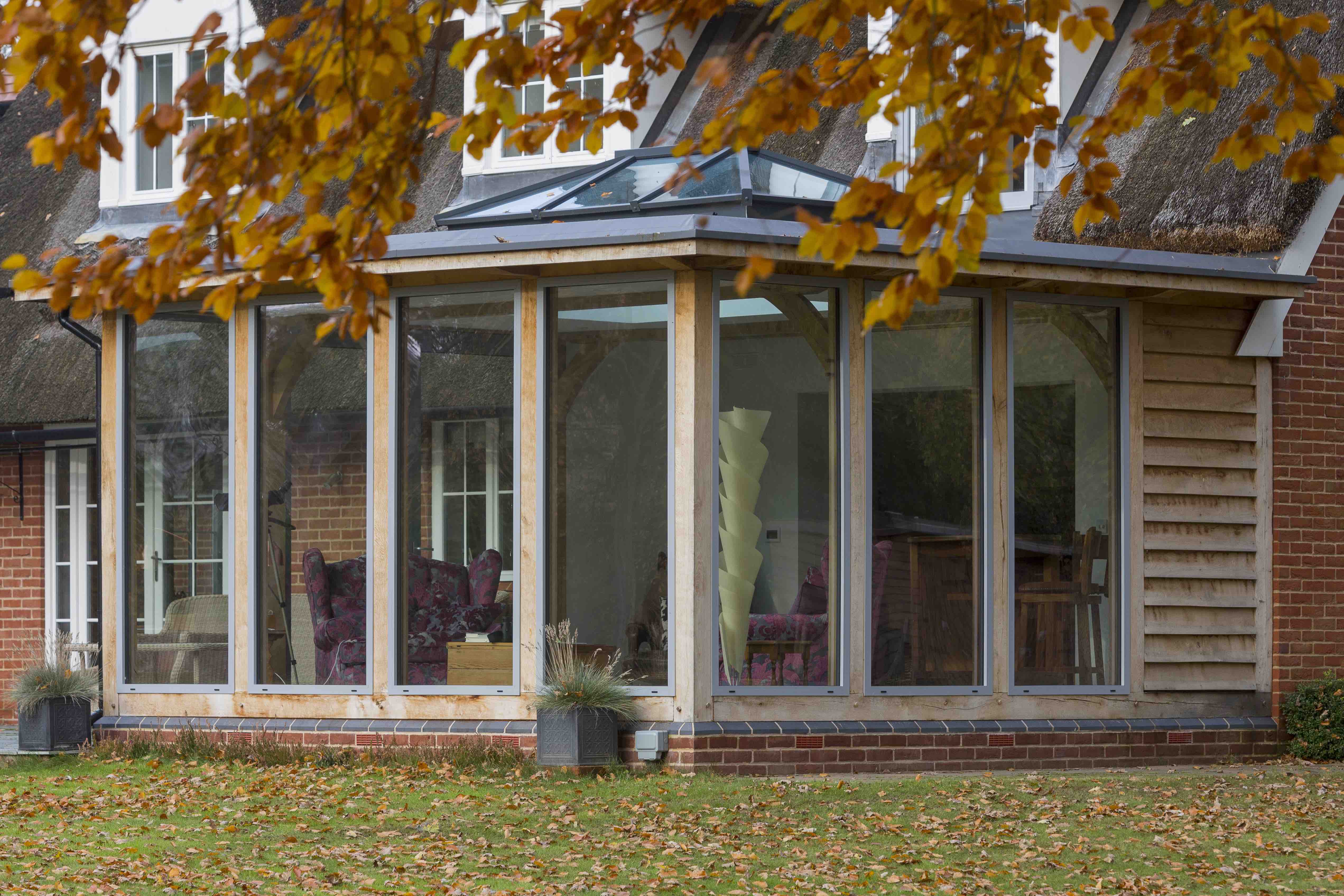 A new rear and side extension. This modern but modest glazed extension compliments the existing property yet creates a more contemporary, light feel. The floor to ceiling glazed timber windows allow views into the clients garden in the beautiful Norfolk countryside and incorporate the natural elements of its surroundings.