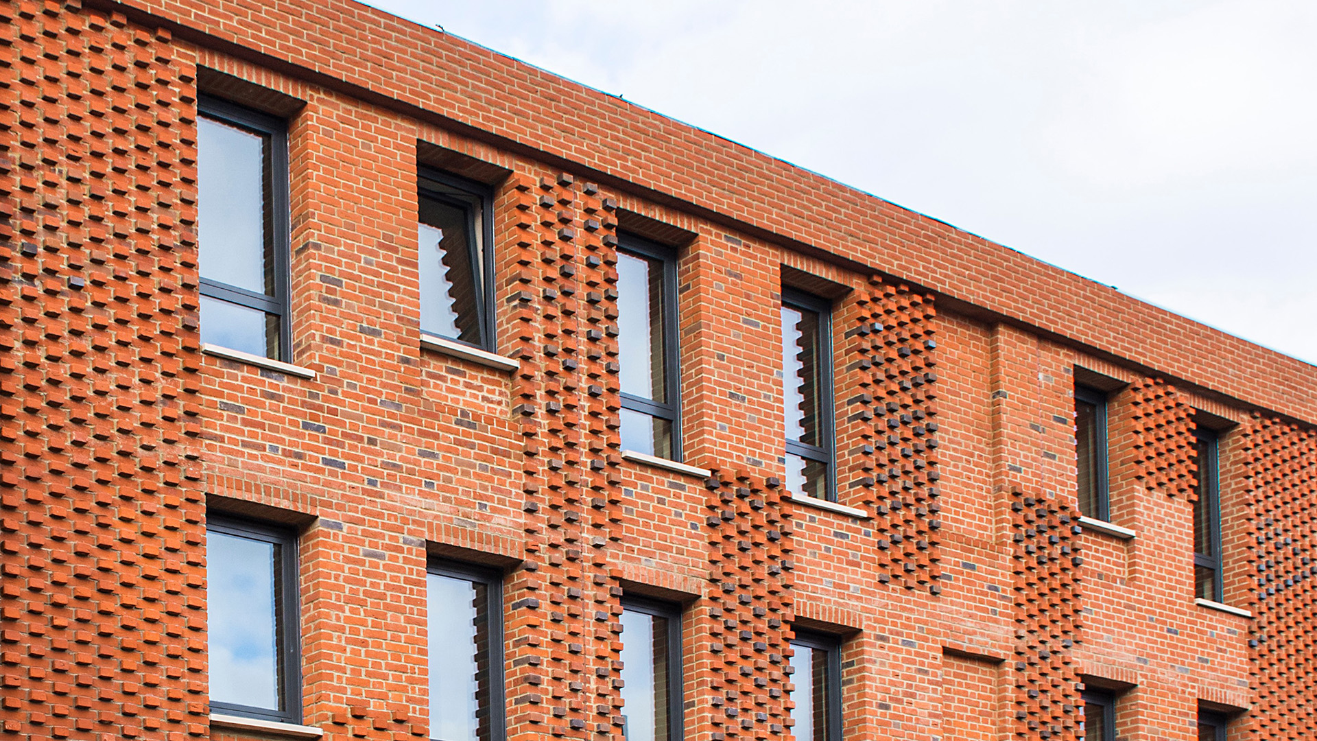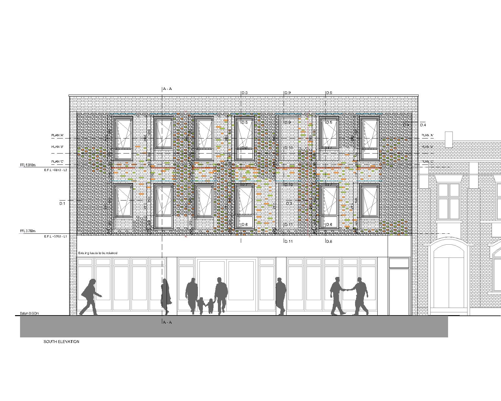 The transformation of a 1970s office into residential apartments. The design included the transformation of open plan office floors into flats (4 per floor). Existing patent glazing was replaced with an expressive brick façade. The design reinterpreted the rhythm and proportions of a neighbouring grade 2 listed building. Three brick types were used to mediate between the colours and materials of the historic building and the office block. Organic patterns balance the formal composition of the façade with a sense of playfulness. We worked collaboratively with the conservation officer to agree design principles before developing the final proposals.