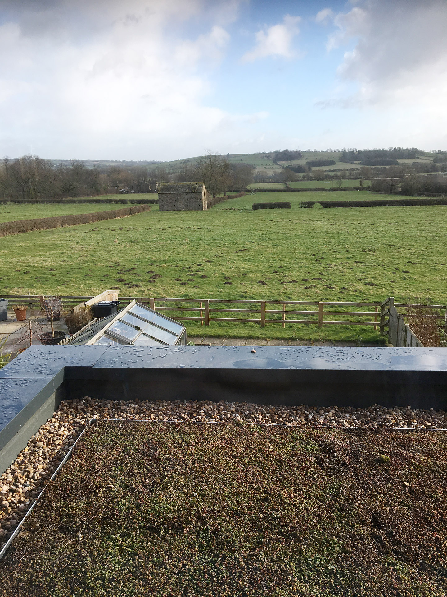 In order to take advantage of the dramatic views across the Wharfe Valley, we were asked to extend the rear of this 1960s terrace to form an extended kitchen and separate snug. The extension includes an integrated herb planter so the client can reach out of their kitchen window to get the necessary ingredients. The extension is clad in larch and has a green roof.