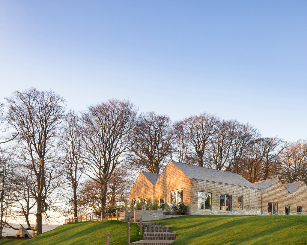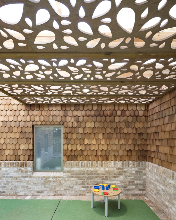 Kingswood School, Bath, commissioned Stonewood Design to lead the design and construction of new accommodation for the Preparatory School. The School proposed two new buildings on a site to the north of the existing Preparatory School: Firstly a New Prep School Building re-accommodates facilities in a fit-for-purpose new building. This includes classrooms for Years 5 and 6, Music, Art, “STEAM” facilities and a new School Hall. Secondly the School also wished to address the demand for Pre-Prep and Nursery by constructing a new building, specifically for this use, alongside new reception classes which will smooth the process to starting Preparatory School. Stonewood Design worked closely with the school to develop a innovative brief that built upon the schools current ethos whilst challenging the client to create a building that would allow for more exciting and progressive learning. Key Design Concepts include: • Classrooms and nursery spaces to have direct access to the outside. • Inside-Outside Spaces. • Kinaesthetic Learning. • Forest School. • A scale appropriate to children. • A facility capable of bringing everyone together “As a Family”, students, teachers and parents • Ecology. A Magical Woodland Setting. • A scheme which embraces topography, views • and landscape. • Awareness of the changing day and seasons. • Creative solutions to storage. • Quality of materials. • A creative curriculum. The site is bound by mature trees which enclose a rolling topography of grassed areas, stepped woodland dells and play areas. Views outward to the south and west across the valley are a feature. The site therefore required a particular response, appropriate to its setting. The appearance of the New Prep School Building and Nursery was important in terms of how the school relates to the World Heritage City, and in terms of how the buildings are enjoyed and loved by the children who use them. The built volumes take the form of a collection of pitched and hipped roofs. This “normalises” the buildings to something which is familiar and not institutional. The buildings are constructed from large cross laminated timber panels. This is a quick, clean, quiet and panellised form of construction, appropriate to a learning environment. This provides an opportunity to use a material with a low embodied energy. Exposing the timber internally creates a sense of calm, which, when combined with the excellent quality of daylight and sunlight, helps lower stress levels and lift the spirits for the children and the teachers. The external materials comprise of Western Red Cedar shingles to roofs and walls, (a woodland response, with a scale that children can relate to), and a tactile brick which has the tones of Bath stone, (a “crafted” material which relates to materials found in the wider school site).