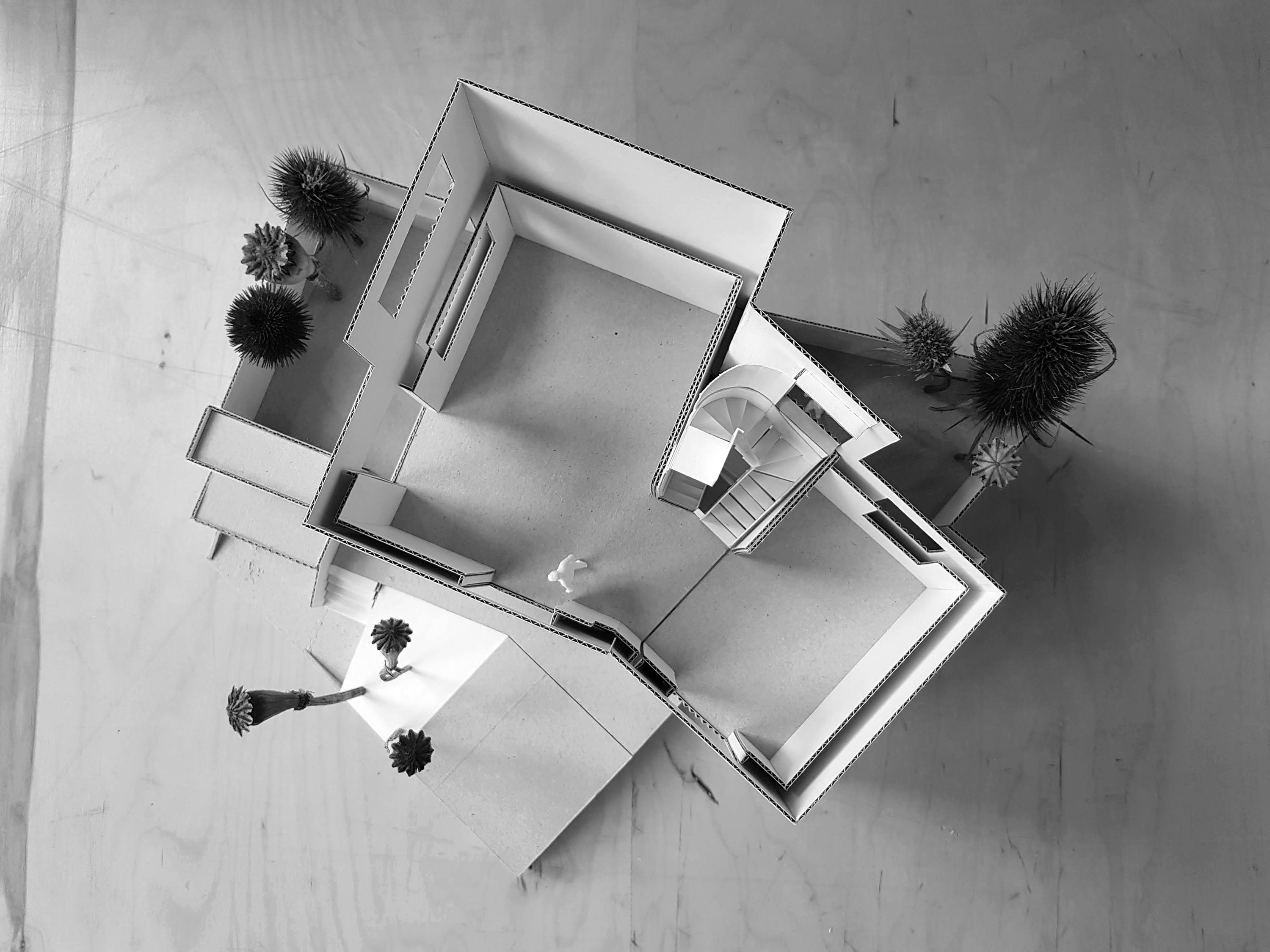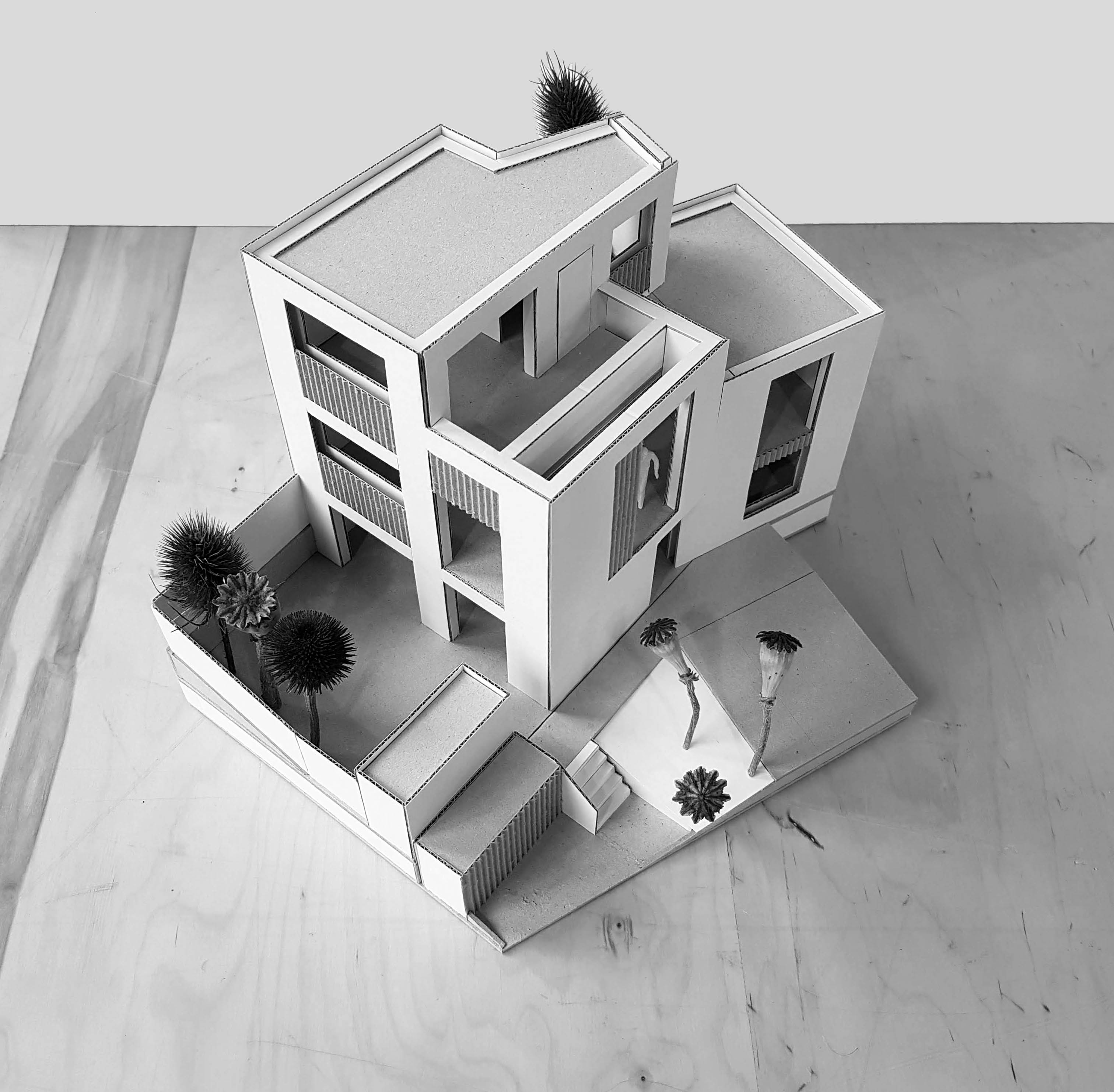 This self-build house in South London has been designed to make the most of a challenging infill plot. The building is set into a sloping site and the stepped massing aligns to the eaves and ridge heights of the adjacent houses. The scheme was granted planning approval at committee in February 2021. Although the building form is distinctly modern, we have used familiar materials that respond to the area’s suburban character. Panels of decorative brickwork in a vertical bond add depth and interest to the facades. Their proportions and alignment with windows and doors has been carefully considered and tested with drawings and physical models. We are currently developing the detailed and interior design of the house in collaboration with our graphic designer client.