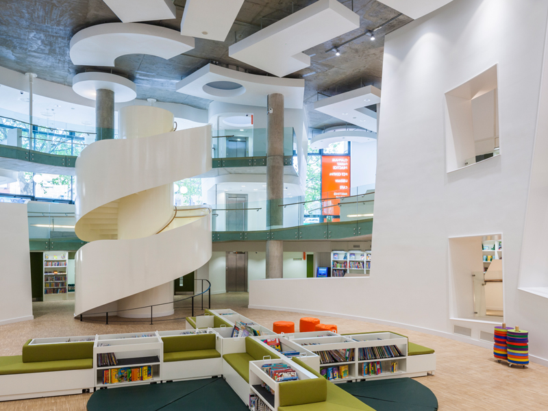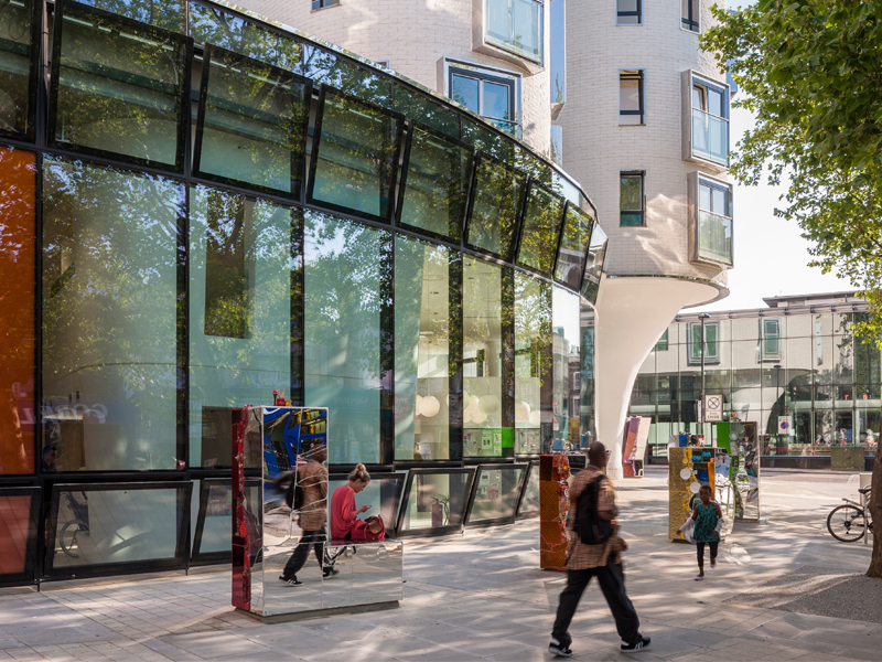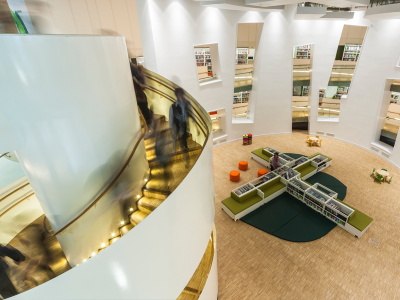 The Library Building, Clapham is a mixed use new build scheme including 136 apartments, a 15 doctor health centre and a new public library. It is the result of a Public Private Partnership between London Borough of Lambeth and Cathedral Group. The 12 storey building is formed by a series of curved, white stone volumes which are articulated to break down the overall mass and soften their visual impact on the high street whilst providing an important marker for the community services within the building. The library is designed as a seamless curve of learning. Itself a mix of community uses (library, IT facilities, cafe, one stop shop, performance space, and venue for meetings and events), the space is laid out on a continuous spiral over three storeys with the books acting as the outer wall. The inner drum has similar proportions to Shakespeare’s Globe and is designed to be a completely flexible space capable of transformation from children’s library to conference or theatre use. The health centre is organised around a series of courtyard gardens that allow all consultation and treatment rooms a view of nature and a breath of fresh air. The homes are laid out so that each apartment has a curved living space with square bedrooms. This allows all homes to benefit from 180 degree views and other benefits of being dual aspect. There are two communal terraces for use by all on the 7th and 8th floors which provides much needed larger amenity space on this urban site.