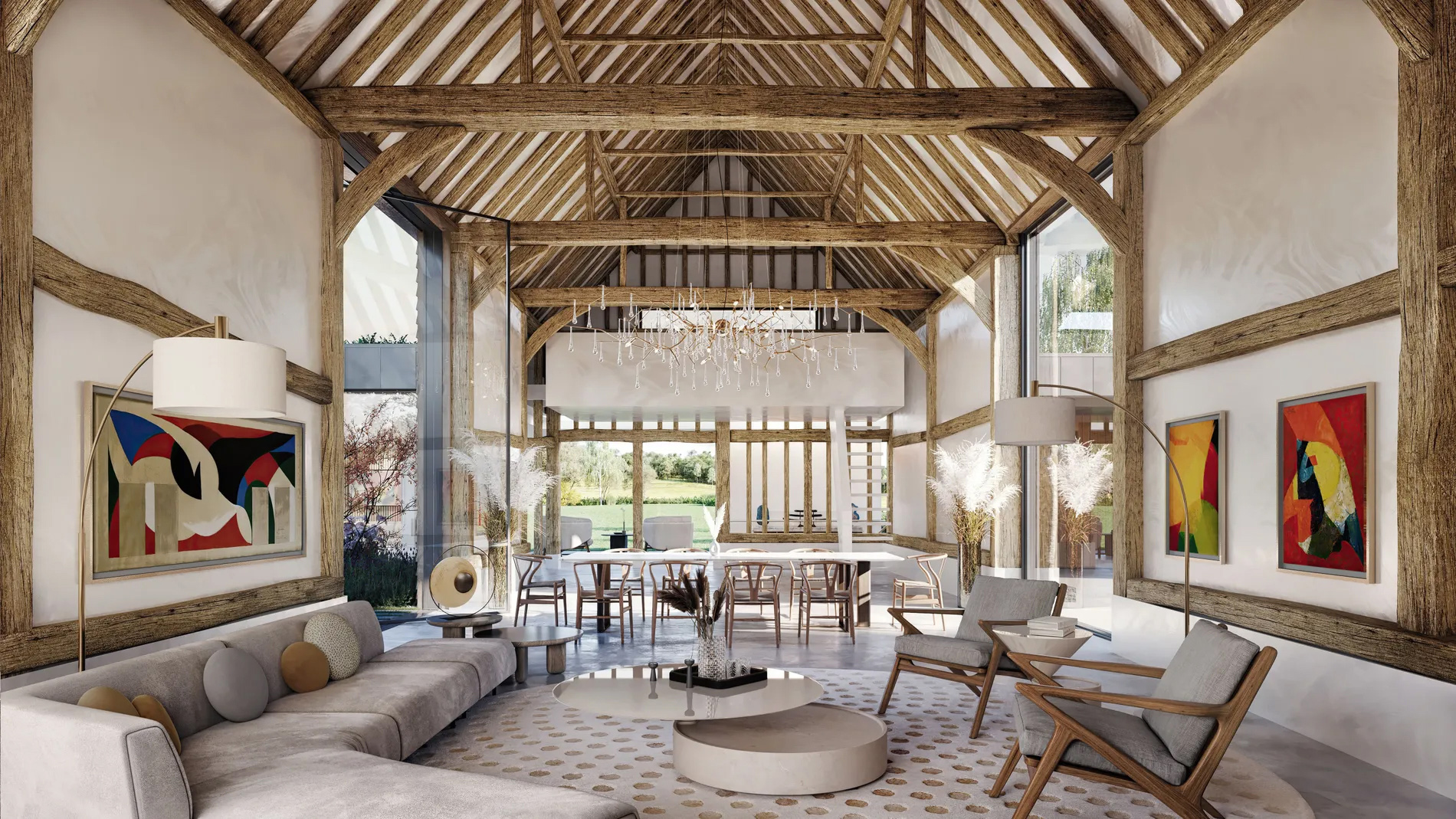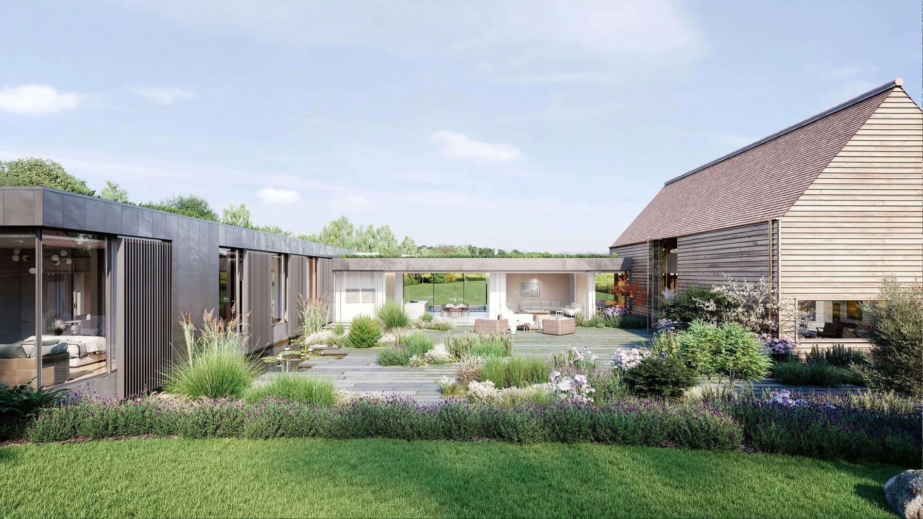 A 970 sqm new build contemporary house in the Surrey Green Belt. The site is currently occupied by a Grade II Listed barn that will be restored and integrated into the new house as formal entertaining areas. Predominantly single storey, underneath the kitchen and living area there is a 25m lap pool, gym, sauna and workshop.
