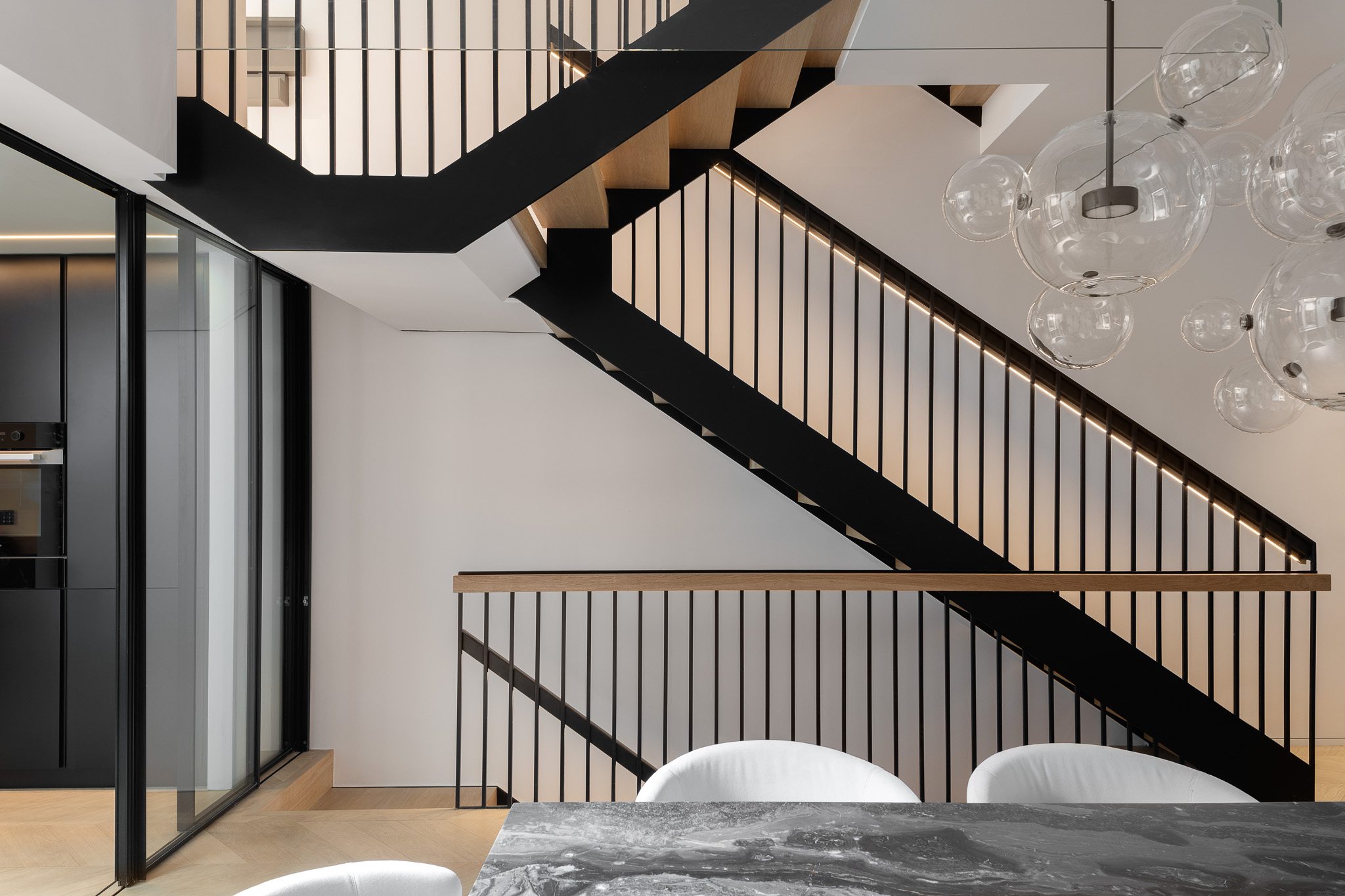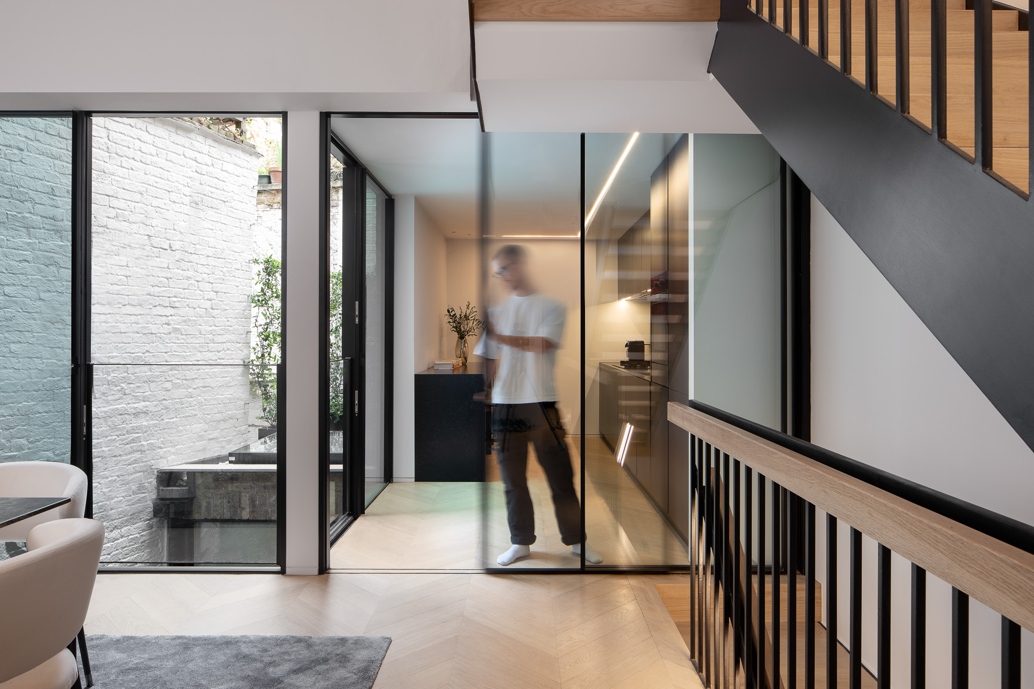 Studio Rinaldi oversaw the architectural renovation and full internal reconfiguration of a traditional London town house, transforming two separate dwellings into a unified family home. The project included a new rear extension, a bespoke staircase connecting all levels, and comprehensive updates to the layout, lighting, finishes, and joinery. Balancing heritage with contemporary design, refined materials and detailing create bright, harmonious spaces that reflect both character and modern elegance.