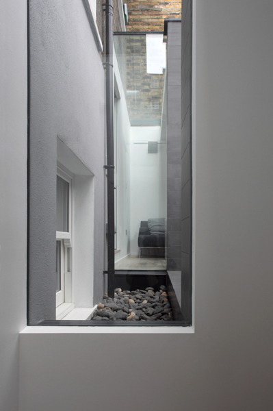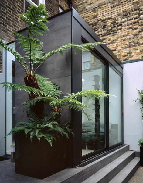 This renovation required the gutting of the entire Chelsea town cottage to suit the needs of a family of four. The challenge lay in converting the small, cloistered rooms into bright, spacious areas. We modified the existing rear extensions, following the original footprint of the house, allowing us to create a TV room and a studio/office. These modern additions are connected through an open patio area. Roof skylights, fixed glass panels and glass sliding doors were added to bring light to the spaces and give a sense of openness. The open-plan kitchen and dining room occupy the basement floor, the living room is on the ground floor and the bedrooms and bathrooms are on the floors above. We added a new staircase with a glass balustrade. The custom made cabinetry and storage areas were carefully designed for this particular space. A ‘Smart House’ system allows the client to remotely control the lighting, audio-video systems, thermostat and phone system through a central unit and touch screens in each room.