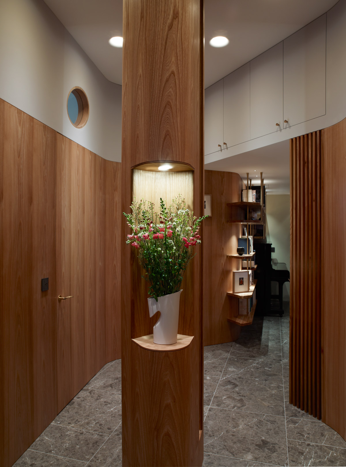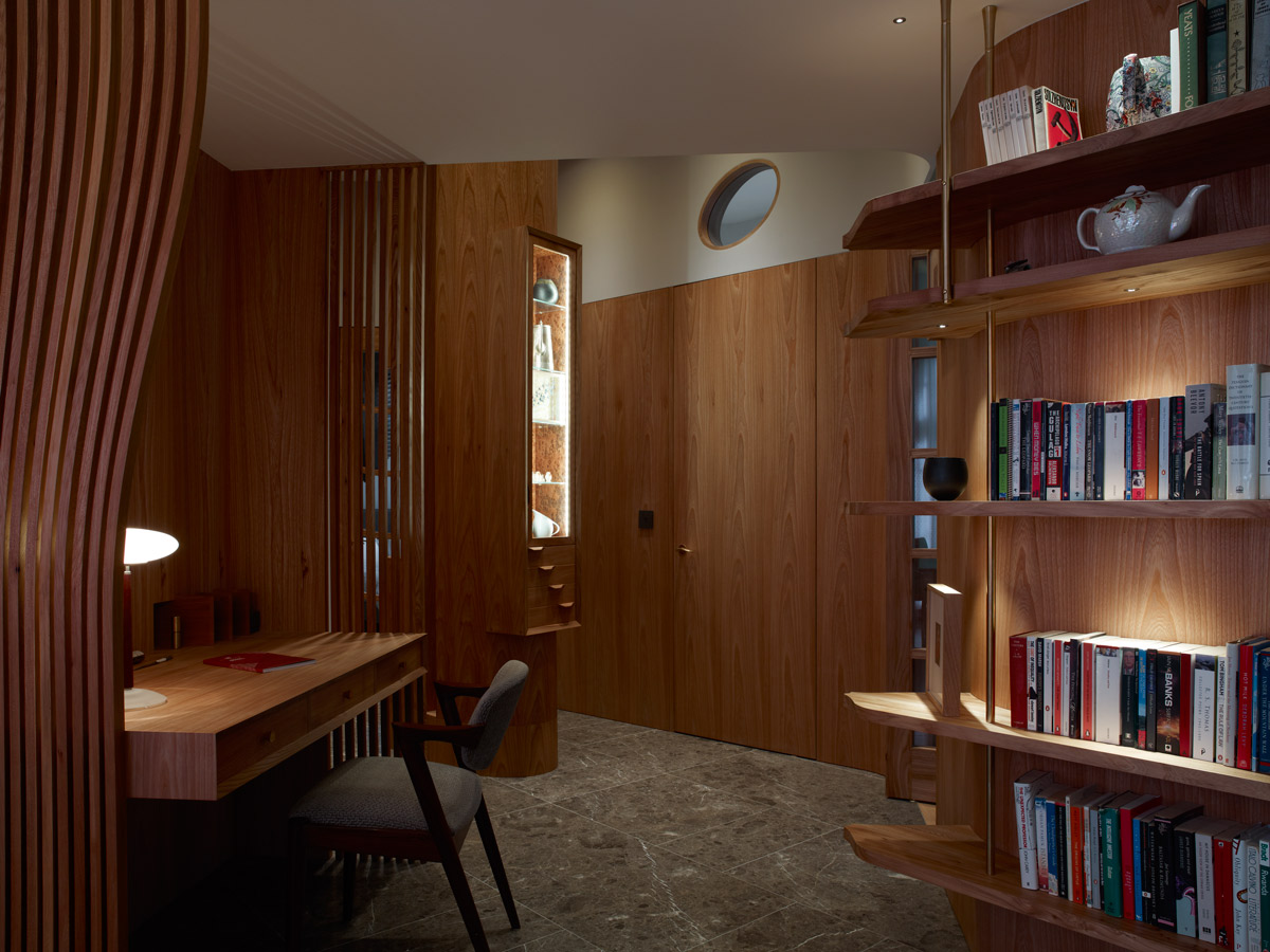 Studio Sanshea worked in collaboration with Canadian based designer Bricault Design to deliver a high quality refurbishment of an existing ground floor flat within a residential multi-unit development in an important Grade II listed building designed Sir Giles Gilbert Scott. The predominant feature of the new construction consists of exquisitely detailed joinery integrated within new and existing walls. The team worked closely with an English based joinery/furniture firm based in Devon who manufactured and installed all the joinery elements, from display and shelving units, desk, benches and wardrobes to kitchen and storage units and doors. With keen attention to detailing, the client and team alike took much patience and pleasure to enable the creation of these finely crafted timber elements.