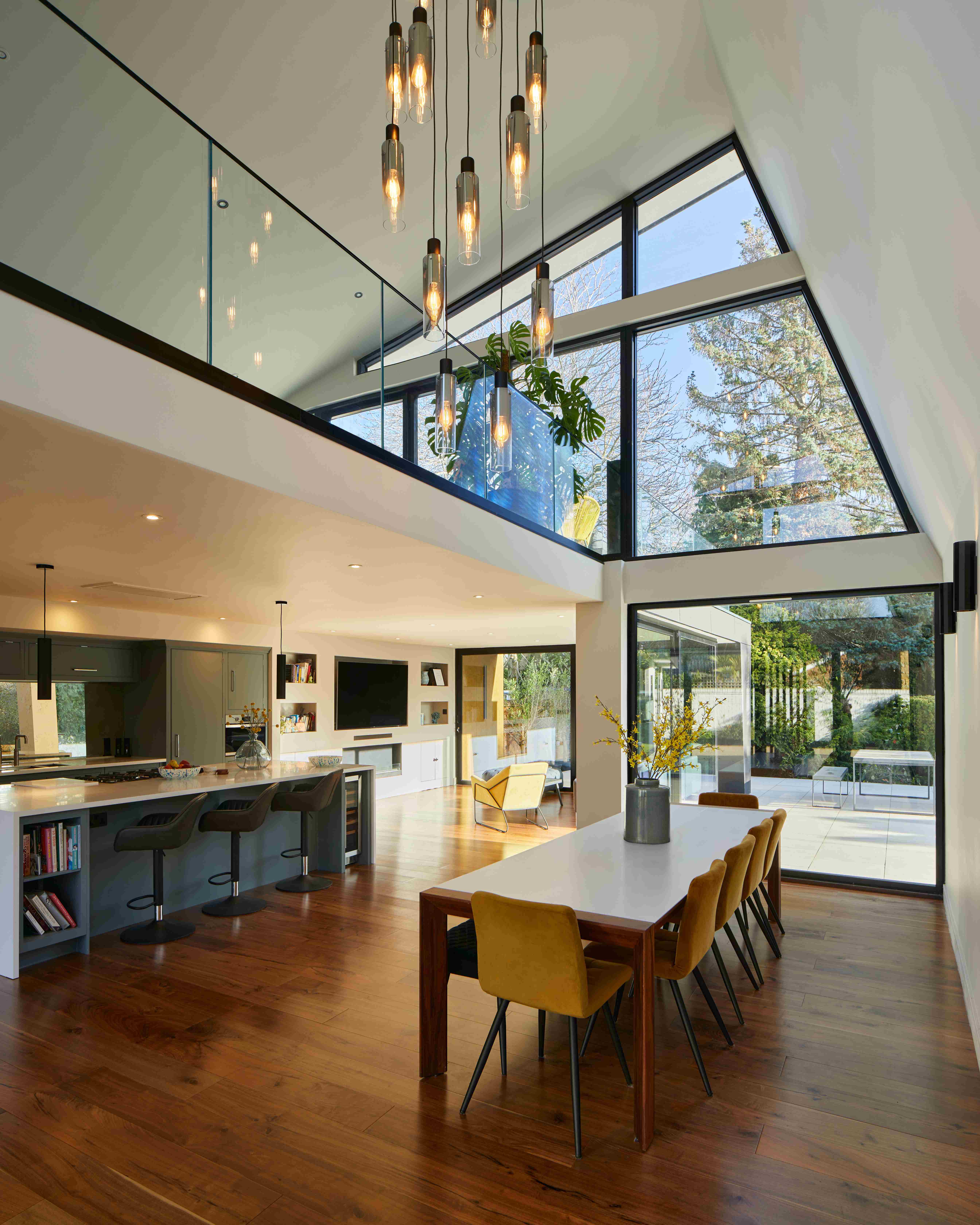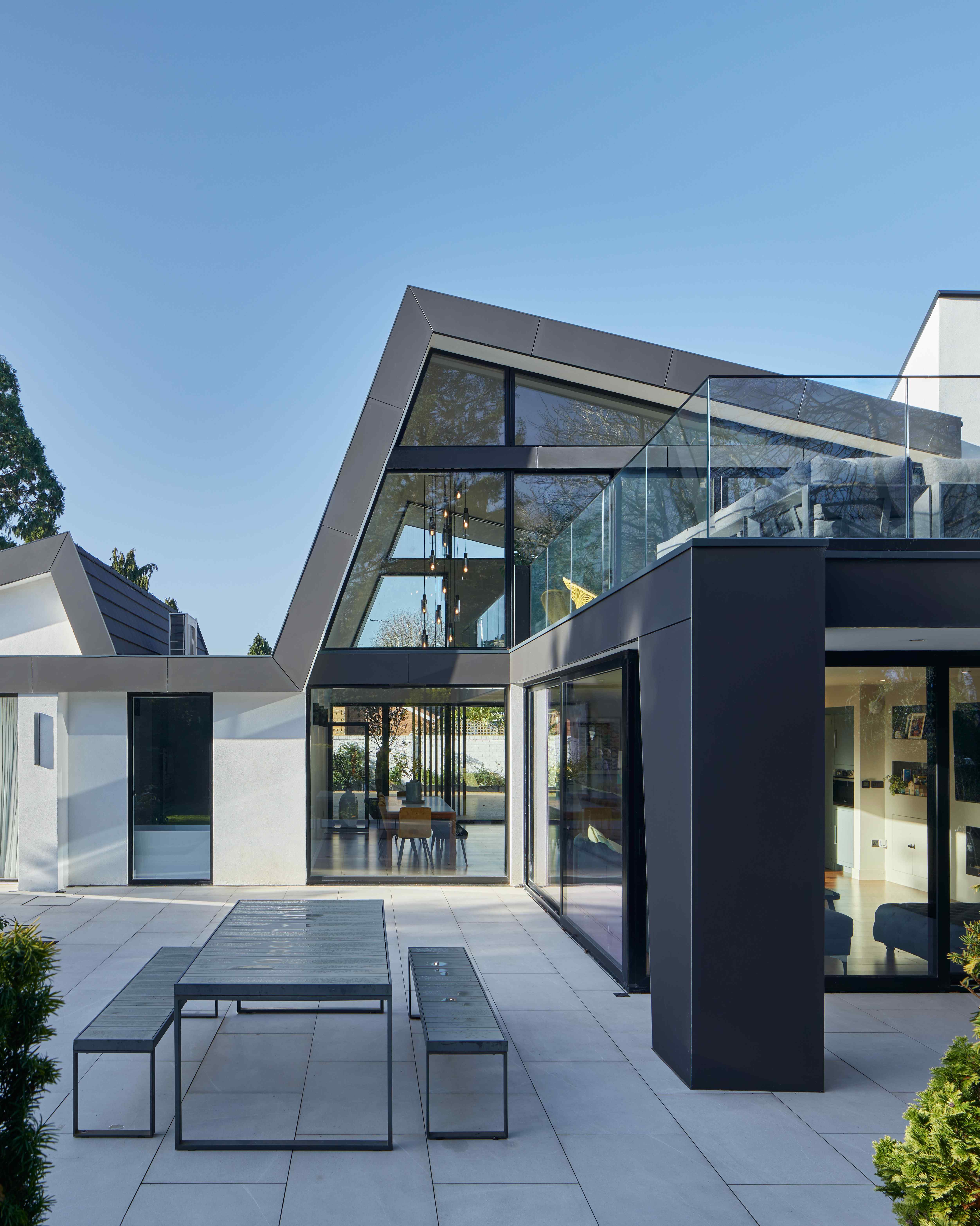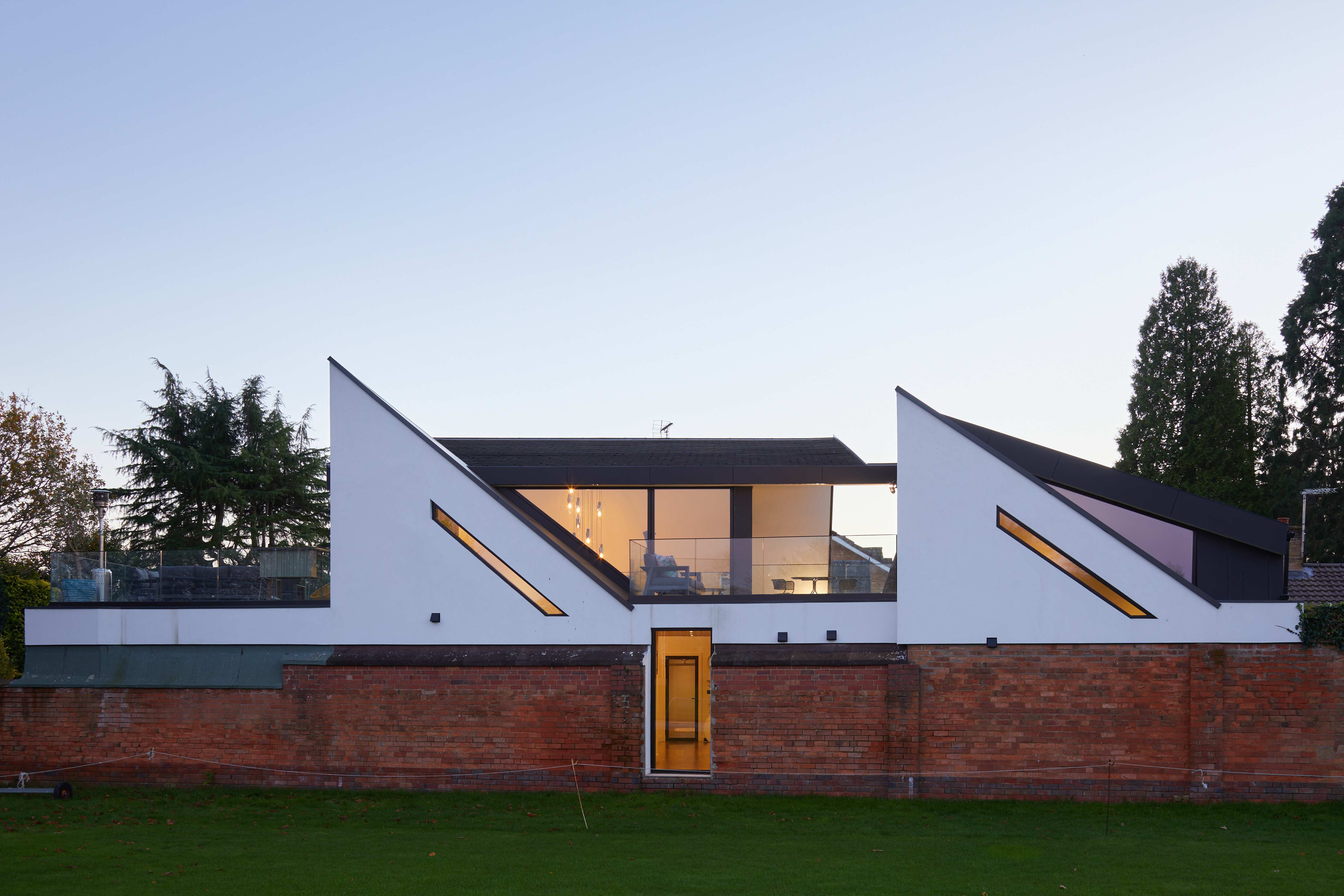 Sandal Rise is a reconfiguration and roof extension of a 1970s bungalow in Solihull, transforming an inward-looking house into a contemporary family home overlooking an adjacent cricket ground. Studiogotz provided architectural services from concept design through planning permission, technical design and construction stage support. The project reinterprets the bungalow’s distinctive mirrored roof geometry, lifting key living spaces to first floor level to capture long views while maintaining privacy. A double-height social space and elevated terraces strengthen connections to landscape and sky. The roofscape becomes the organising architectural device, aligning structure, section and light to redefine the home’s relationship to its setting.