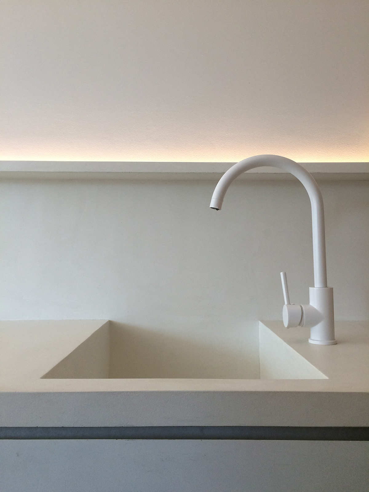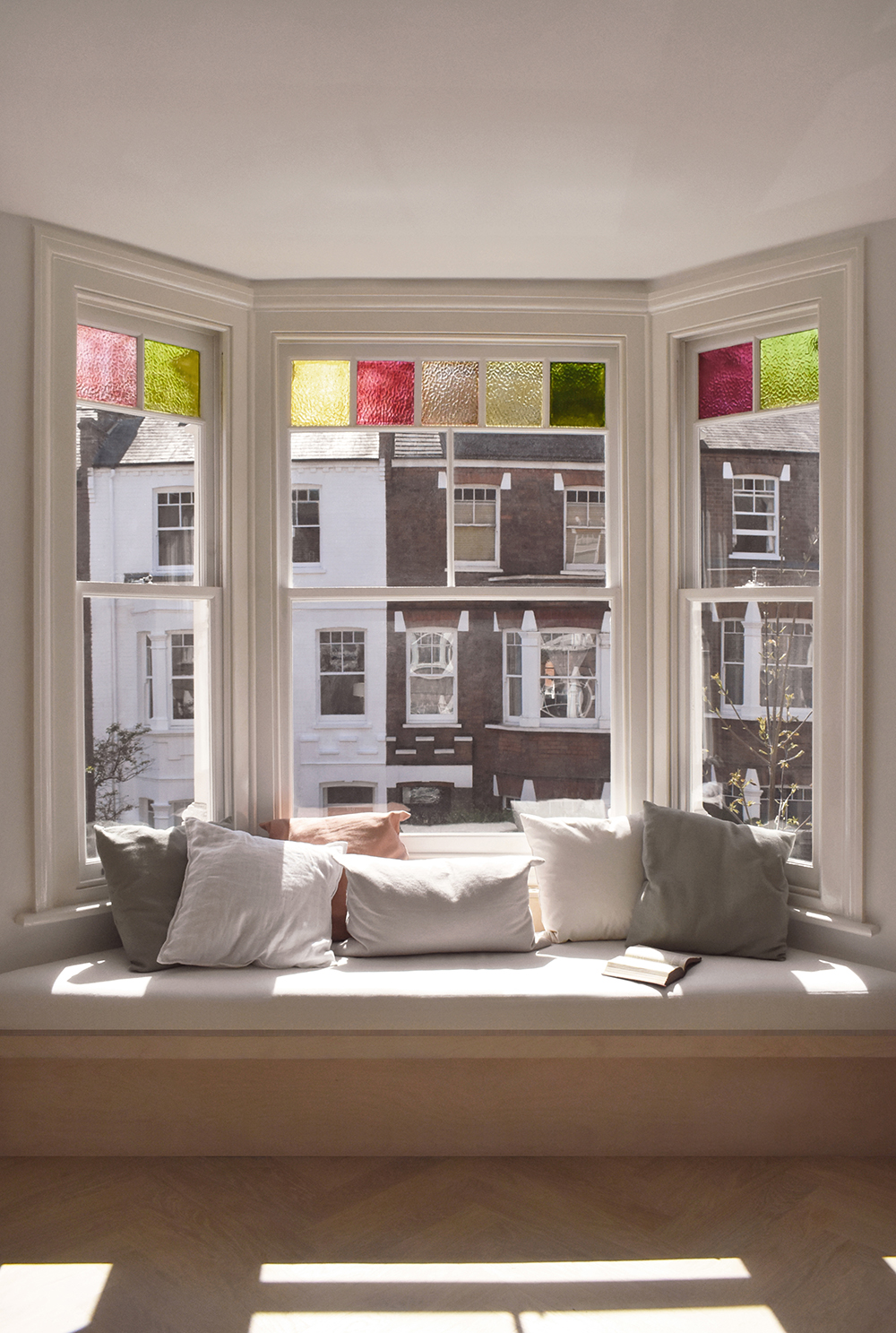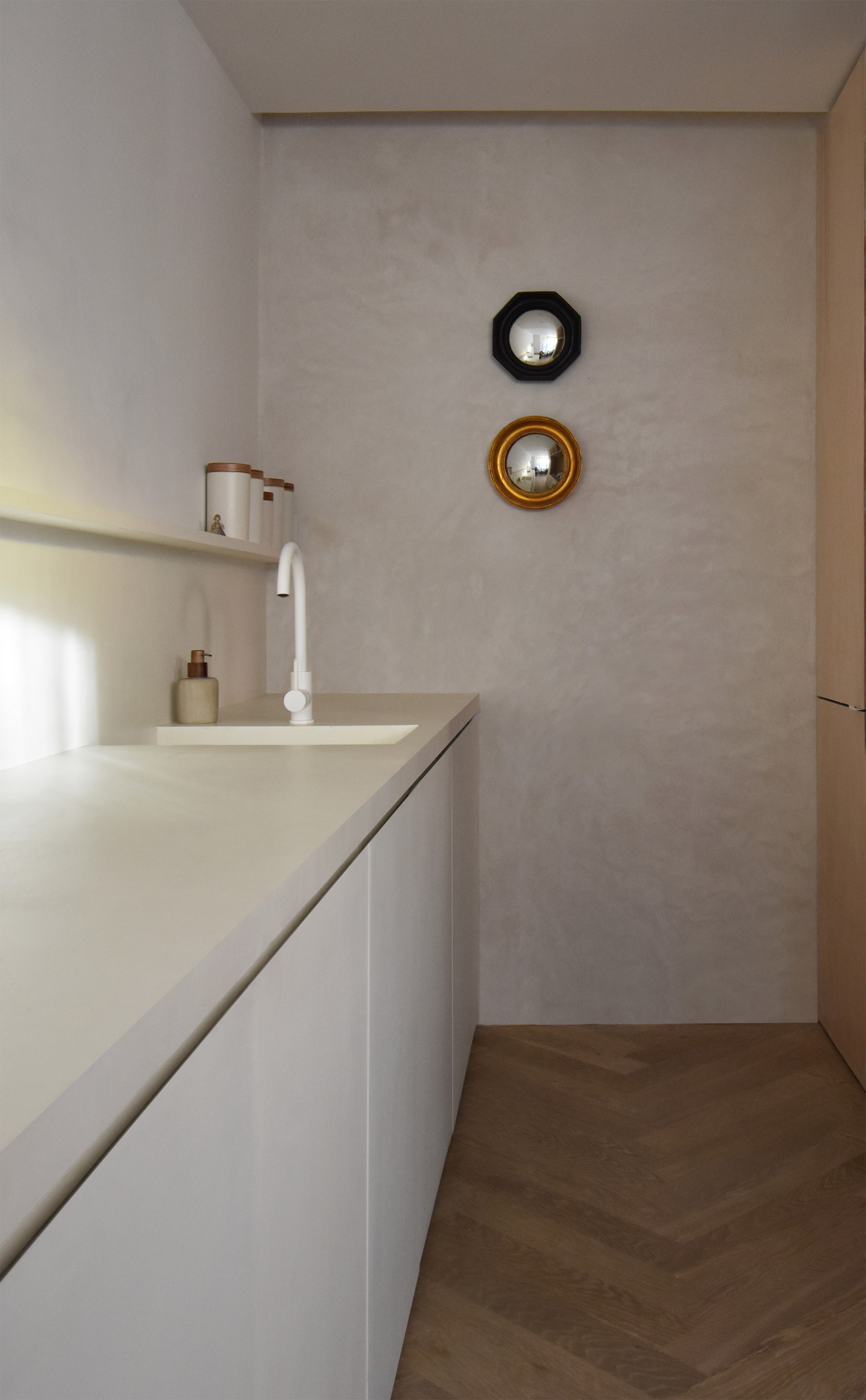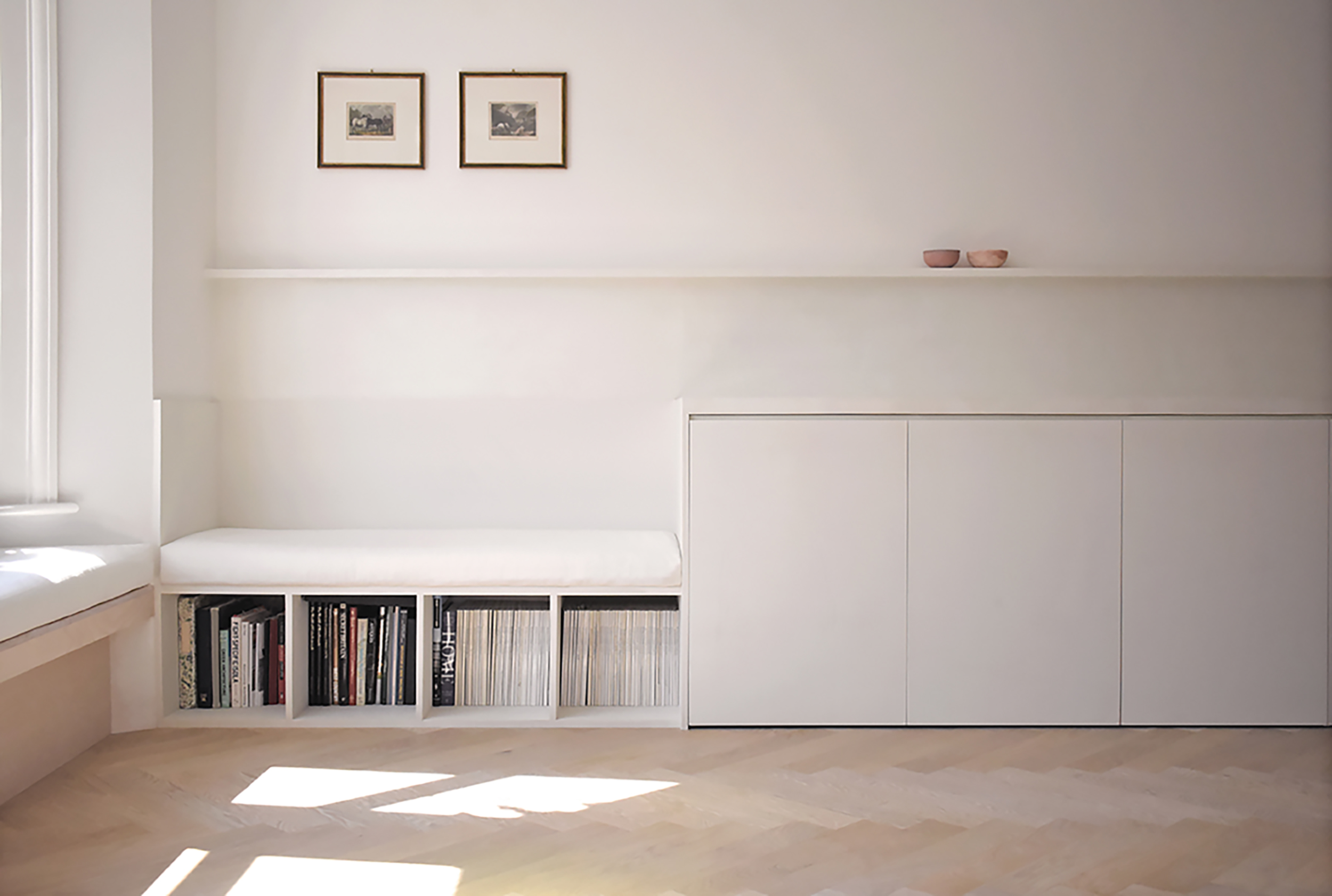 The apartment overlooks Parliament Hill and the red brick facades of the beautiful streets of Hampstead, north London. Our interiors feature a muted palette of matte and glossy off-whites, alongside light-coloured wooden surfaces, like herringbone floors in thick, white-oiled solid oak, and bespoke furniture in white-varnished Siberian birch plywood and pine. This toned-down canvas ‘invites’ the terracotta and green of the surroundings into the flat and frames it through its restored windows. Throughout the day, the abundant light filtered through the stained glass panes paints red, olive green and ochre pictures onto the white walls of the south-facing living room and kitchen. The theme of colour against a neutral background is carried through by carefully chosen and placed objects, whose different textures, colours and finishes bring depth and variety to the rooms.