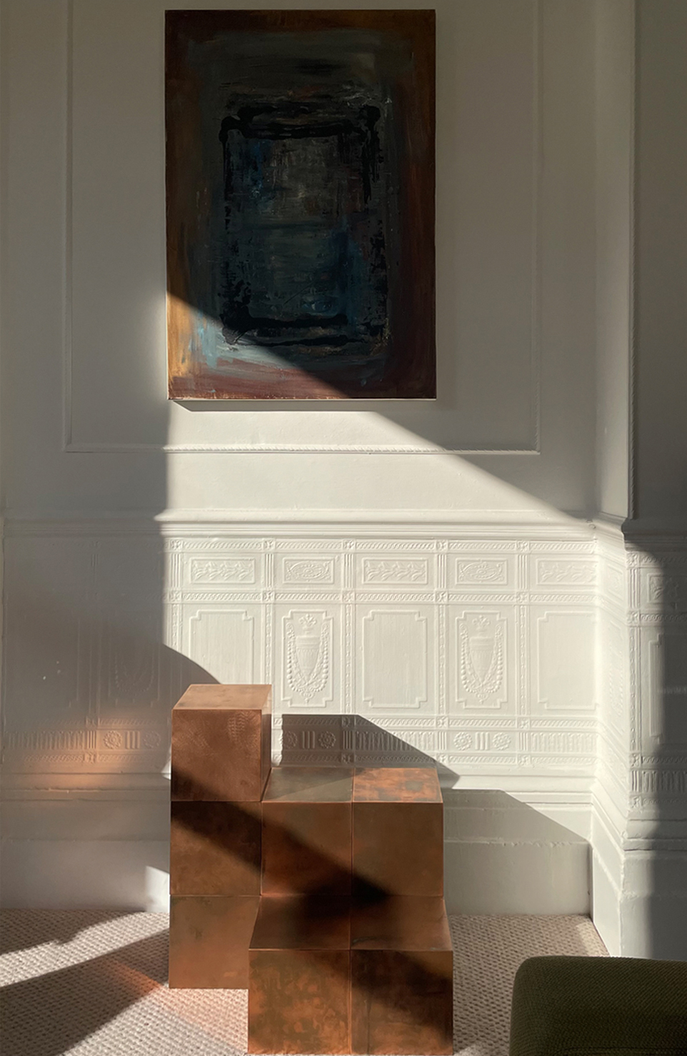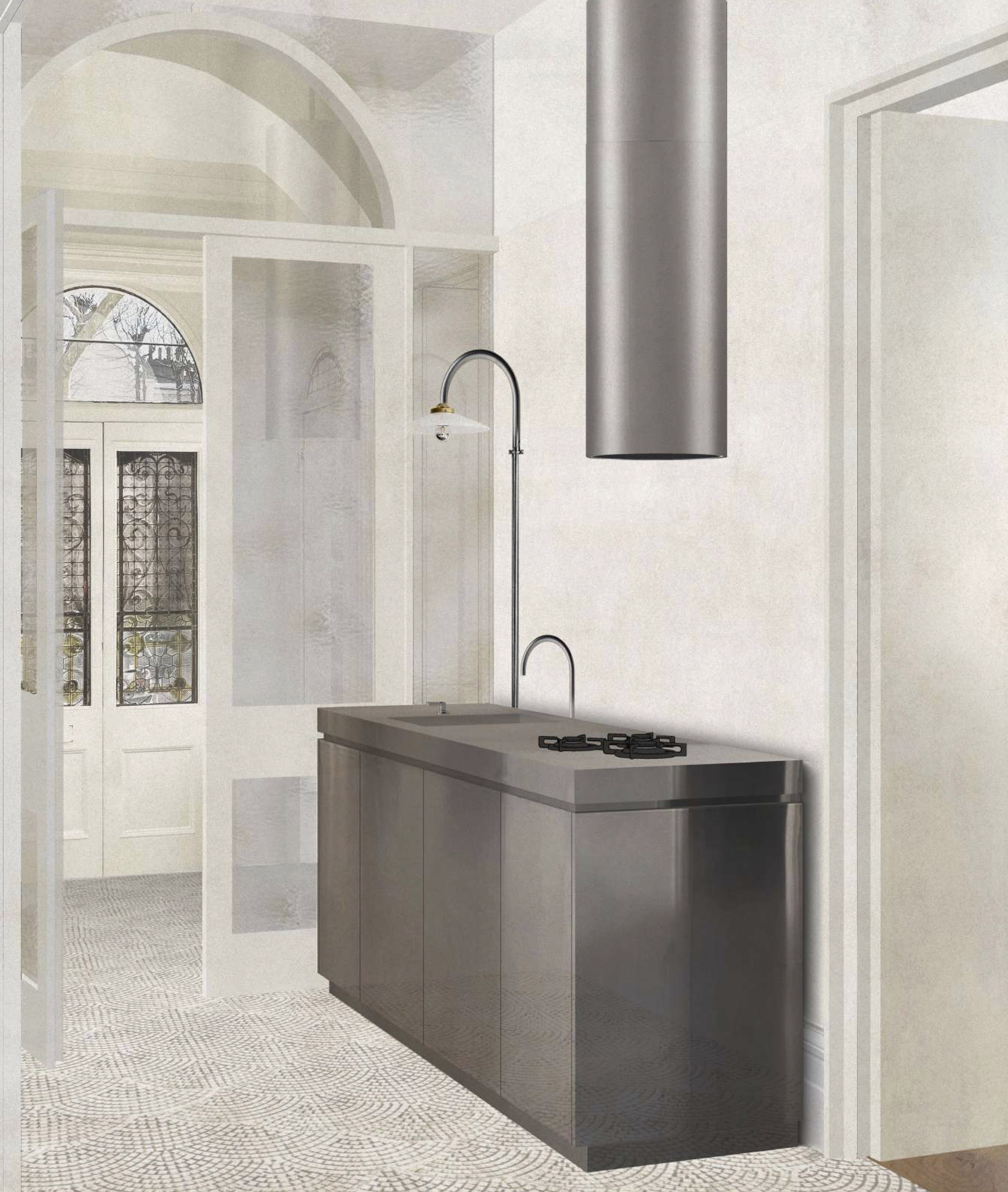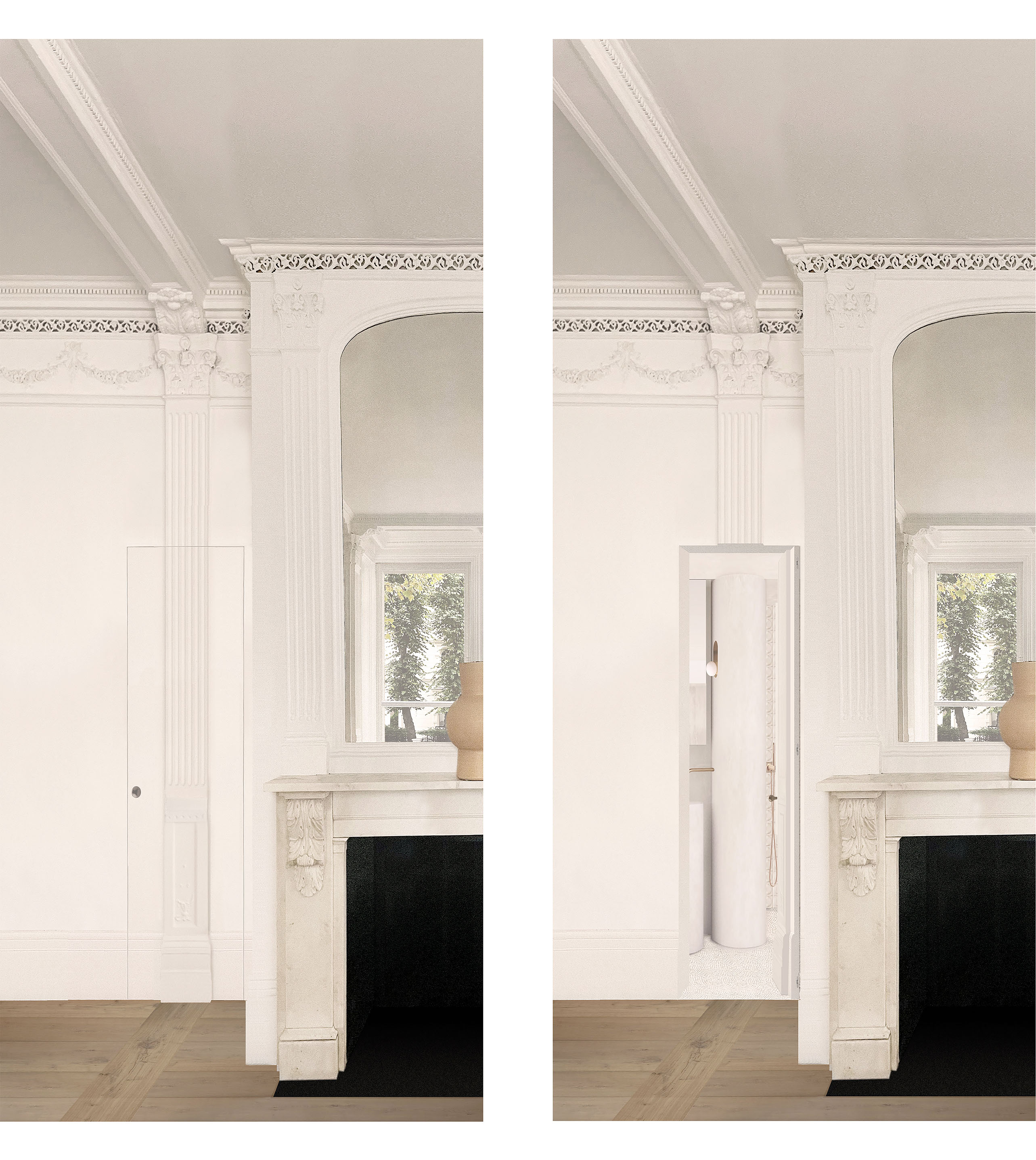 Our client's property is located in a neoclassical, Grade II-listed building on a prestigious corner of the Maida Vale Conservation Area, near the canals of Little Venice. The brief is to reconfigure and fully renovate those aspects of the original layout and mouldings that have survived to the present and also to add a contemporary extension that will serve as a master bathroom and study. Its nineteenth-century mouldings and architectural themes are featured in a large number of buildings nearby, which are ‘framed’ by the large windows of the apartment and projected onto its interiors. Our layout reconfiguration and full renovation project seeks to restore and emphasise the original, harmonious continuity between interiors and urban context, while reversing the damages caused by the refurbishments carried out in the 1980s, which harmed the once-legible and classical composition and spatial hierarchy of the original XIX-century project. To that end, we proposed the demolition of all the rooms, partitions and ceiling-mounted storage units added in the past forty years, and the creation of concealed doorways, often in the form of secret doors, whose newly-crafted mouldings reinstate the original architectural repertoire of the property. These new doorways form enfilades and vistas that are in line with those created by the elegant entrance porticos of the surrounding streets, thereby reinstating the visual connection between the apartment's interiors and urban context. In terms of circulation, this solution - as well as the design of bespoke, 'walk-through' furniture - allows for a continuous flow and a more flexible use of space, while maintaining the traditional scale, hierarchy and separation between the rooms. The extension provides additional bathroom and workspace the owners have requested to enhance the master suite.