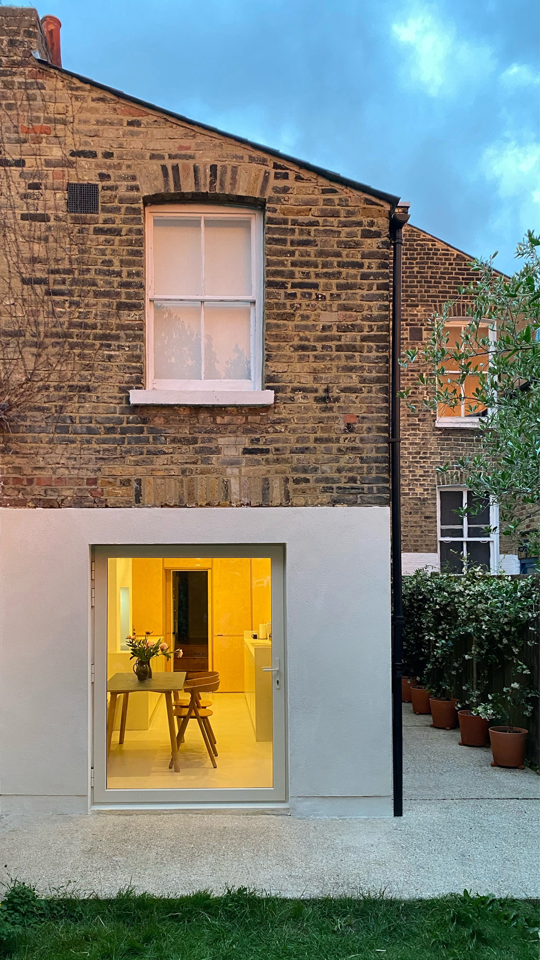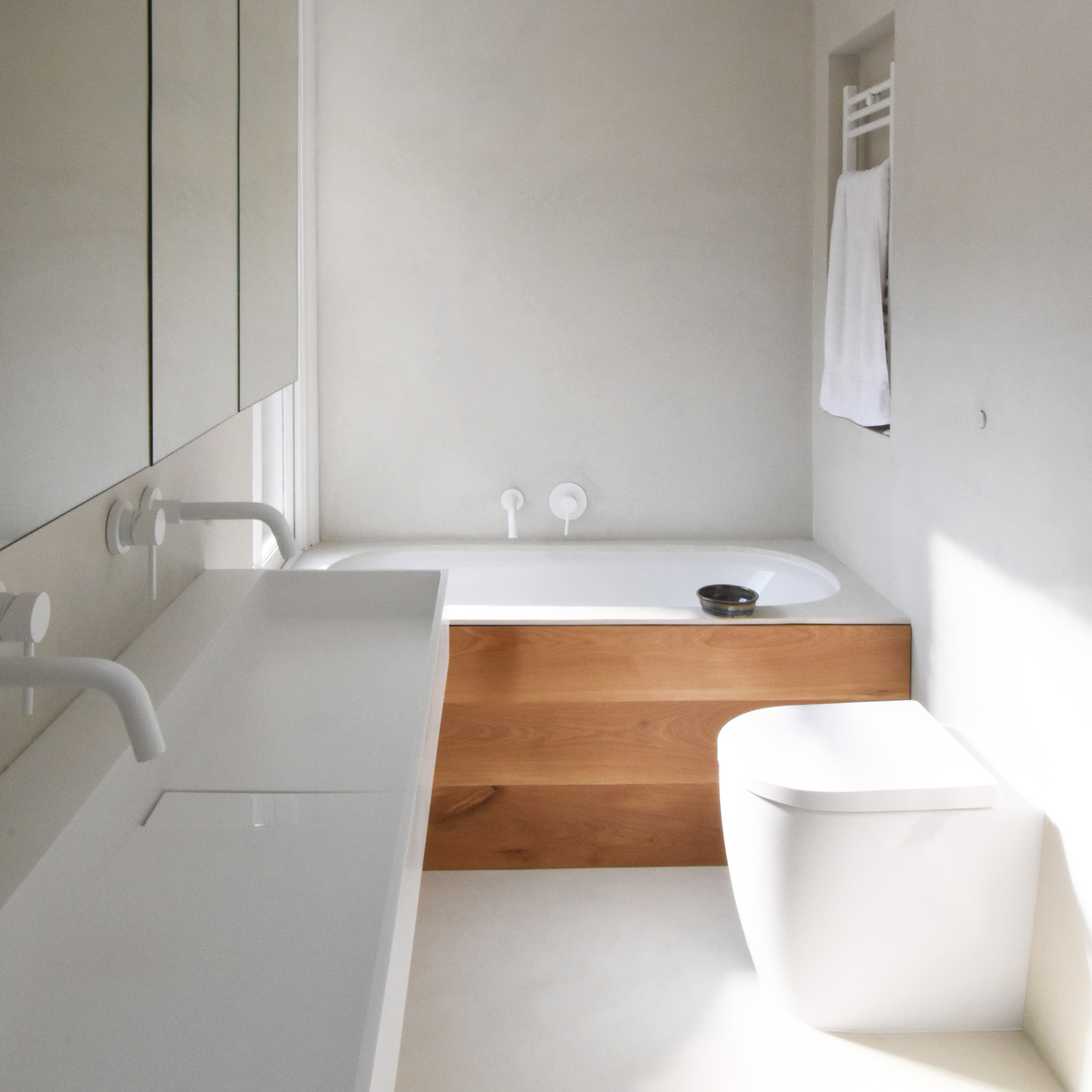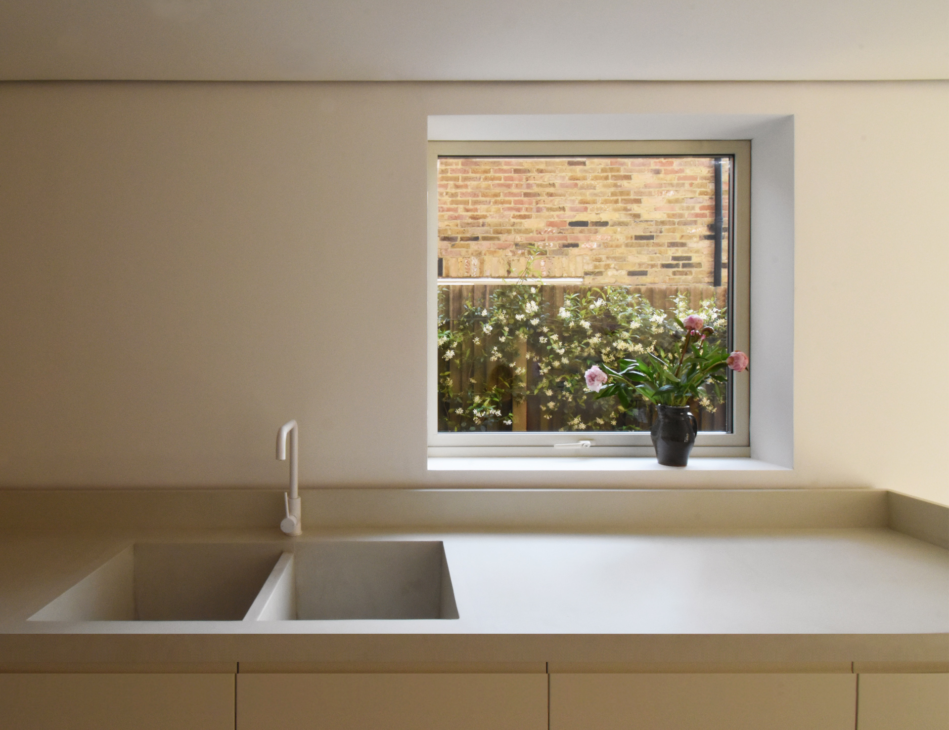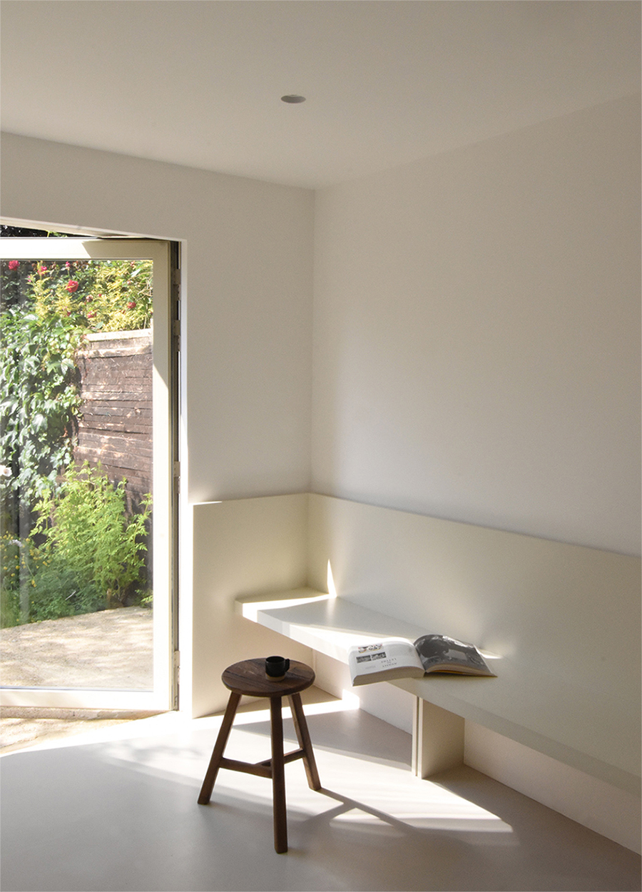This two-storey terraced house in south London was remodelled to achieve serene and orderly living spaces that are comfortable and easy to maintain. The off-white concrete floor of the north-facing galley kitchen reflects the light coming in from the new oversize double-glazed door, whose fixed frame was concealed to resemble a ‘landscape painting’ with a minimal, ivory frame. The long and narrow shape of the kitchen was broken down into volumes: a long countertop with an integrated bench creates a continuous volume that seeks to emphasise the length of the room and lead the eye towards the view of the garden at the back, while providing plenty of seating and storage space. The countertop along the opposite wall is conceived as a freestanding piece of furniture: a compact, miniature version of the former, that does not extend to the back wall in order to allow for a larger dining space near the window. The existing kitchen door was framed by a bespoke walk-through cupboard, which ties together the warm pine floor and furniture of the hallway and living room with the more neutral finishes of the kitchen. The cupboard hides the fridge/freezer and three storage units. The bathroom was extended to incorporate a large window and sufficient space for both a bath tub and wet room. The long, stone resin double basin and the bespoke mirror-clad vanity unit above ‘link’ the two areas, alongside the use of a single, ivory finish on the walls, floor, shower and bath cladding.