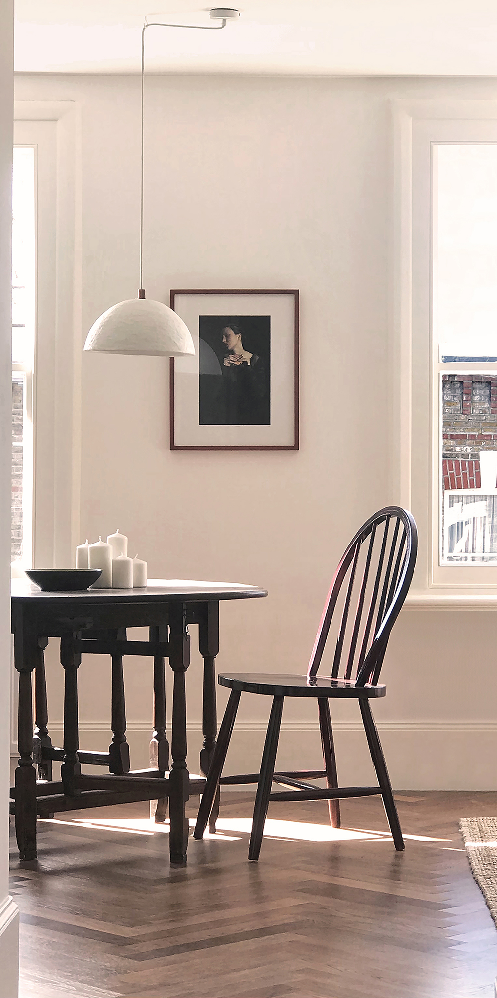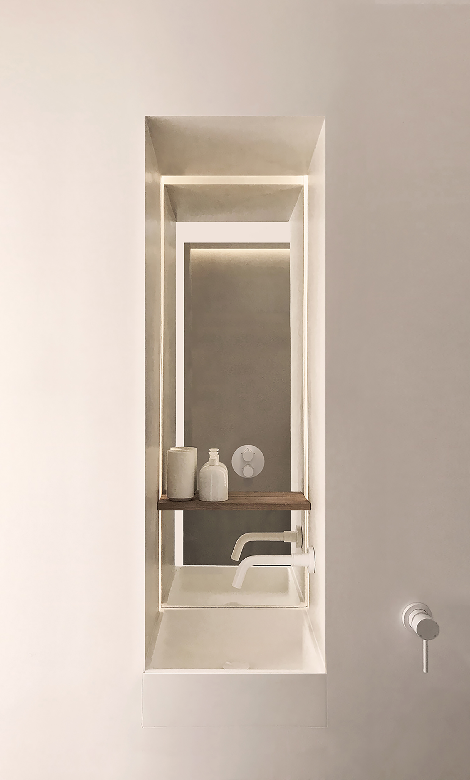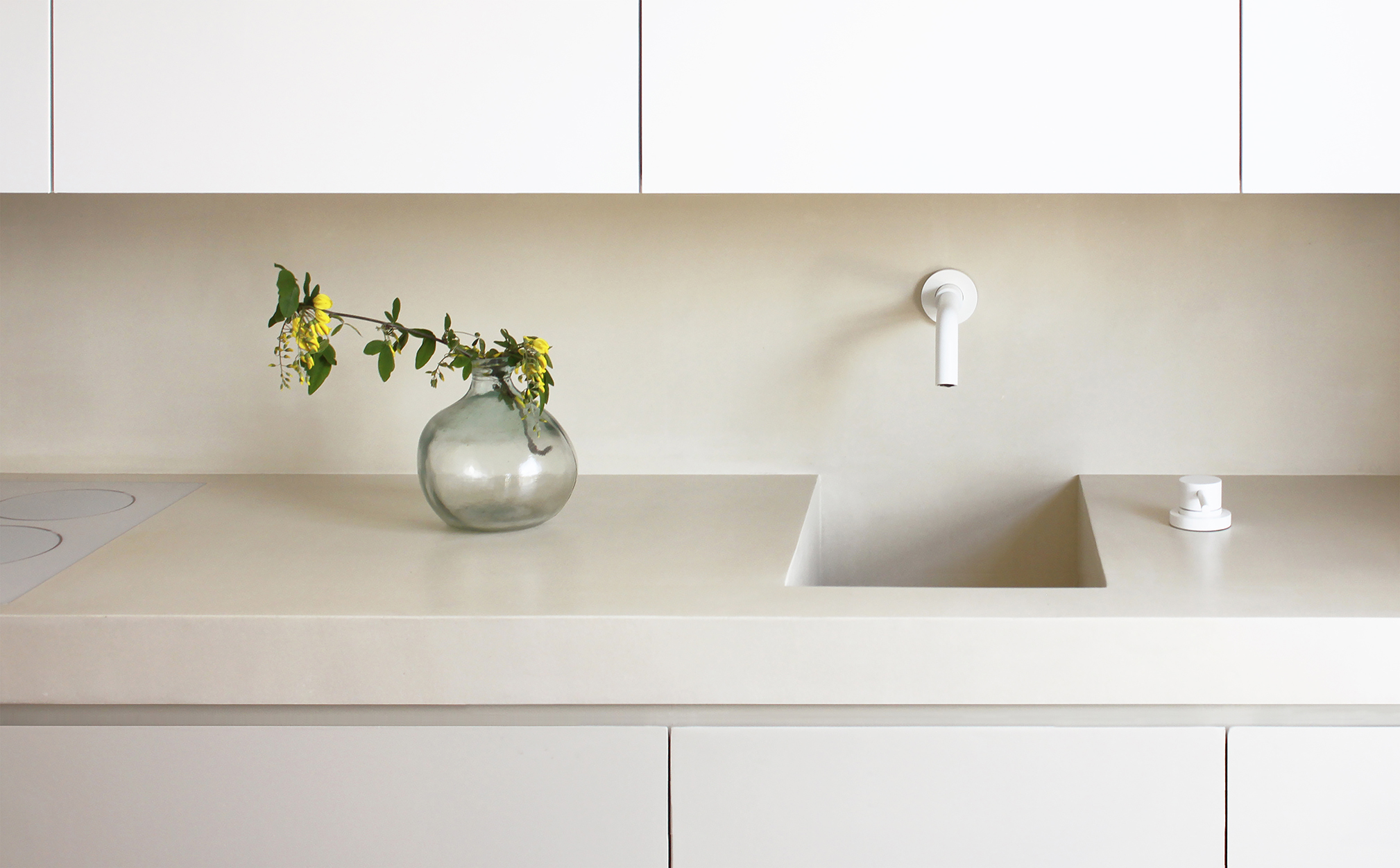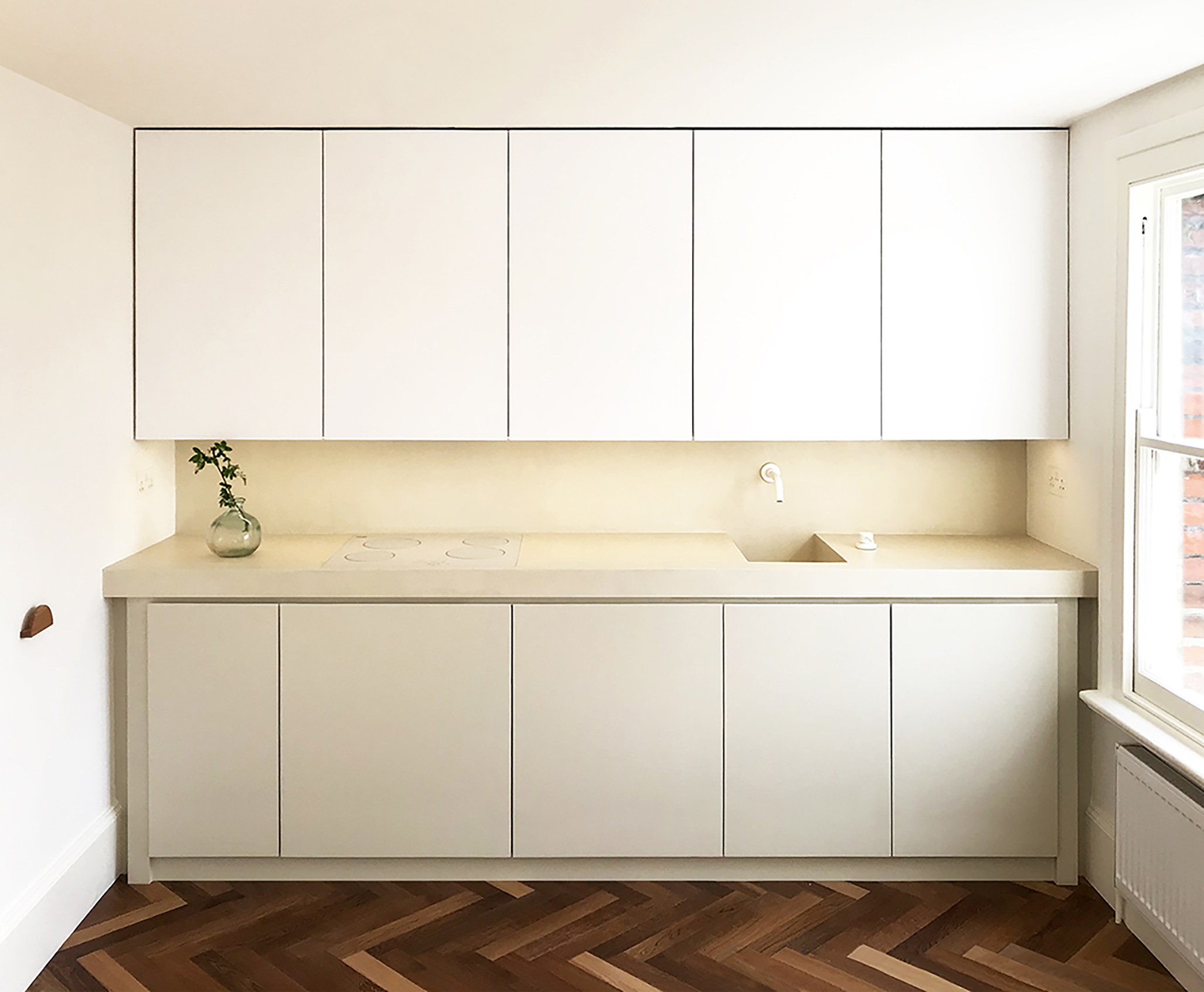 The refurbishment of this west London flat sought to enhance the use of space through layout changes and several pieces of built-in furniture. The herringbone floor runs across the main axis of the plan, leading the eye to the twin windows of the west-facing living area, and tying together the different rooms and elements of the design. These range from reclaimed pieces of old timber furniture to the neat, sculptural design and carefully chosen finishes of the bespoke furniture. The kitchen is conceived as a backdrop to the dining and living area. To achieve this result, all the appliances, sockets and handles are concealed or barely visible, so the volume and stone-like texture of its smooth micro-cement finish remains prominent. The configuration of the kitchen cabinets and long ‘niche’ is replicated as a backdrop to the living area opposite, in order to provide additional storage space hidden inside a built-in bench and in the wall-hung cabinets above. The bathroom is also conceived as a continuation of the kitchen layout, with its micro-cement niches, hidden fitting and storage space, and timber shower tray.