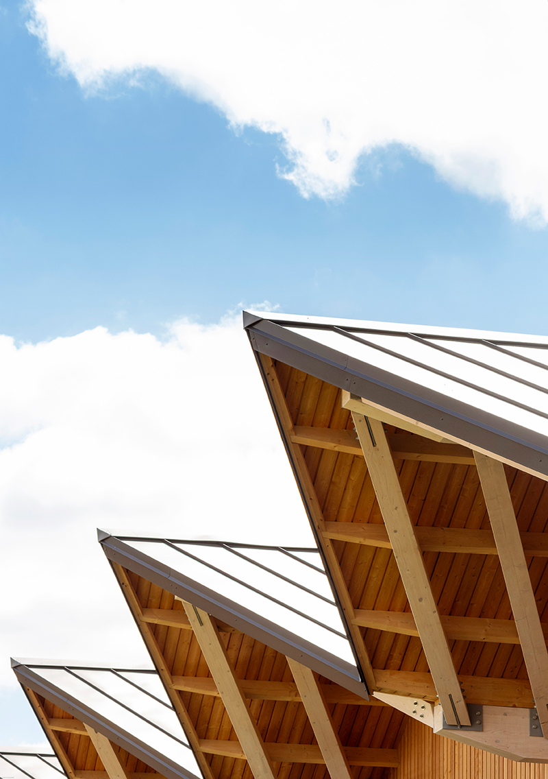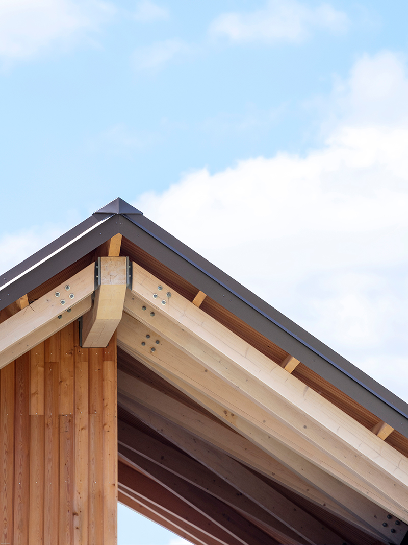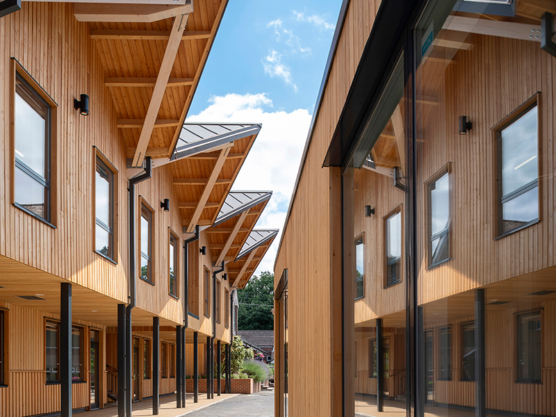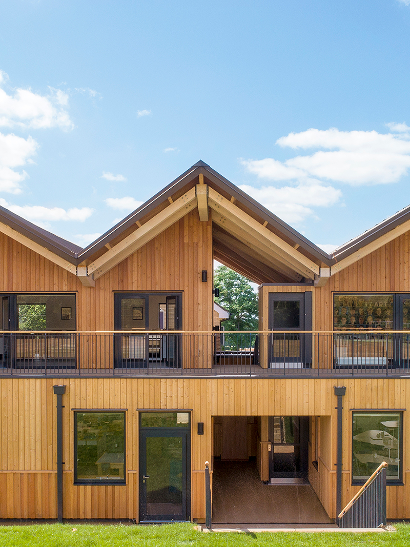 An innovative new teaching and sports building for Cranleigh Preparatory School in Surrey, working in collaboration with Design and Build Contractors Blue Forest. Situated in the midst of the open green spaces that the school is known for, the building provides a healthy natural learning environment for students, merging inside and outside spaces to improve circulation, flow and functionality across the school campus. The new building provides eight new classrooms for science, design and technology, home economics and art. The site is situated at the heart of the school, and we have taken this opportunity to improve the wider circulation and provide a new drop-off and teacher / parent meeting space. The circulation areas within the building are all covered external spaces, in line with the school’s philosophy of healthy outdoor living and minimising climate controlled corridors. The brick base of the new building provides these covered ‘cloister’ spaces, with a floating timber canopy above relating to the mature trees around the site.