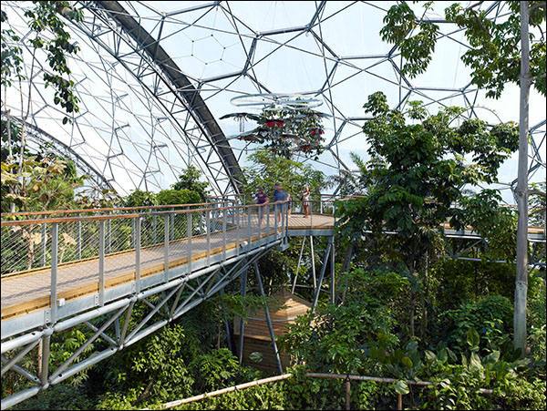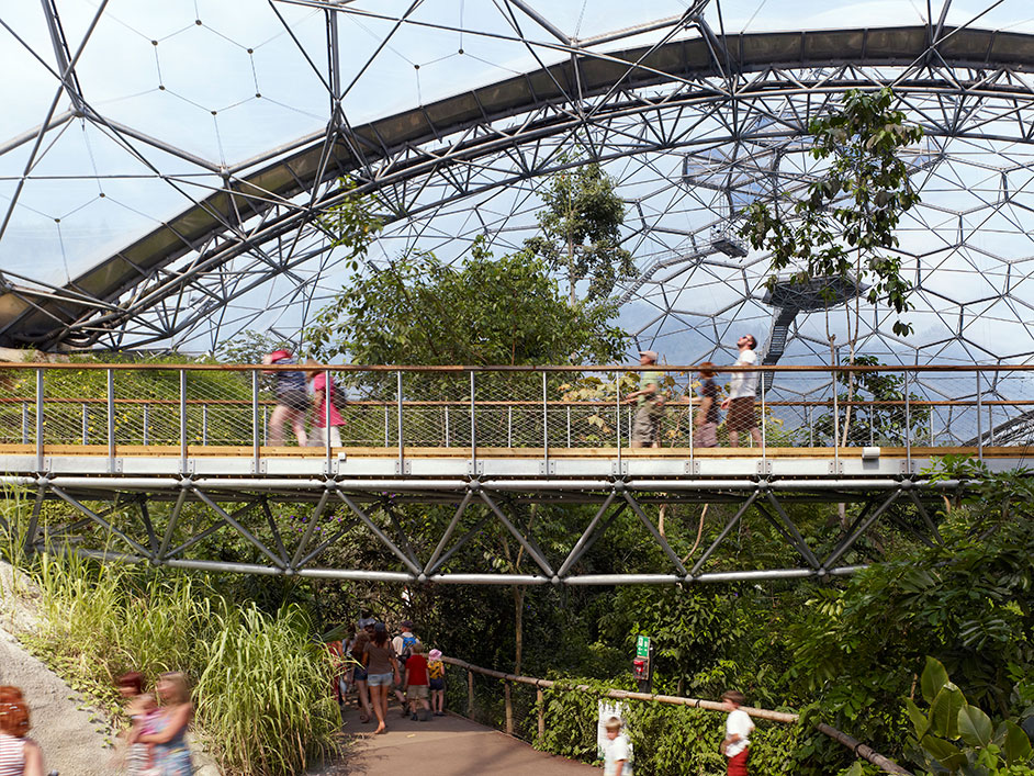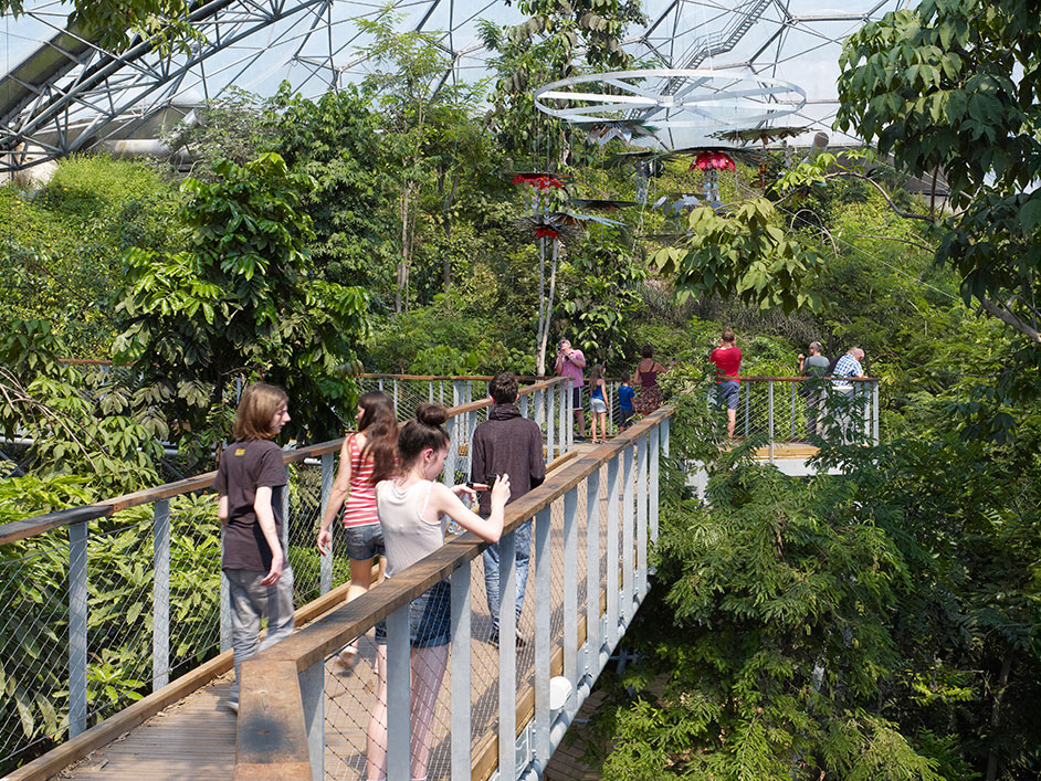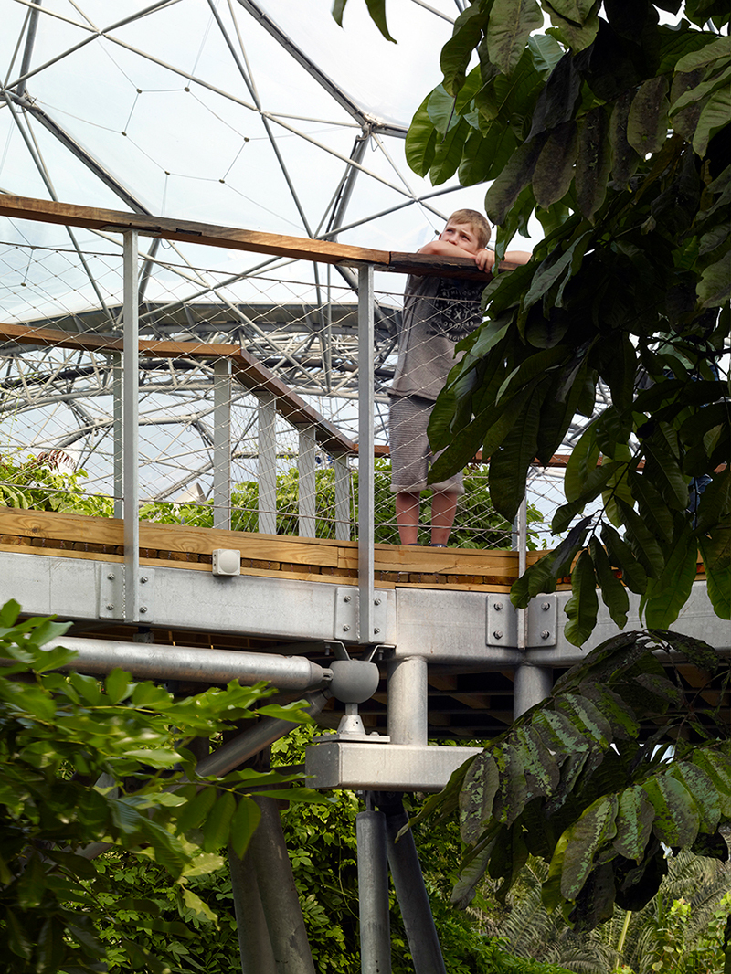 In collaboration with treehouse specialists Blue Forest, we started working with the Eden Project in 2011 to design a series of high level visitor walkways through the rainforest canopy in the existing Humid Tropics Biome. These new interventions will include a treetop research station, an area explaining sustainable rainforest crops, a traditional indigenous treehouse and a waterfall cave. We completed phase 1 of the walkway in 2013. This includes a new high level loop with two 20 metre long bridges spanning to an 8 metre high platform, which is an education space to explain the complex rainforest ecosystem. We are planning a future timber enclosure to this platform, dubbed the ‘Biodiversity Nest’ which is due on site in coming months. Construction of the Phase 1 works was technically challenging as the site could only be accessed by a set of existing double doors in the biome while the construction could not damage the existing delicate planting, all materials needed to withstand the harsh rainforest environment. The team had to finish within a construction period of 5 months and the biome remained open to the public throughout. We are about to start the design for Phase 2, called the ‘Weather Station’ which will be developed in collaboration with the Met Office and Royal de Luxe theatre company. The Eden Rainforest Canopy Walkway is set to provide an educational experience which will be completely unique to Europe.