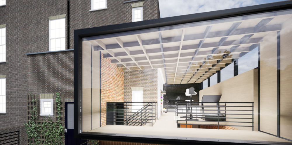 This project explores the design options for a contemporary extension attached to a semi-detached Victorian style house while respecting the neighbourhood context. This would facilitate a gym overlooking the garden with a path leading from the front of the house to the back garden. Our proposal aims to limit the impact on the existing building structure and backyard footprint whilst maximising usable floor area created. The proposed design option features a ground floor sauna and shower with route to through to the garden and an upper level for the gym. The front elevation of the structure uses etched glass to provide privacy into the gym.