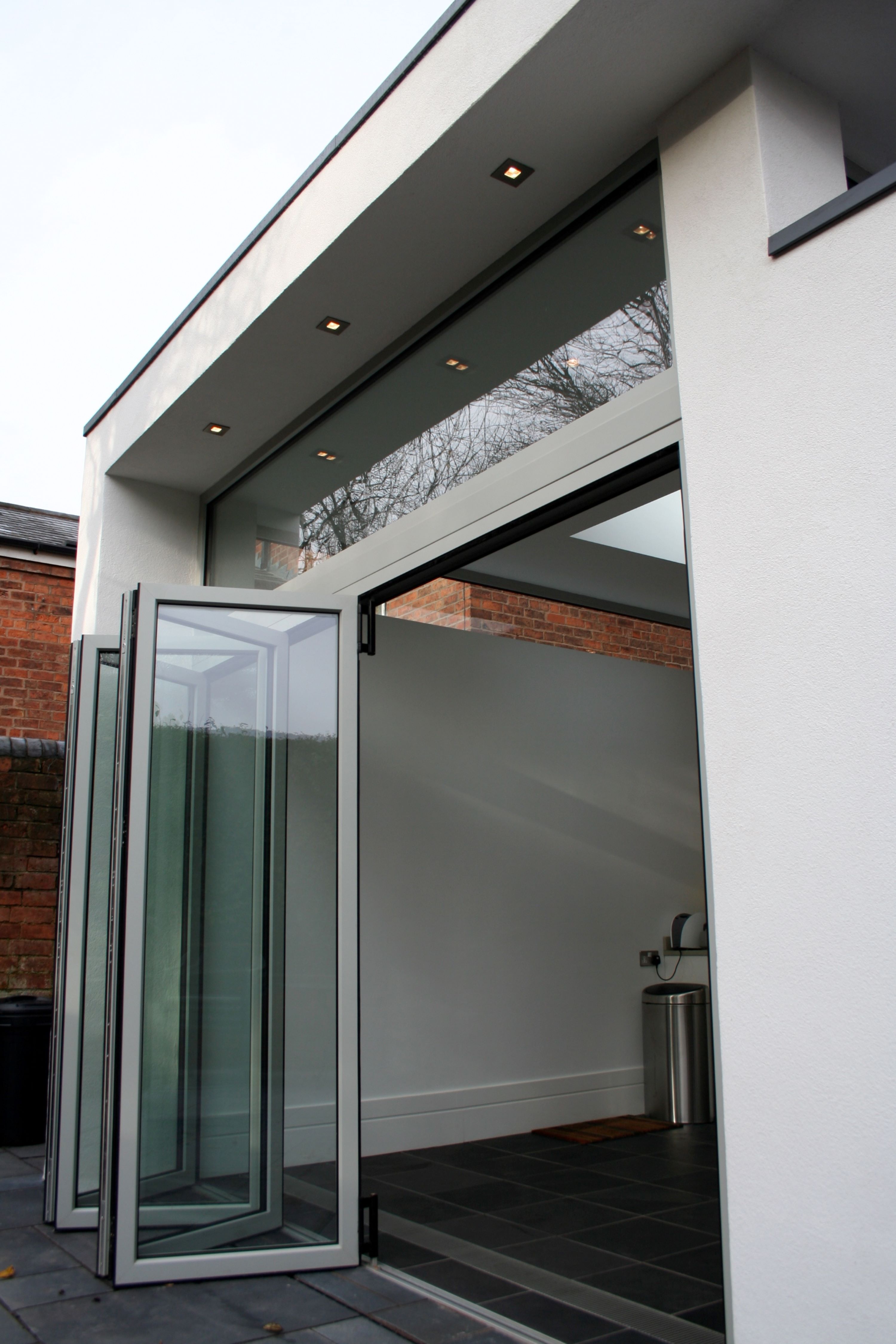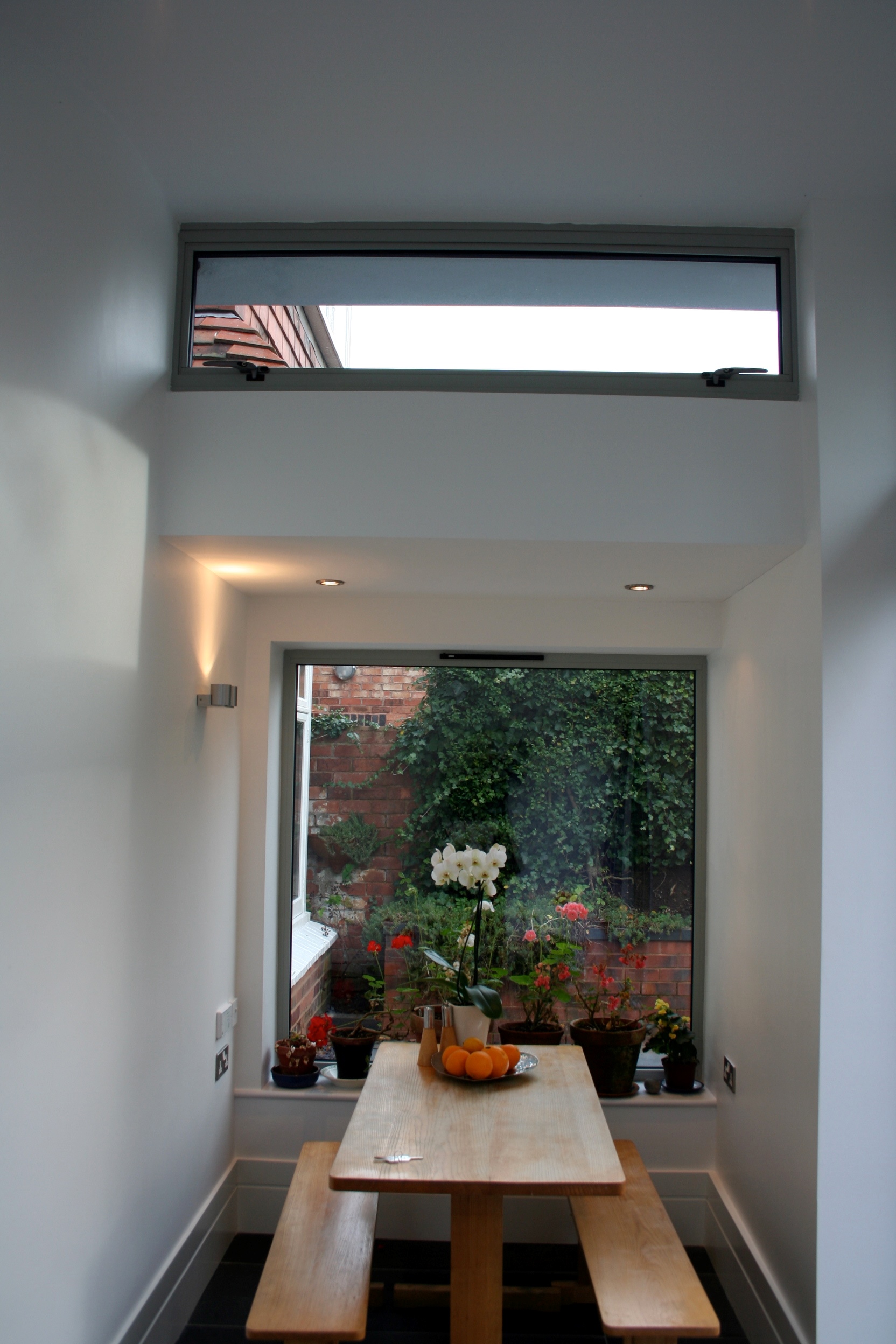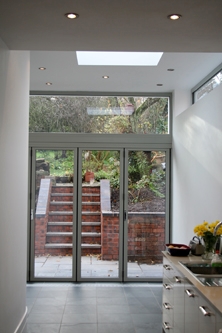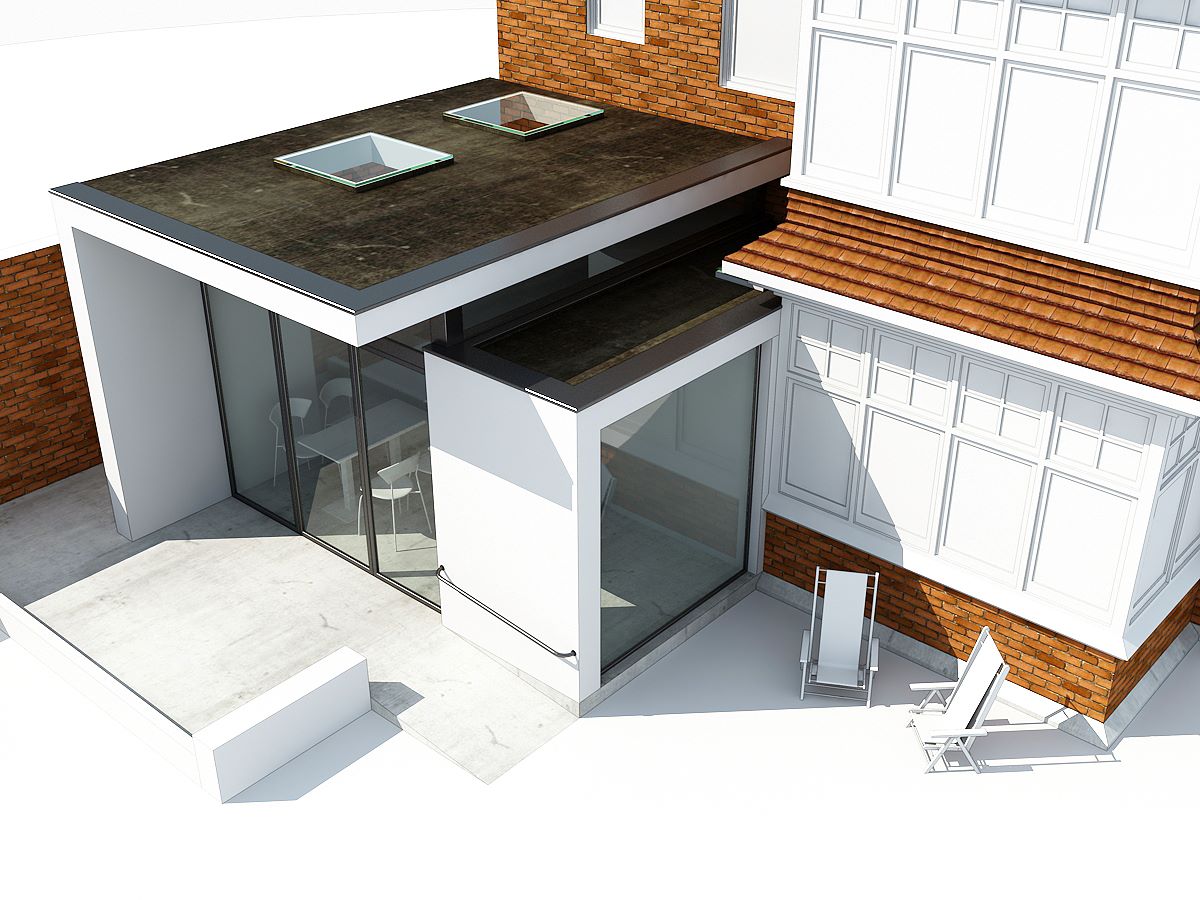 This contemporary extension is based on two interlocking cubes, the lower one deals with the low level roof of the bay window and the larger block forms an extension to the existing kitchen. The scheme received unconditional approval from Calthorpe Estates. This striking contemporary extension sits in contrast to the rear of this traditional Victorian house and creates a substantial extension to the kitchen. The new space also provides space for dining, and a reading area with its own picture window. The roof of the main block sails over the lower block, adding to the visual connection between the two and this roof appears to float due to the high level windows which run all the way around the perimeter. The fin wall which runs out into the garden and provides a space for the folding / sliding doors to rest whist at the same time wraps around to form a strong 'L' shaped frame. The design is rendered white with grey aluminium windows to complete the contemporary aesthetic.