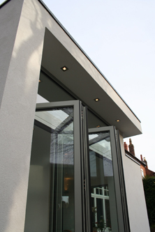 This contemporary extension is based on two interlocking cubes, the lower one deals with the low level roof of the bay window and the larger block forms an extension to the existing kitchen. The scheme received unconditional approval from Calthorpe Estates. This striking contemporary extension sits in contrast to the rear of this traditional Victorian house and creates a substantial extension to the kitchen. The new space also provides space for dining, and a reading area with its own picture window. The roof of the main block sails over the lower block, adding to the visual connection between the two and this roof appears to float due to the high level windows which run all the way around the perimeter. The fin wall which runs out into the garden and provides a space for the folding / sliding doors to rest whist at the same time wraps around to form a strong 'L' shaped frame. The design is rendered white with grey aluminium windows to complete the contemporary aesthetic.