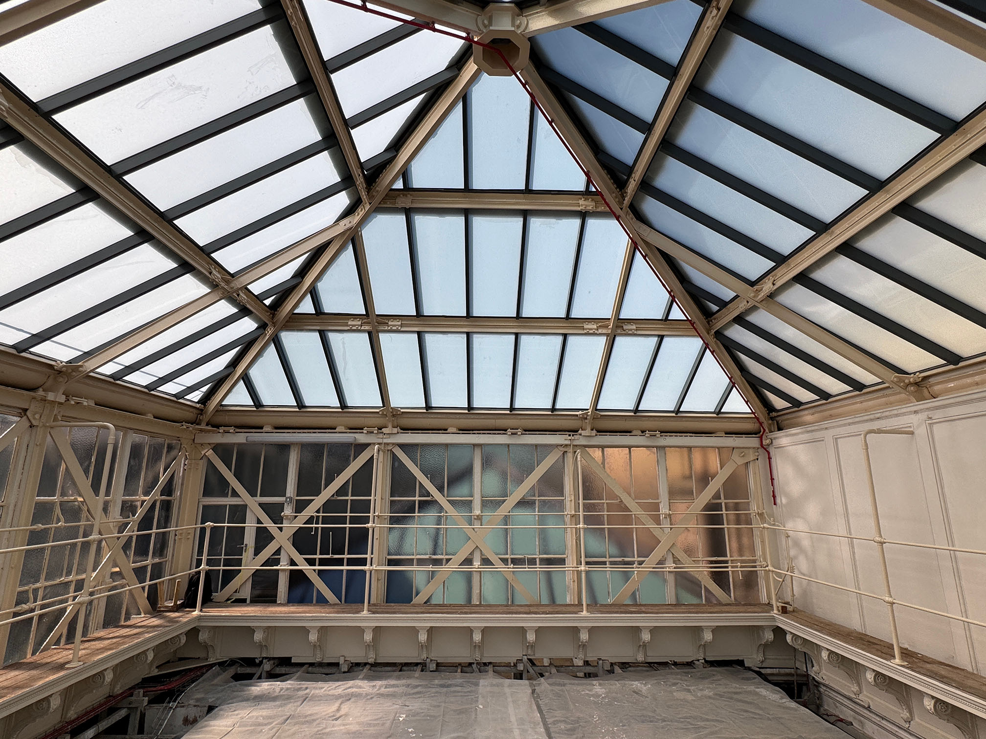 The North & South Courts are some of its oldest parts of the V&A, dating from 1861-63 and its early development as the South Kensington Museum from 1857. The repairs to these historic roofs were an essential step in a wider programme of conservation and repair to this part of the Museum. The works enhance the weatherproofing function of the roofs and improve maintenance access as well as providing increased stability to the environmental conditions within the galleries below. Local repairs to decayed areas of significant historic structure were carried out to window framing, timber walkways, and plasterwork at the same time as renewal of non-original and deteriorated roofing materials to the roofs and replacement of window units dating from the 1950s.