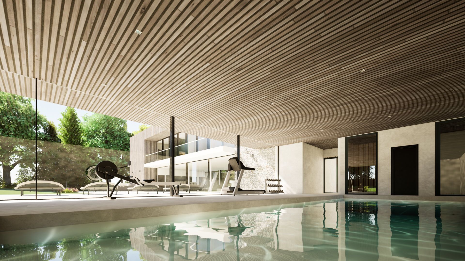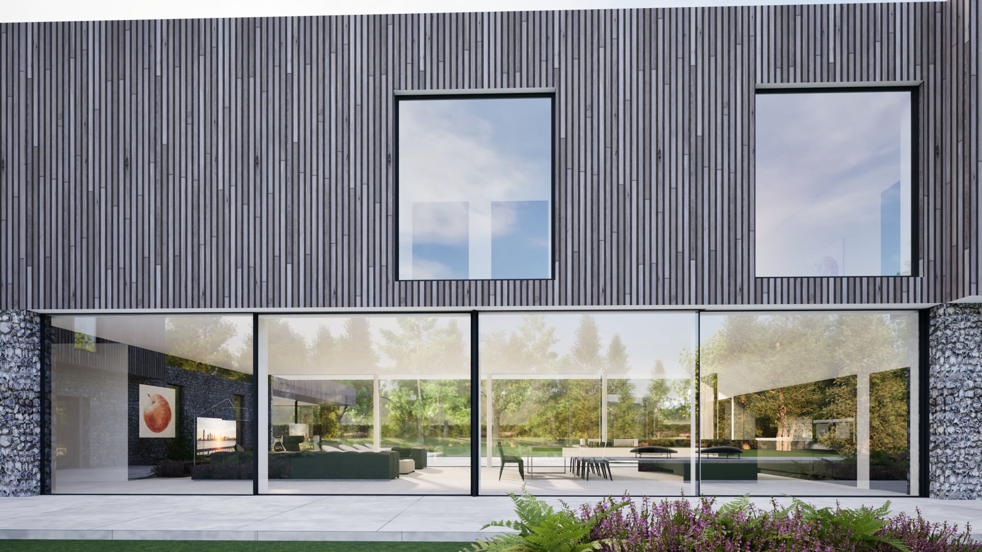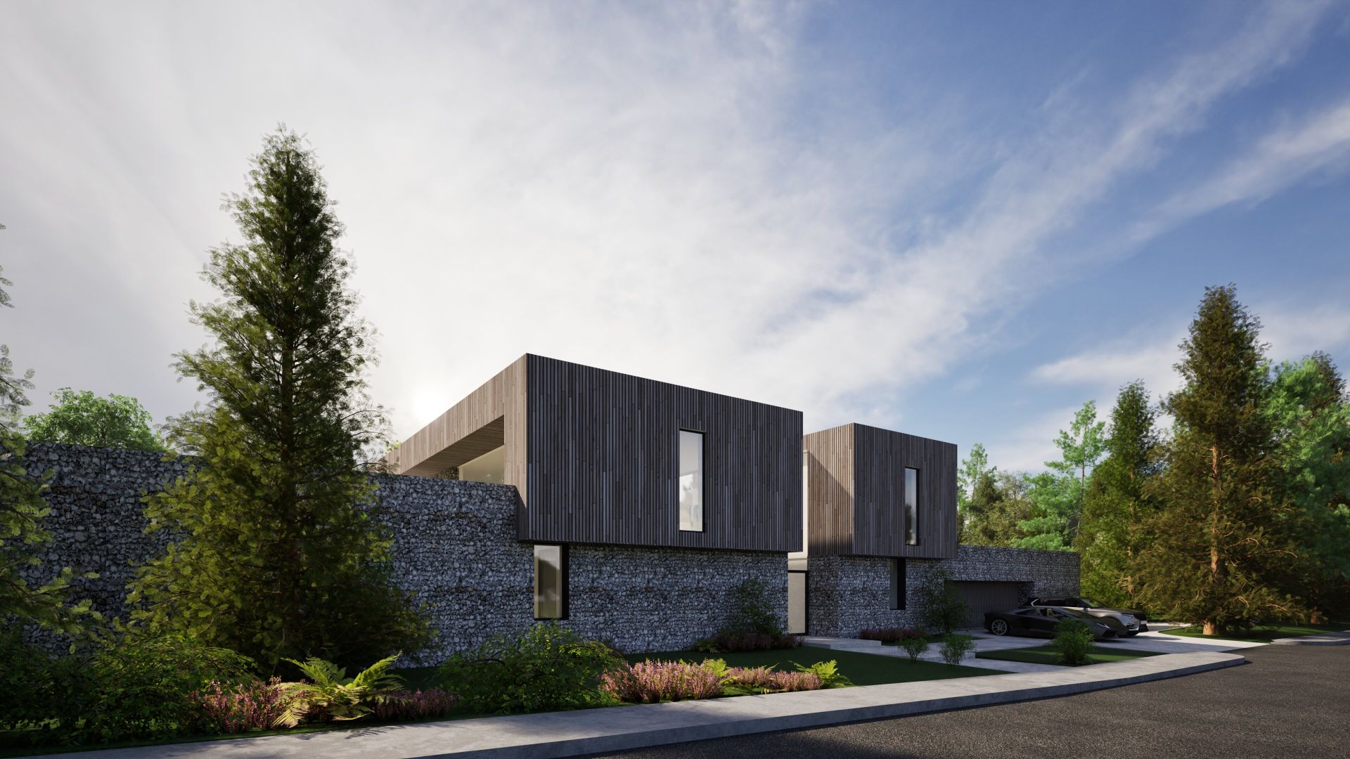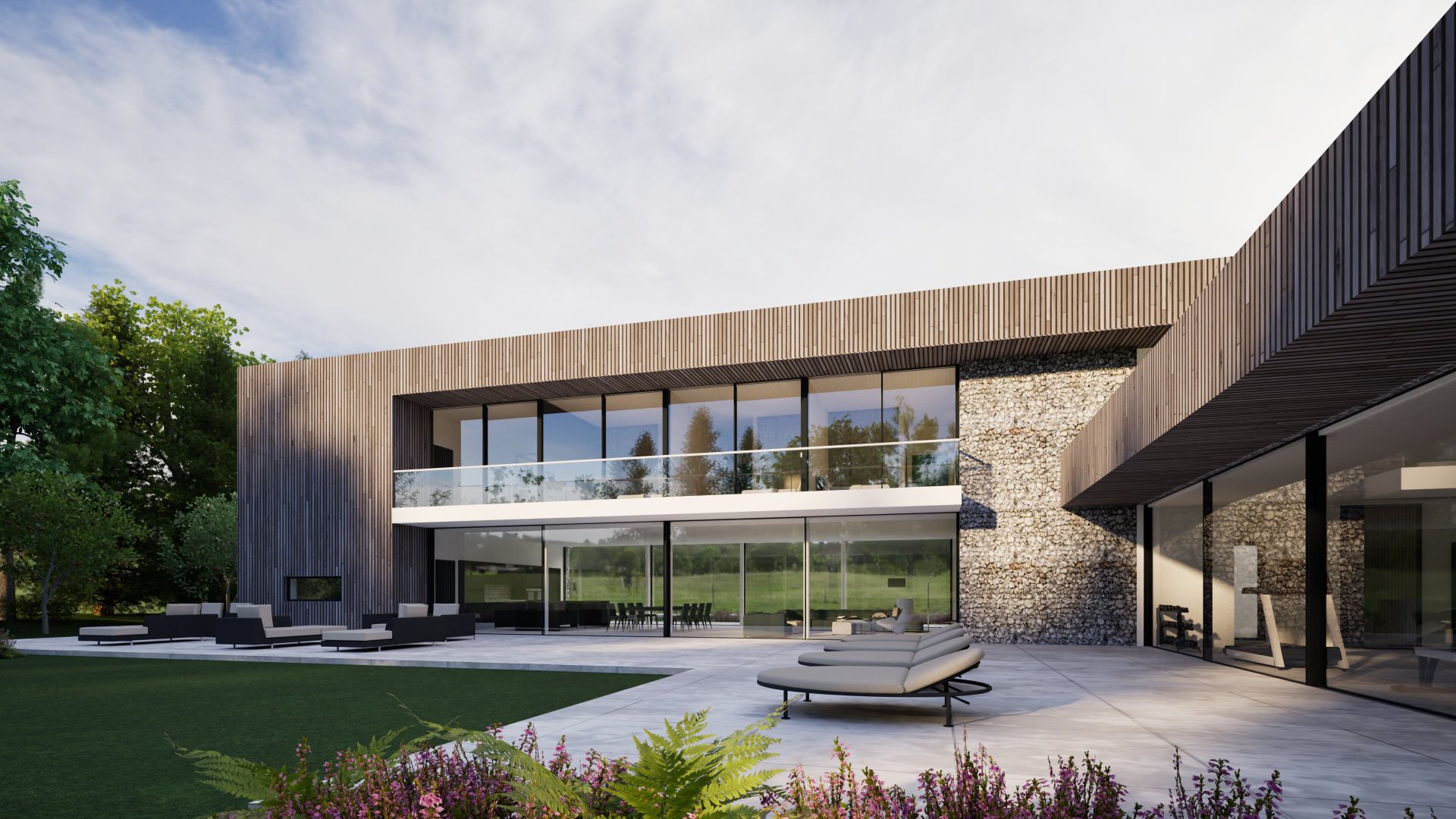 The project is for a 5 bedroom house within the garden of an existing detached house on the outskirts of Romsey, Hampshire. The building is orthogonal in form with a two-storey wing containing bedrooms and living accommodation, with single storey wing containing a pool, gym and sauna with a guest wing above a three-car garage and boot room. The layout is open plan to the ground floor with public entrance hall leading through more private areas accommodating the living, dining and kitchen with study at the end. These have glazed screens to the two long sides to open up to the gardens. A generous library / gallery space forms a secondary family area above the entrance lobby incorporating extensive glazing and large rooflight and leads to the bedroom accommodation. The bedrooms face south and include balconies to the south which act as sun-shades to the ground floor to reduce solar gain.