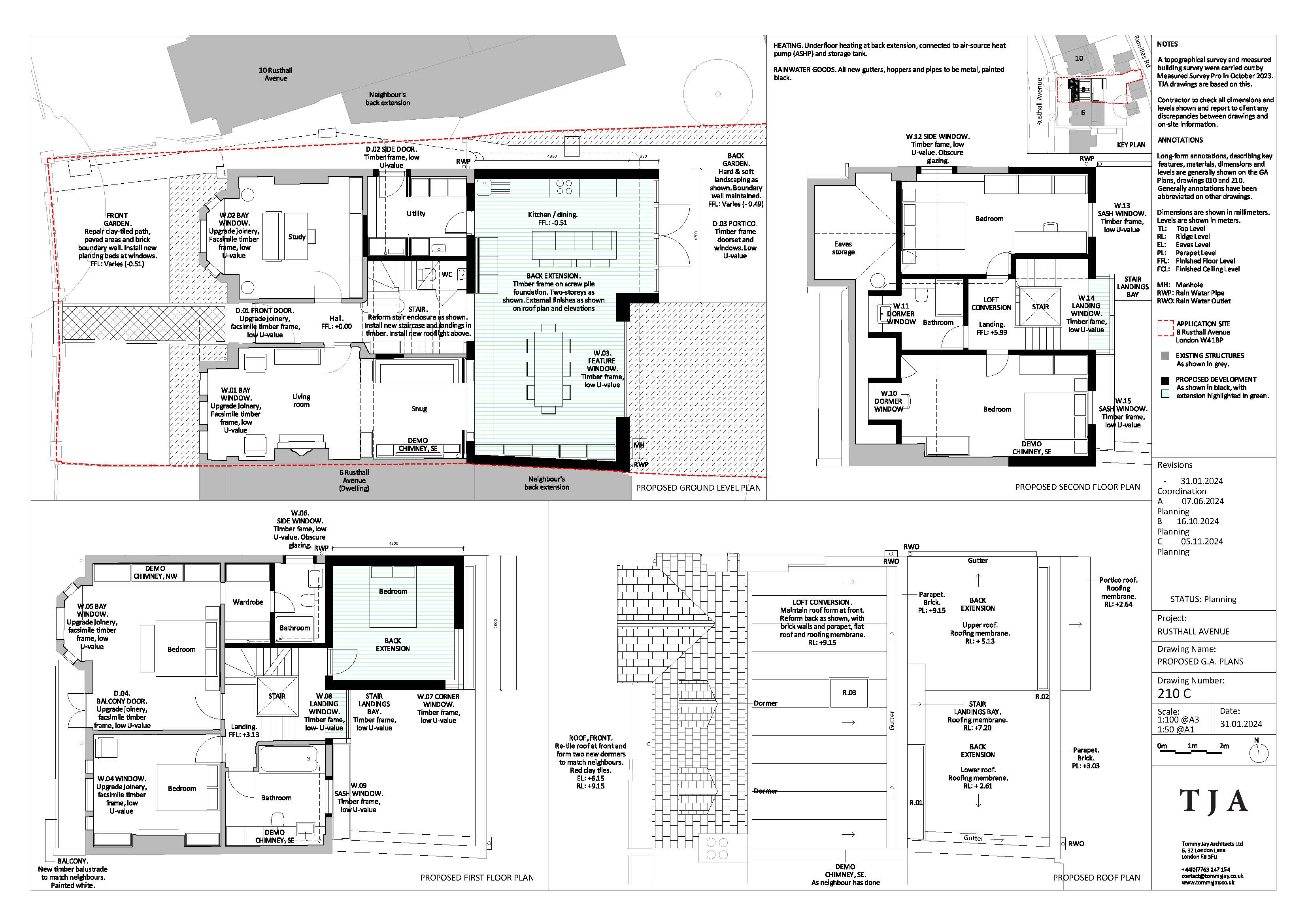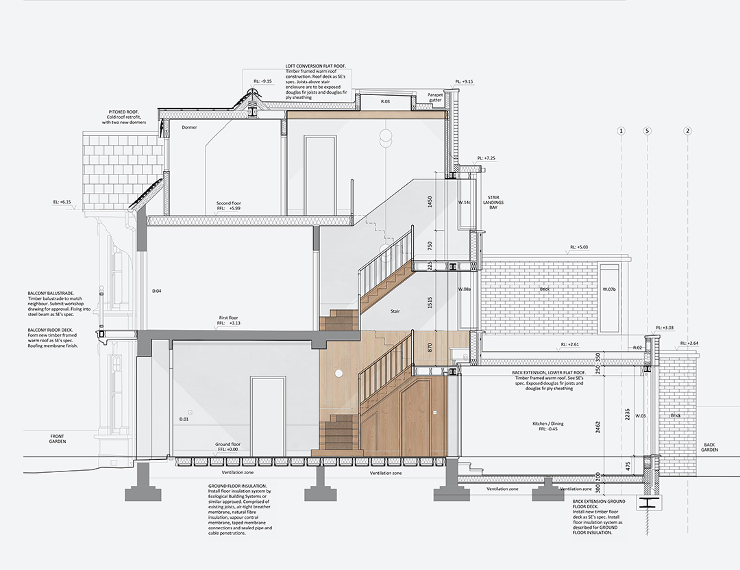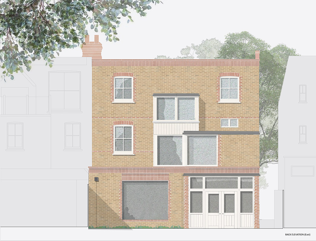 The project, located in Chiswick, London, is currently at tender stage. TJA are providing full architectural services encompassing RIBA work stages 1-5. The estimated project construction value is £750k. The house has been largely unaltered since it was built around the end of the 19th century. Challenges to overcome include thin brick walls, single glazed windows and an outrigger that inhibits the house's connection with its back garden. The various opportunities identified include capacity for a significant loft conversion, planning precedent for remodelling the outrigger and the chance to improve energy efficiency throughout. Inspiration was sought from the nearby Bedford Park estate, which pioneered the Garden City Movement in the early twentieth century. As an approach to town planning, which sought to marry the best things about urban life with the best things about rural life, we were interested in how this could apply at the scale of a house’s design in the twenty-first century. Our design features a timber-framed back extension across the full width of the house at ground floor level. This enables the house to engage the back garden with a new kitchen and dining space. Above this is a new bedroom, formed to the side to allow light into the central stairway. The stairway is widened to create a welcoming entrance hall, featuring a new staircase with bay windows on each landing and a rooflight above. A loft conversion provides two additional bedrooms and a bathroom. The existing building envelope will undergo a retrofit of ground insulation, roof insulation and window upgrades – all to be timber-framed, facsimile sash windows. The back extension and loft conversion will achieve new-build energy efficiency levels. Junctions between new and old will be carefully coordinated to control ventilation, movement and insulation. Other features include a green roof, air-source heat-pump and underfloor heating.
