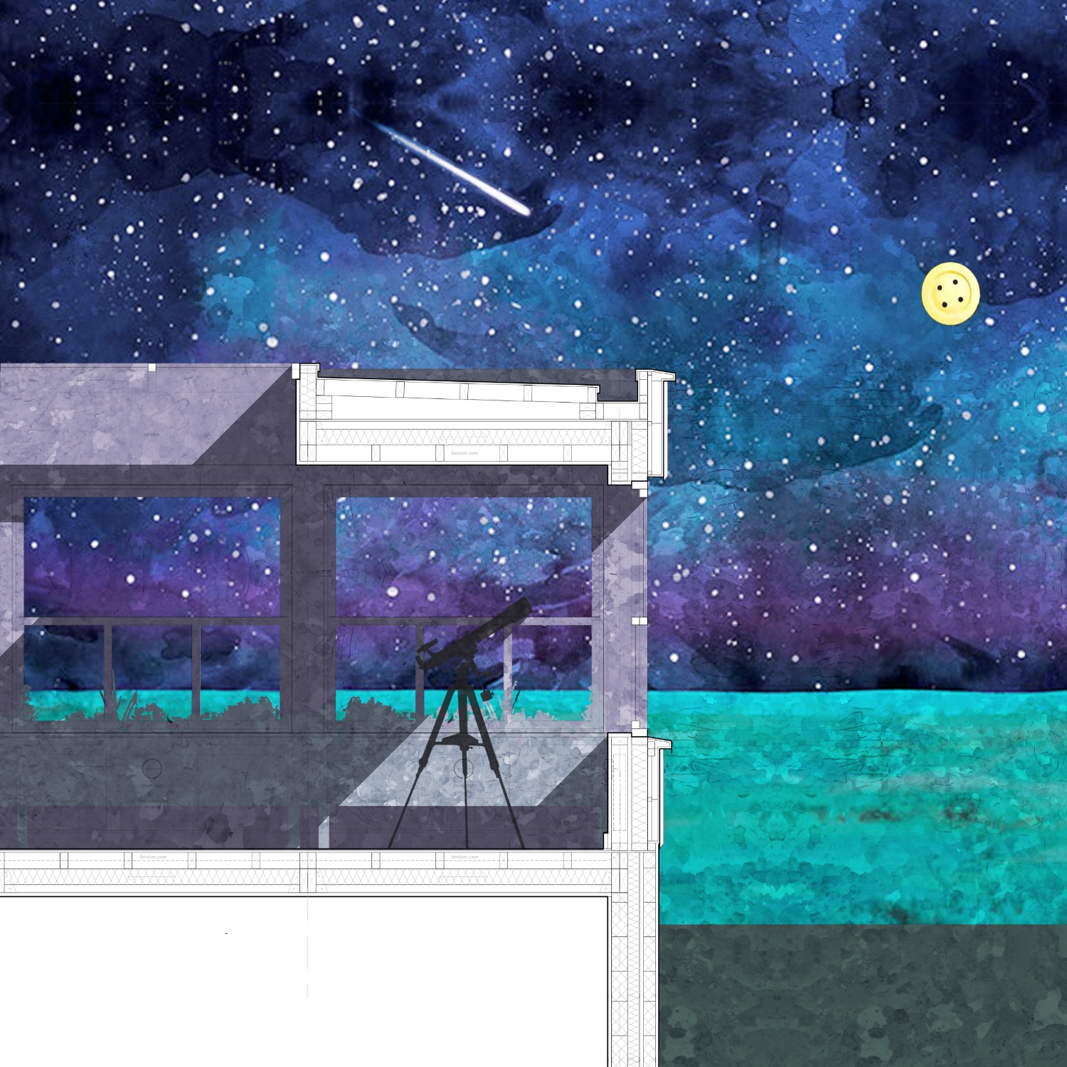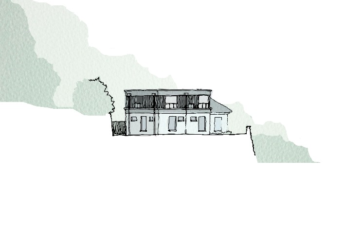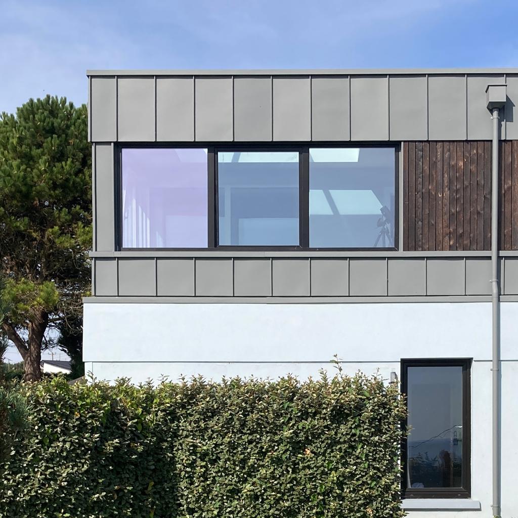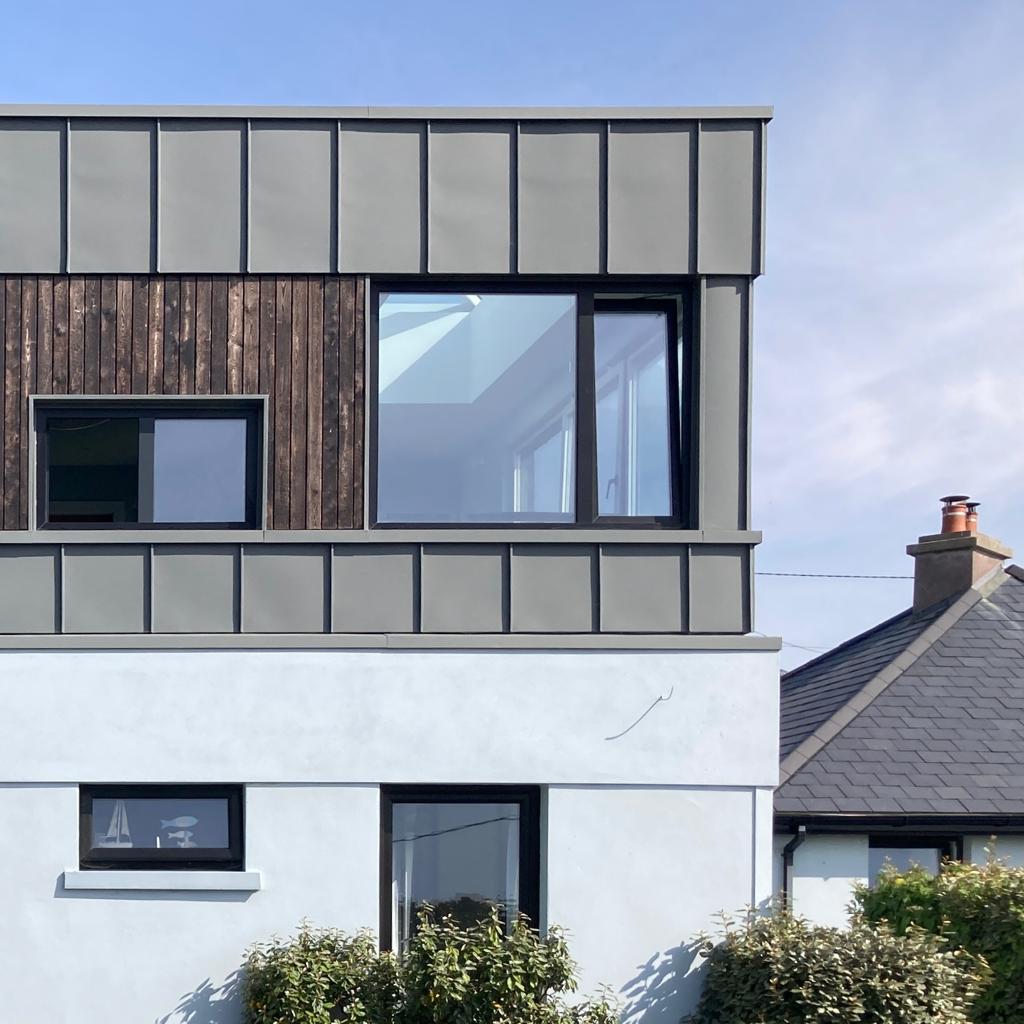 The project, located in Crosshaven, Cork, was completed in 2020 with a construction value of £200k. TJA provided architectural services encompassing RIBA work stages 2-3. The brief outlined a bungalow extension to gain a first floor bedroom suite with study, bathroom and star-gazing lounge, taking in coastal views and the night sky. The design provides a new first floor plan which maximises coastal views and optimises storage in the dark part of plan. The ground floor plan untangles front-of-house from back-of house. This involves a new side entrance and boot room to manage mess, so that the entrance hall can be more formal and welcoming. Both look into an inner courtyard that was previously obscured by the former entrance hall's guest loo and coat cupboard. The new stair location and reorganised circulation both do away with dark corridors, and the landscape design arranges pathways and planting to improve privacy for ground floor bedrooms. Zinc cladding, charred larch timber and large format windows are arranged to emphasis horizontality, layering and relief, making the overall form appear dynamic rather than weighty.