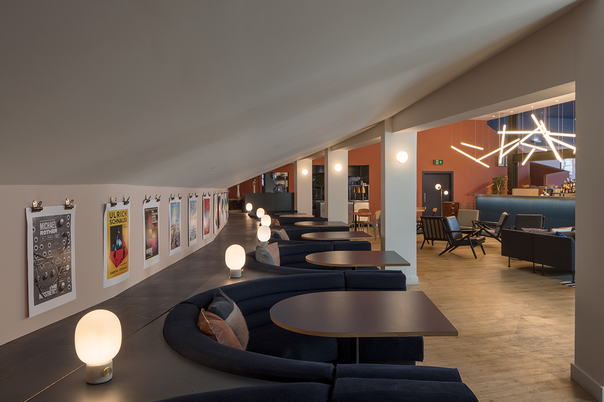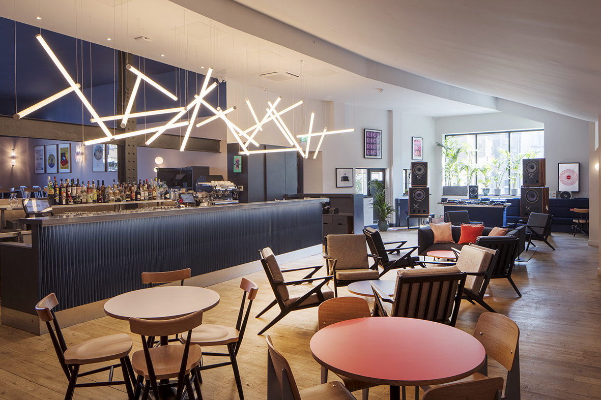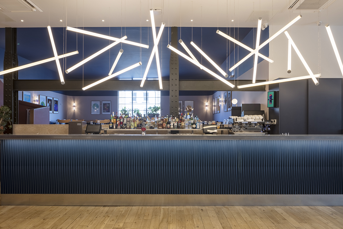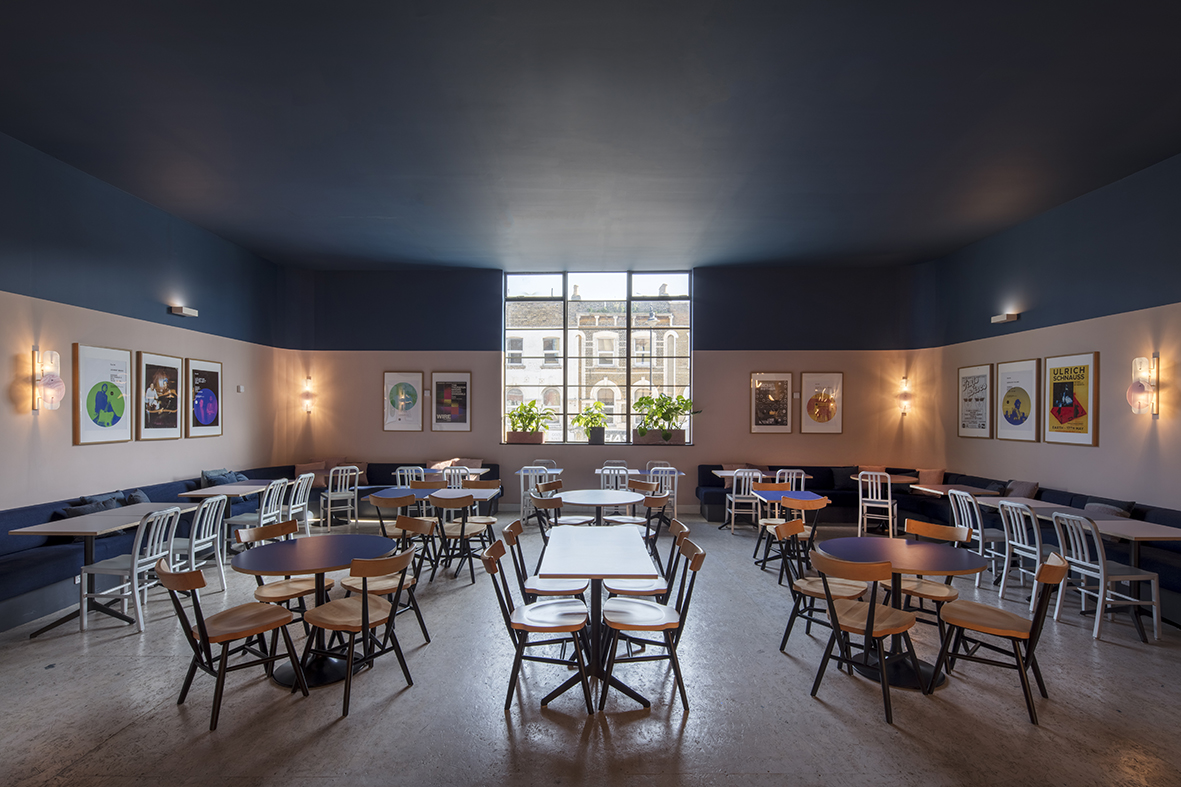 Within EartH, Dalston’s vibrant new music and arts venue, we created EartH Kitchen—an all-day restaurant and bar that shifts effortlessly from neighbourhood hangout to pre- and post-show destination. Housed in the former cinema lobby, the space was opened up by removing dividing walls, exposing original beams, and flooding it with natural light. A central bar and a sculptural feature light—an abstracted sequence of frozen music—anchor the open plan layout, with intimate zones arranged around them. Deco-inspired lighting, Japanese denim banquettes, and colourful formica tables bring a relaxed warmth, while the restored double-height volume creates a striking backdrop for dining day or night.