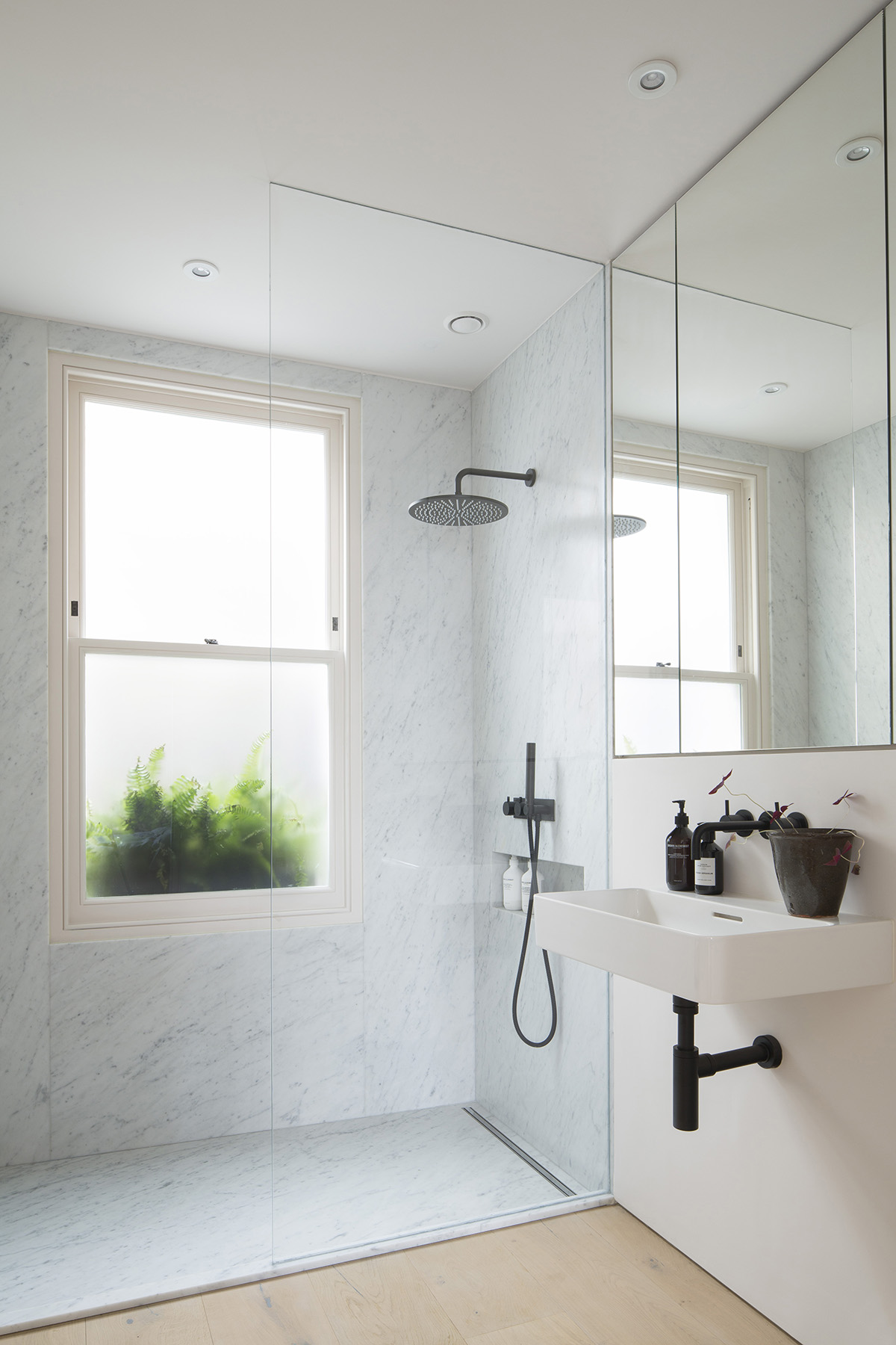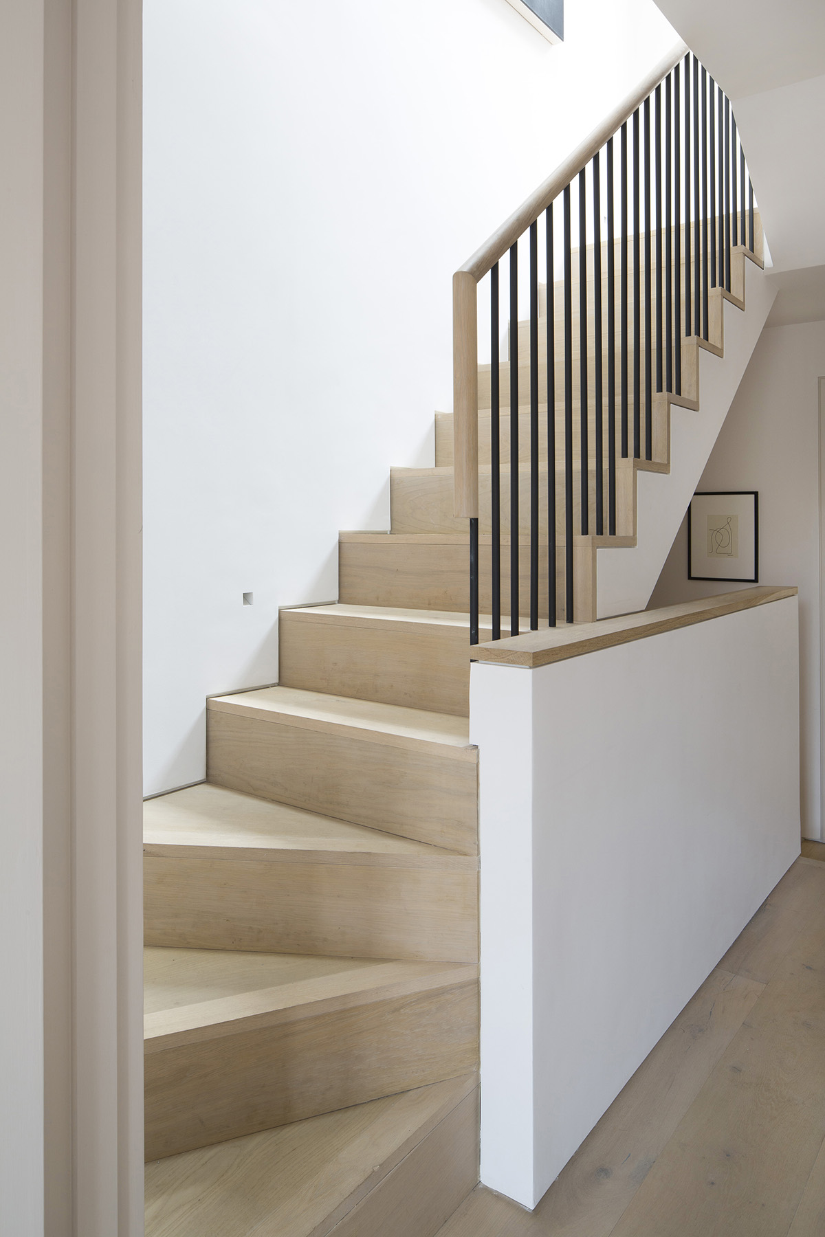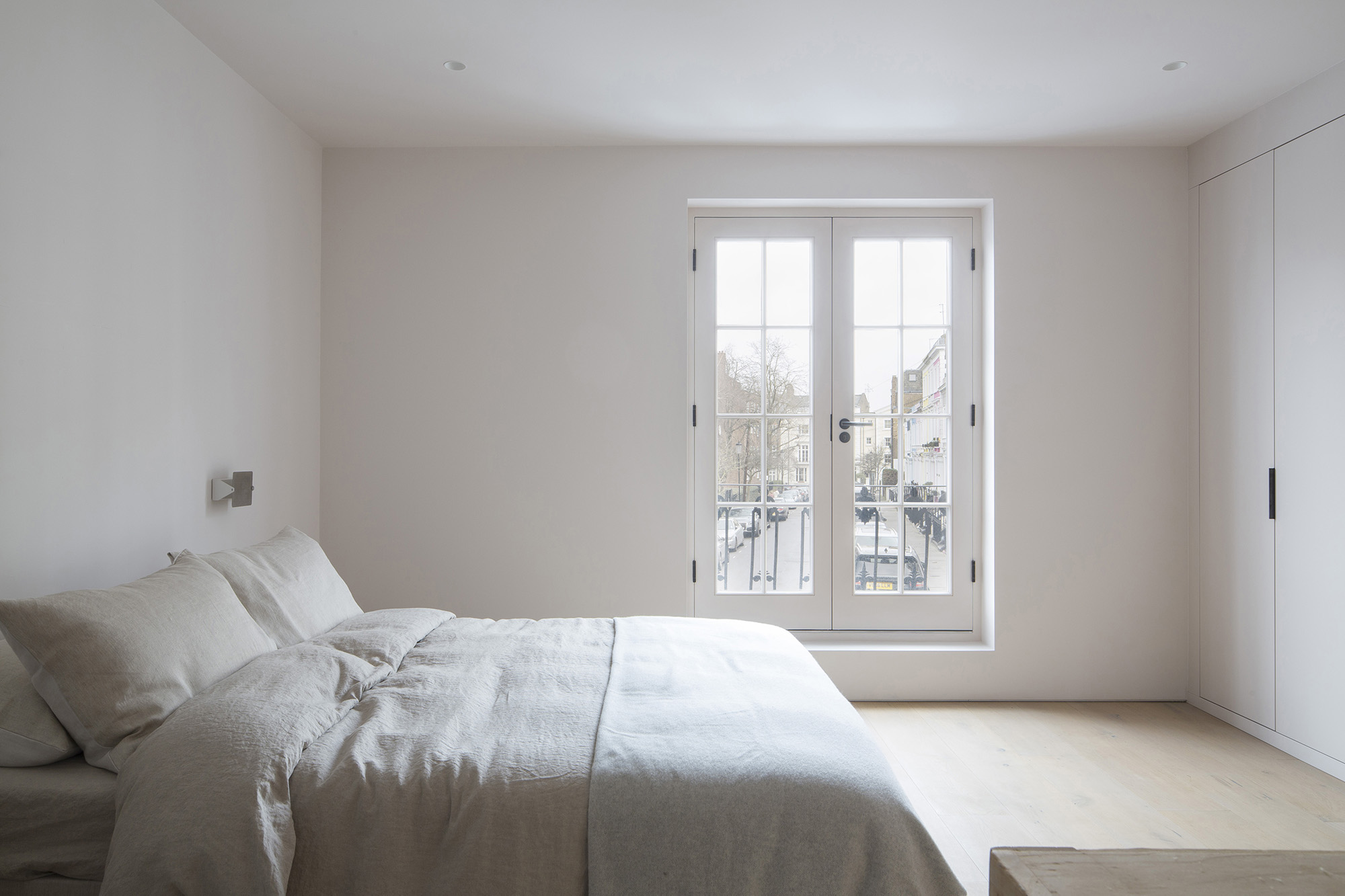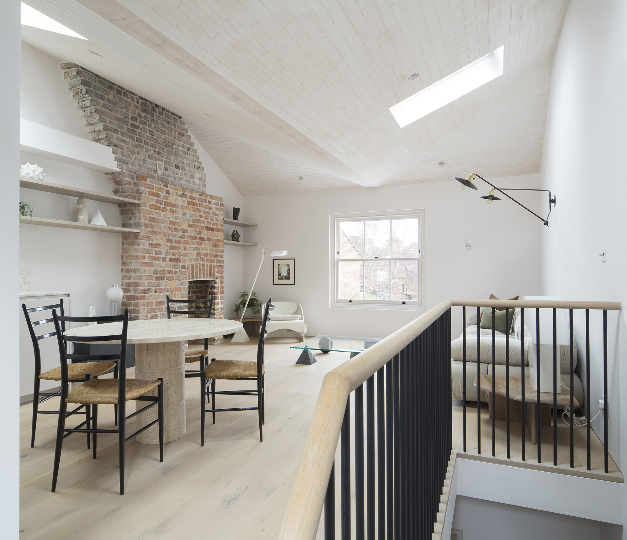 In the heart of Notting Hill’s Portobello Road, we transformed a derelict house and retail unit into a light-filled contemporary home, retaining the original façades while rebuilding the internal structure and extending and adding a roof terrace. The design inverts the original layout, placing bedrooms on the first floor and an open-plan living/kitchen beneath a dramatic butterfly roof on the second. Historic character is preserved through the restored fireplace, while whitened timber ceilings, terrazzo worktops, and oak floors bring warmth and texture. Carefully crafted staircases, generous glazing, and dual-aspect spaces create a fluid, uplifting interior that evolves with daylight and the seasons.