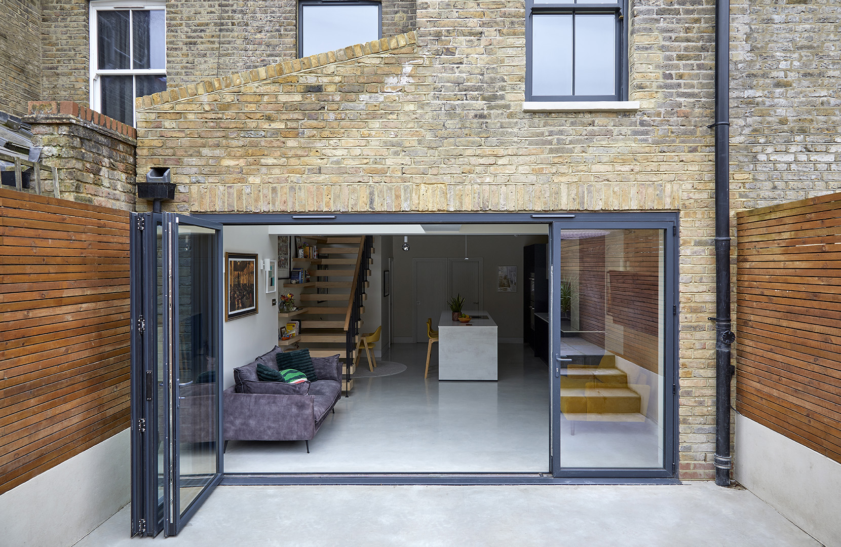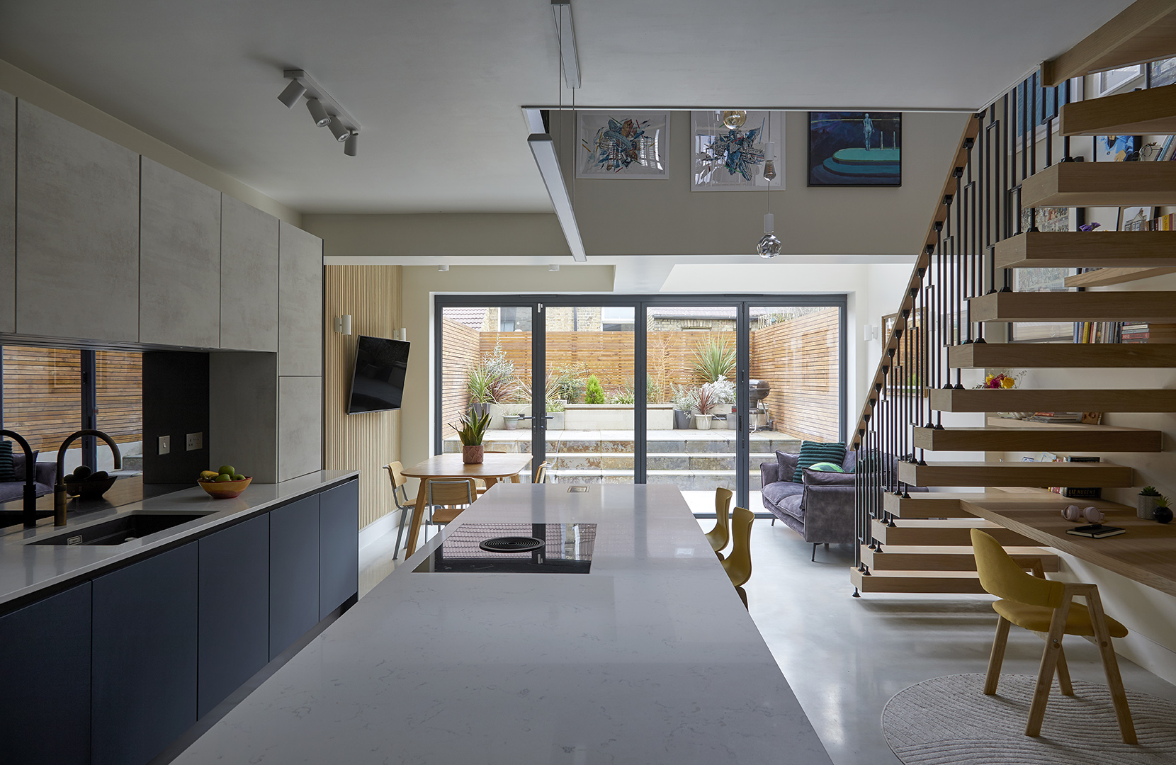 This whole house refurbishment, remodelling and extension project has transformed an Edwardian terraced house located in Ladywell, which had fallen into disrepair. The small existing basement has been extended to create a large double height kitchen/ dining space which opens out onto a relandscaped courtyard garden. A new void containing an open timber staircase connects the ground and basement levels together, allowing views and light into the lower areas. A new zinc-clad loft extension accommodates a master bedroom, complete with an ensuite bathroom and dressing room, with views out over the city.