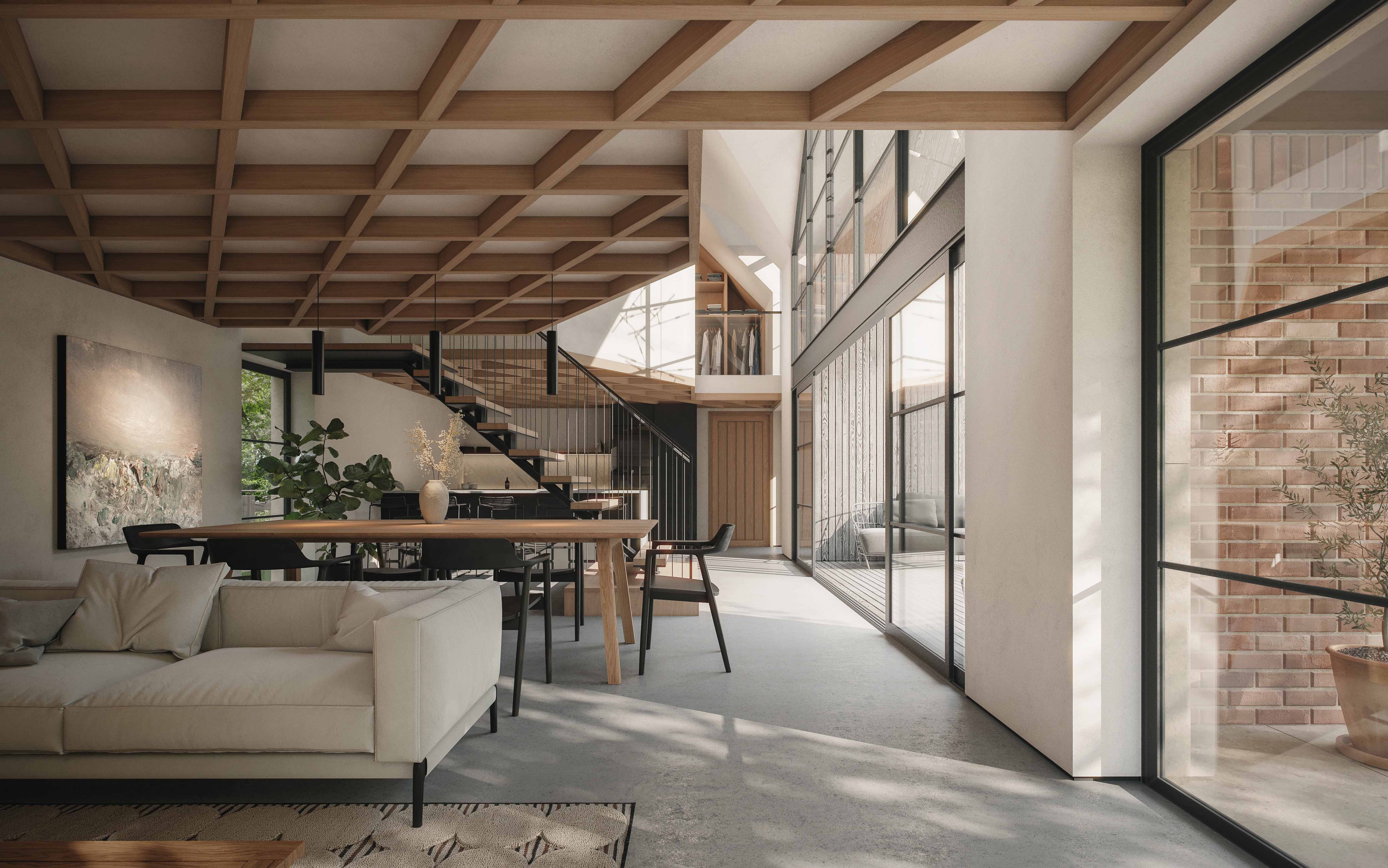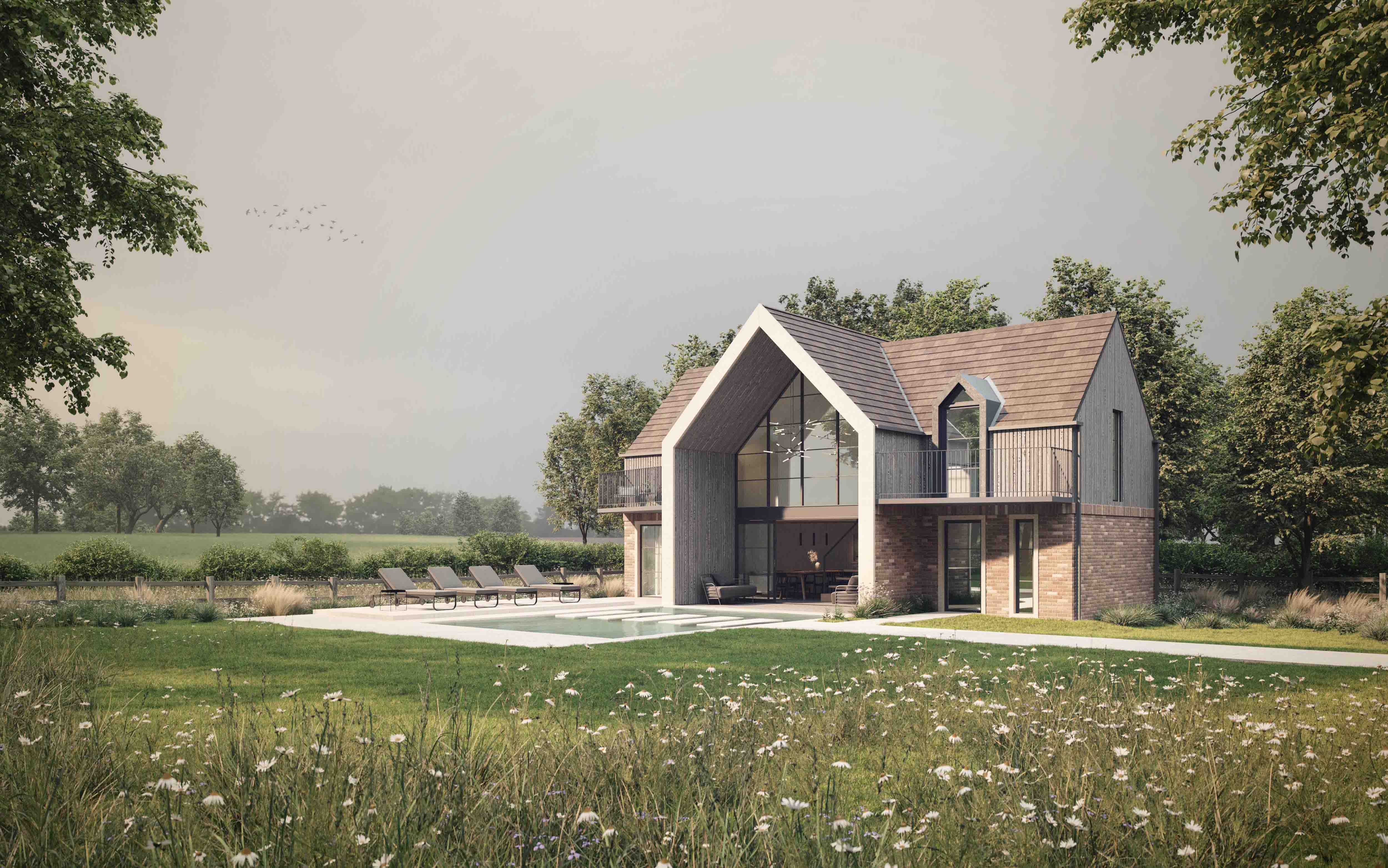 The private client required an ancillary leisure outbuilding, designed to captivate and exploit the unique rural setting. The main narrative for this building is social engagement and interaction. A proposal that encourages friends, family and guests to create memorable experiences. We have contemplated the vibrant and brash environment of Las Vegas pool parties and woven them into the English countryside in more sedate fashion, presenting sophisticated summer parties, lounging in the warm weather, bathing in the pool and appreciating rural views with the setting sun contributing to the ambience. This modestly sized building delivers the core spatial programme with a touch of exploration and adventure. You can be getting ready in one of the bedrooms and still engage with the activities at ground floor level via the double-height space, maybe calling down to request a glass of champagne or enjoying the same music playlist filtering throughout the spaces. The feature gable shelters an external lounge which is only accessible from the inside due to being edged by the external swimming pool. This introduces spatial interplay, zones and intrigue. Internally, the axial staircase, exposed lattice floor joists, crittall glazing system and varying volumes contribute to a dynamic sequence of spaces. The creation of a beautiful place. A fascinating project for an excellent client.
