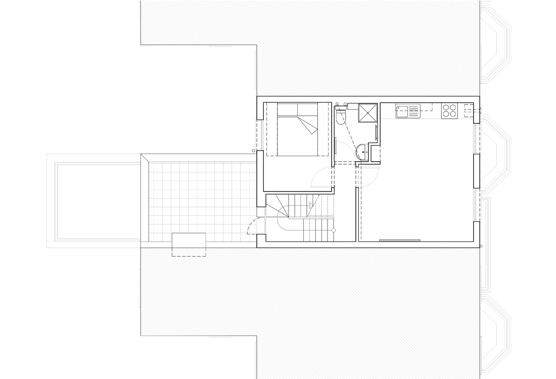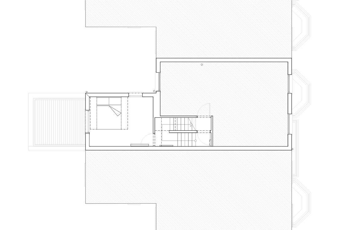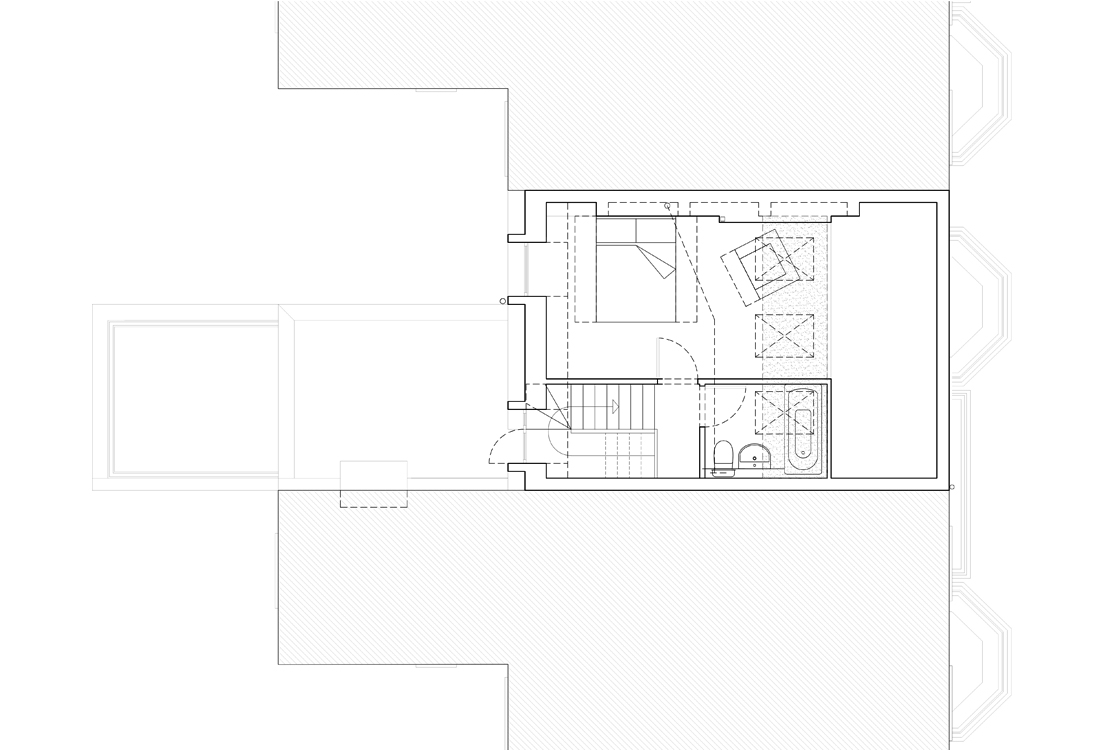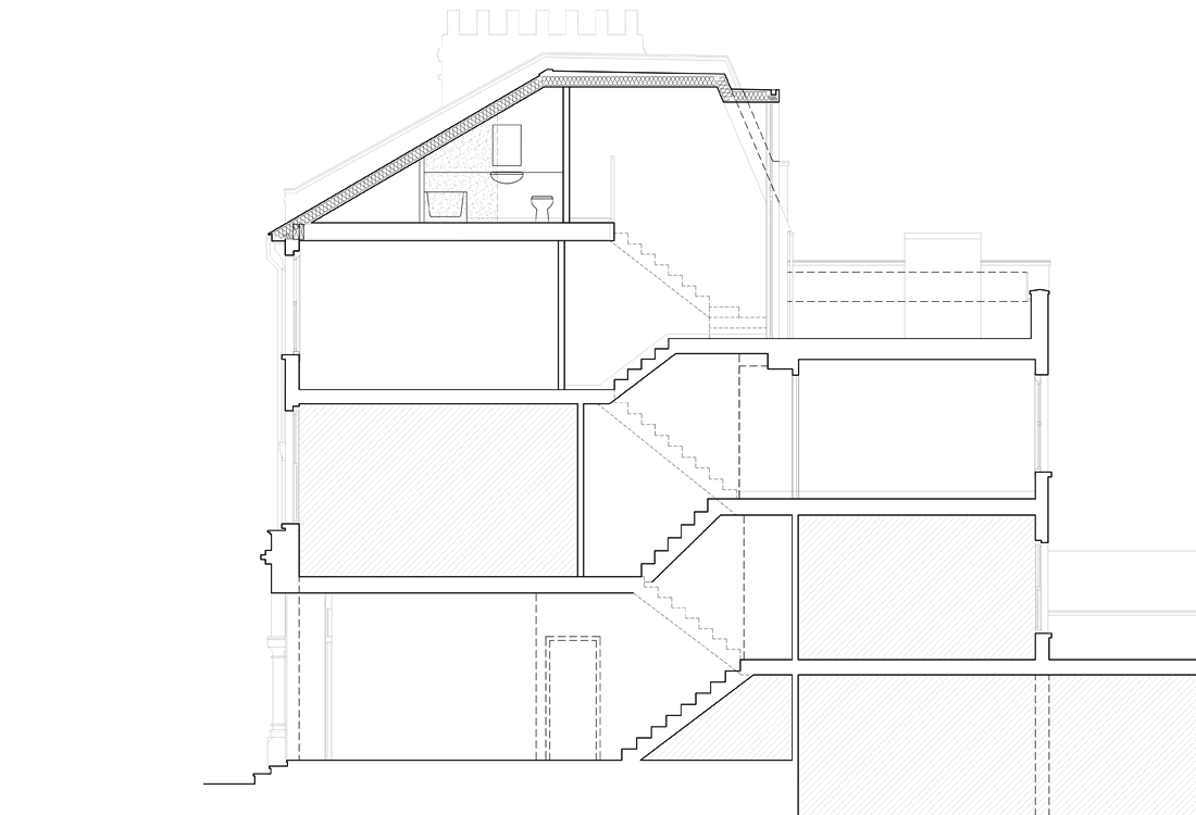 A refurbishment project for the reconfiguration and attic extension to a top floor apartment, located within a Victorian townhouse close to Clissiold park and adjacent conservation areas in Stoke Newington, North London. The split level top floor apartment is distributed over 3 half-levels, the proposals include the attic as a half level extension adding a 4th floor. The proposals involve upgrading and reconfiguring all levels including a roof terrace with a new room with ensuite bathroom in the attic.