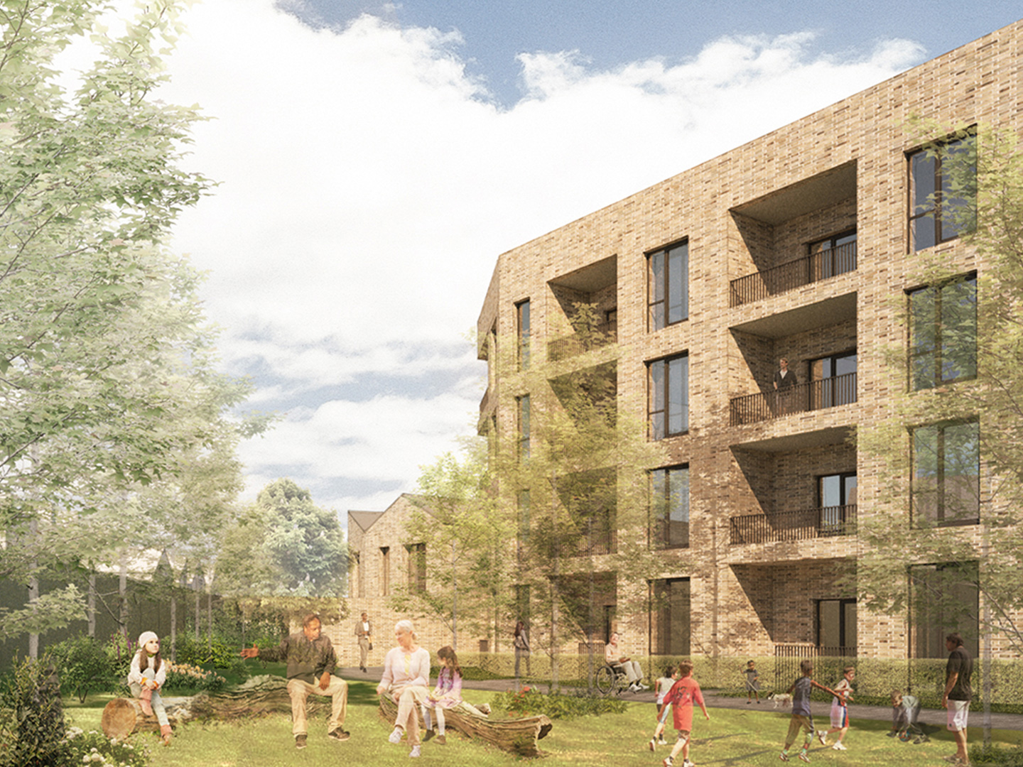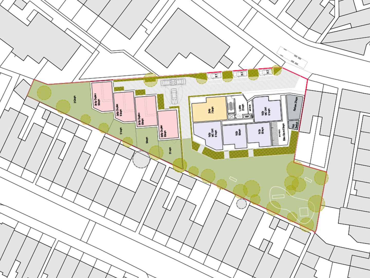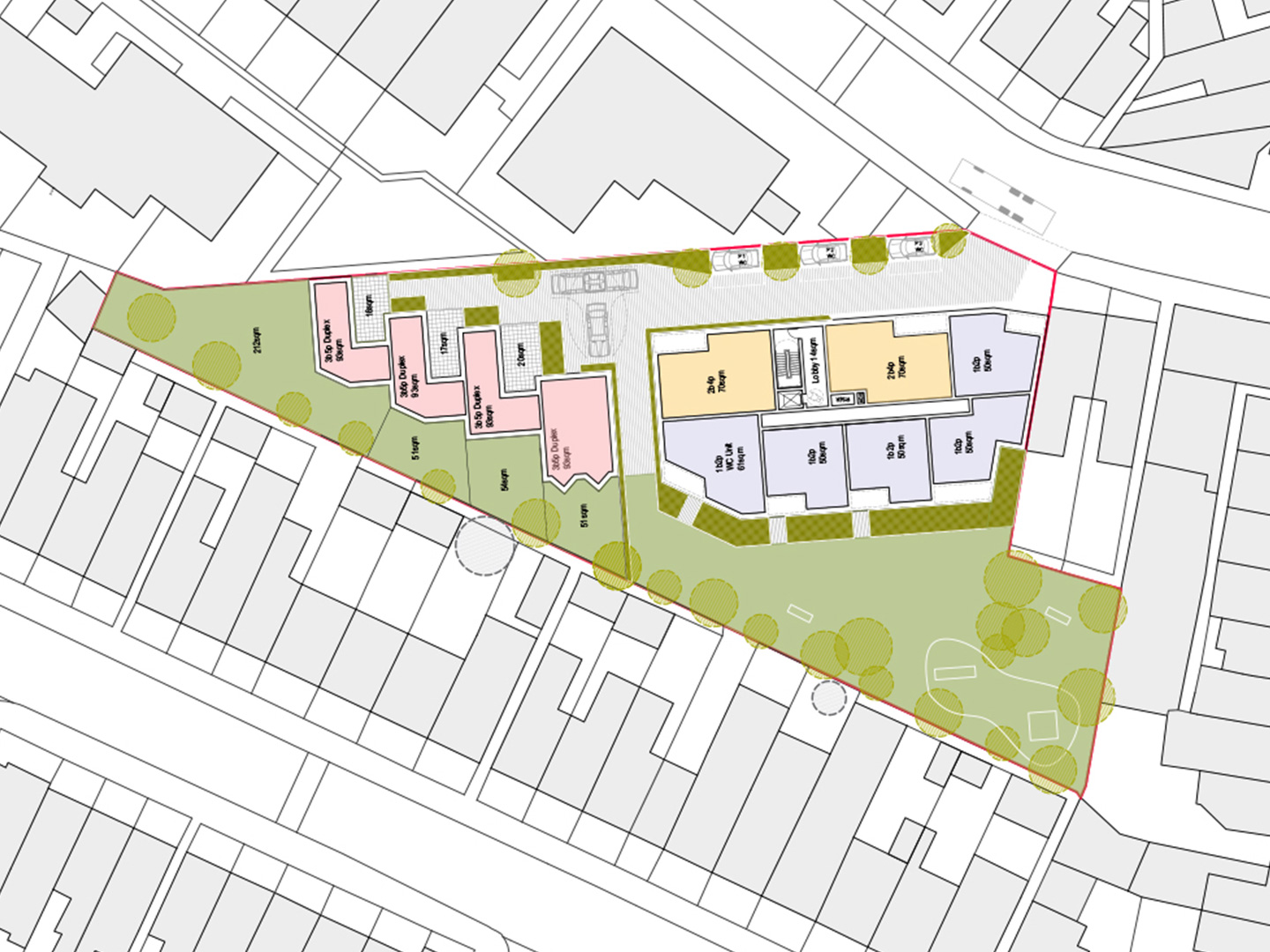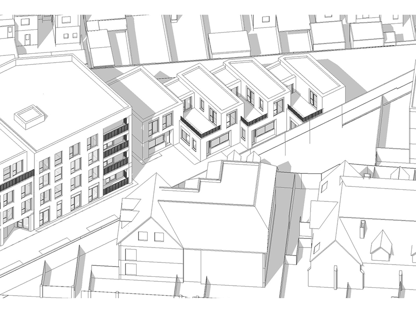 Featherstone Road is an urban infill project located on a former light industrial site in Southall in West London. The site is characterised by a single point of access and situated within a residential area. An ensemble of buildings is proposed in response to the triangular shape of the site, with an articulated apartment building at the entrance stepping down to staggered town houses towards the narrower part of the site. The apartment building is located close to the site entrance creating an intimate mews entrance terminated by a cluster of family houses at the end point. A generous communal ‘secret garden’ completes the site to the rear.