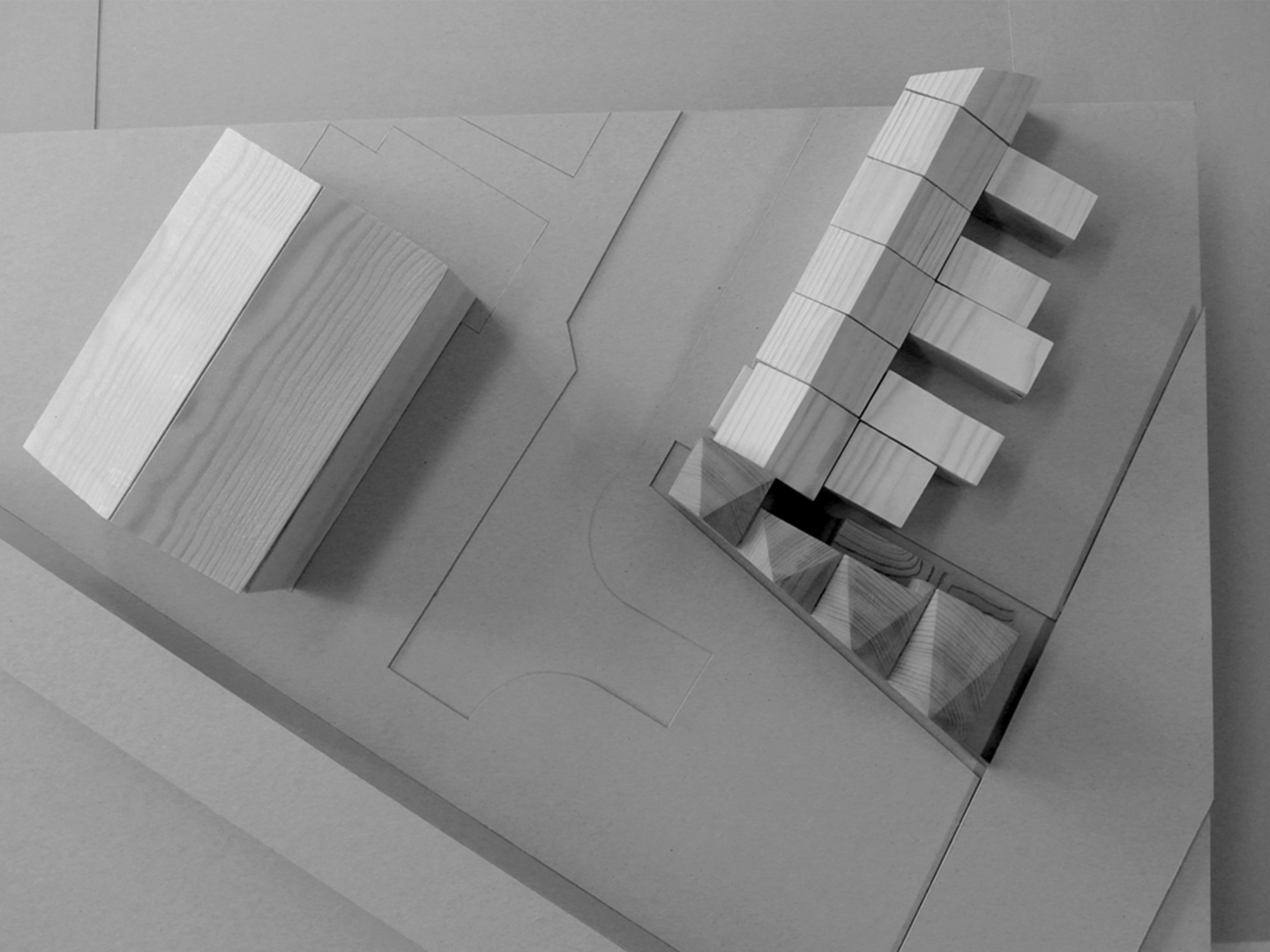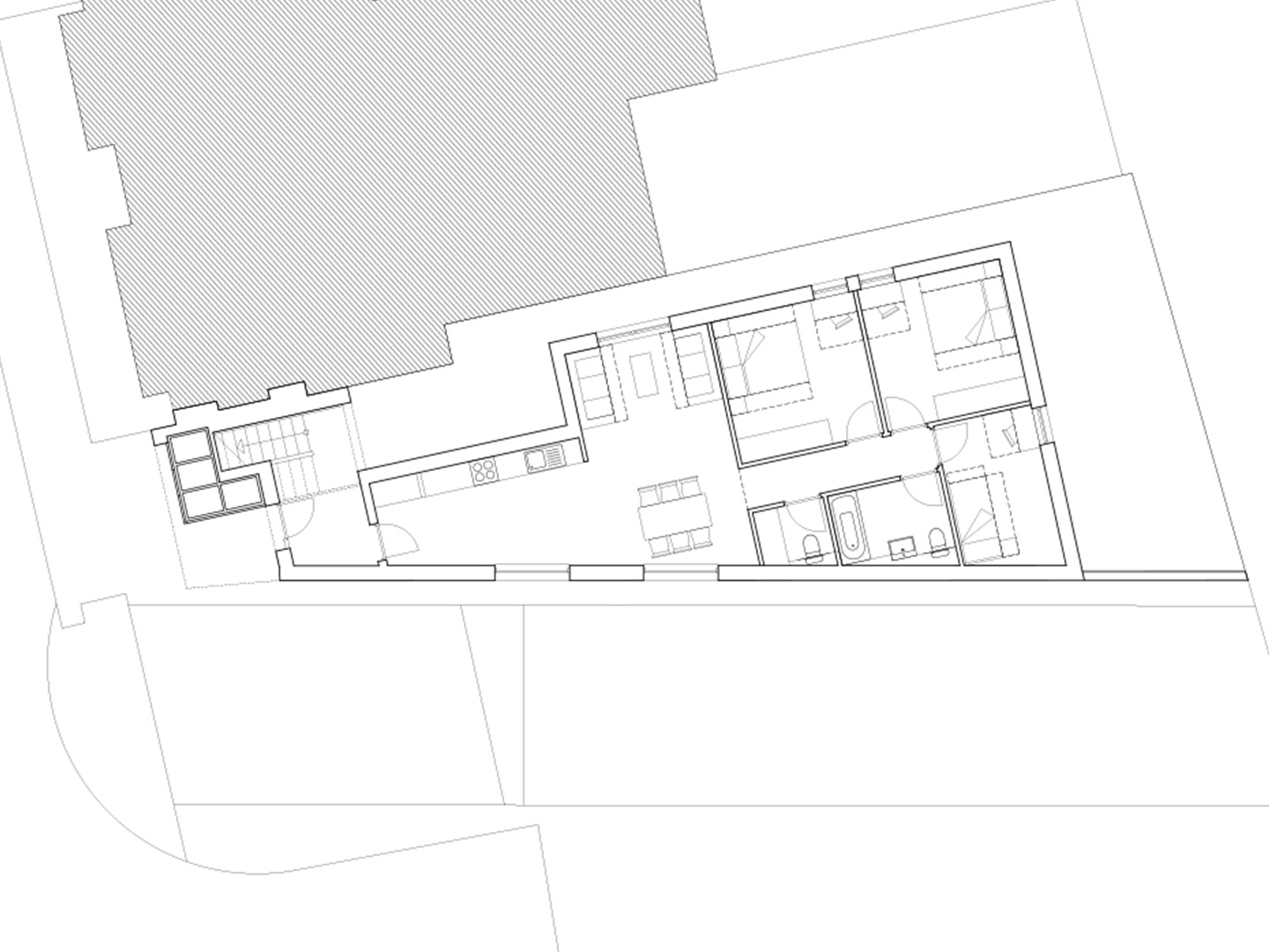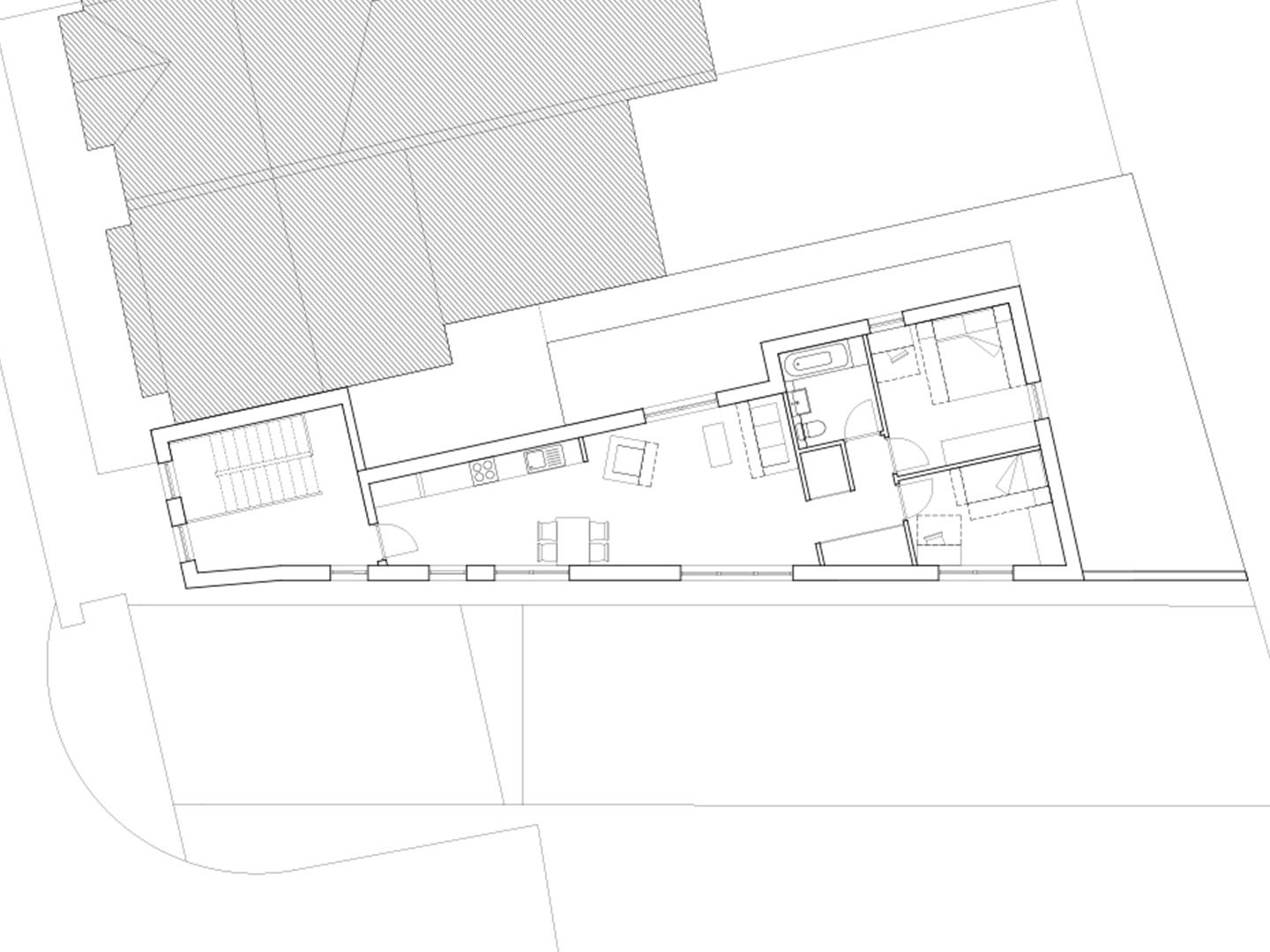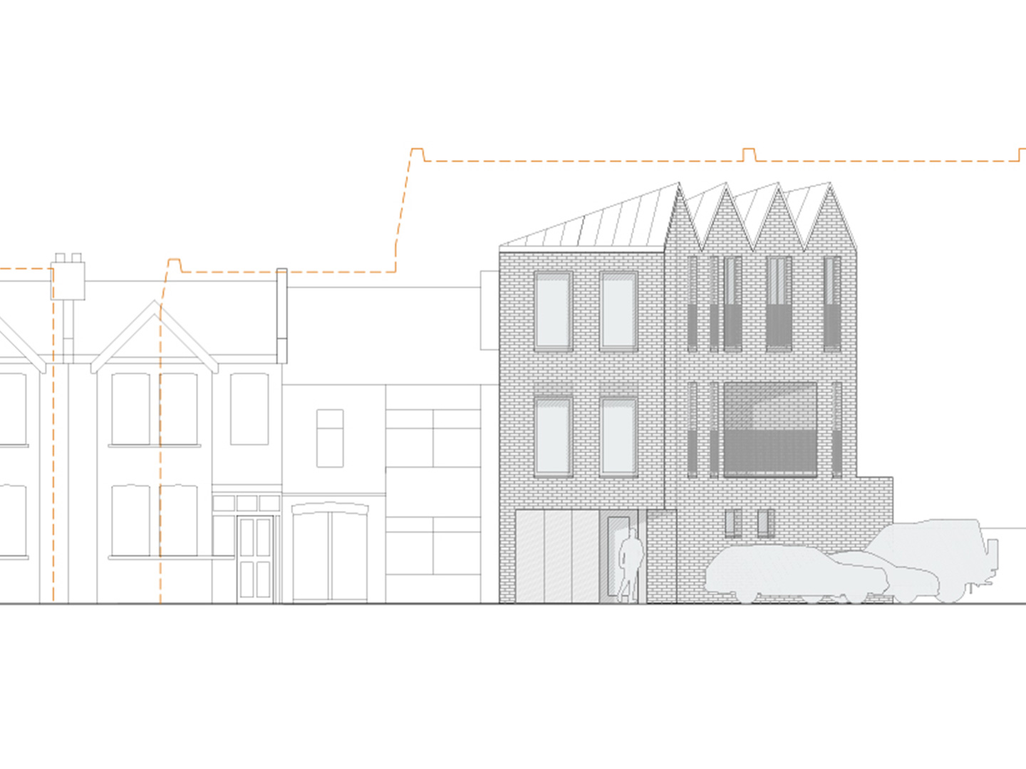 We provided a full architectural service for this private developer project. The site is a left-over piece of land owned by the adjacent terrace but disused. It is bounded by an undergroud line to the west and an overground line to the north bounding the northern edge of the site with a viaduct and carpark. The proposed building overlooks the street and carpark area bookending the terrace and completing the terrace with a unique end of terrace apartment building.