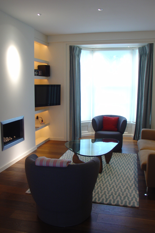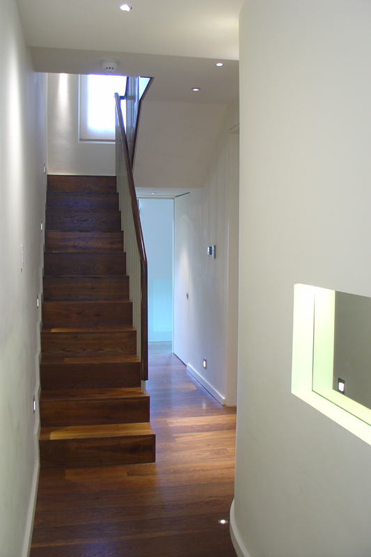 Complete refurbishment and basement extension to four storey terraced house in Kensington. The works included the installation of a green roof to the extension and solar panels on the existing pitched roof. A new staircase was installed throughout and general alterations to the internal layout included two new bathrooms, a new kitchen and storage fittings.