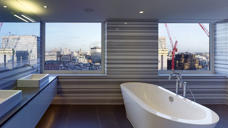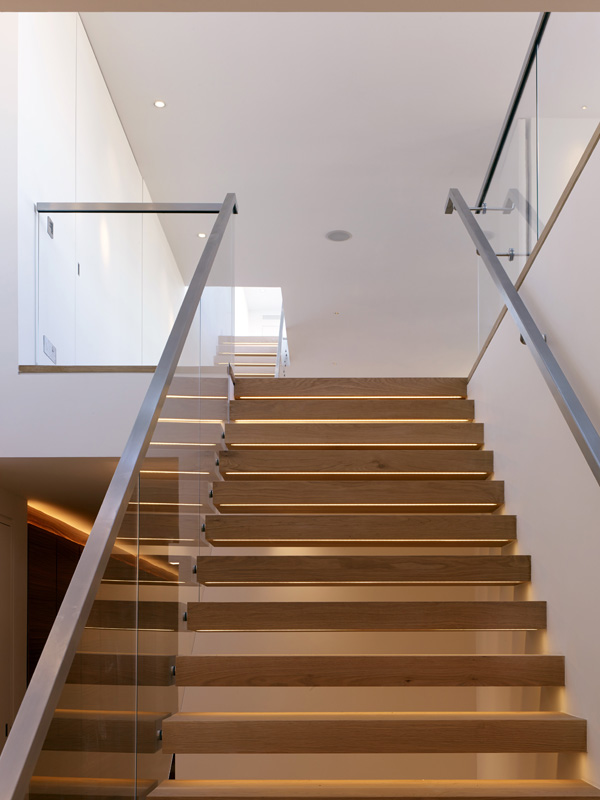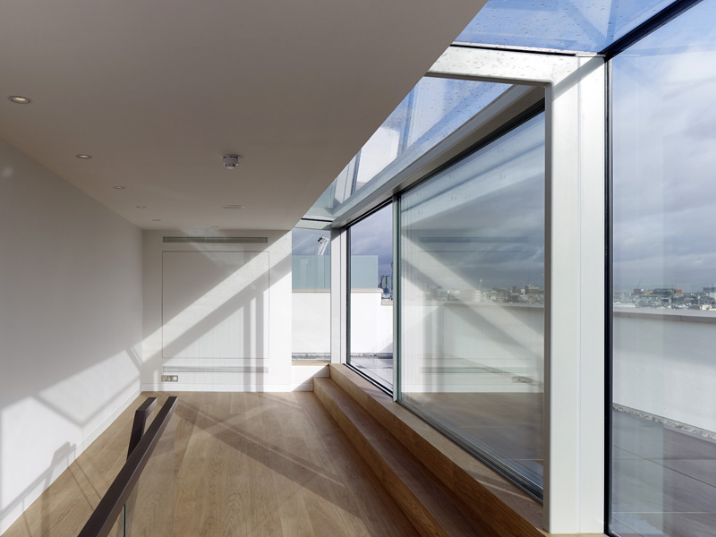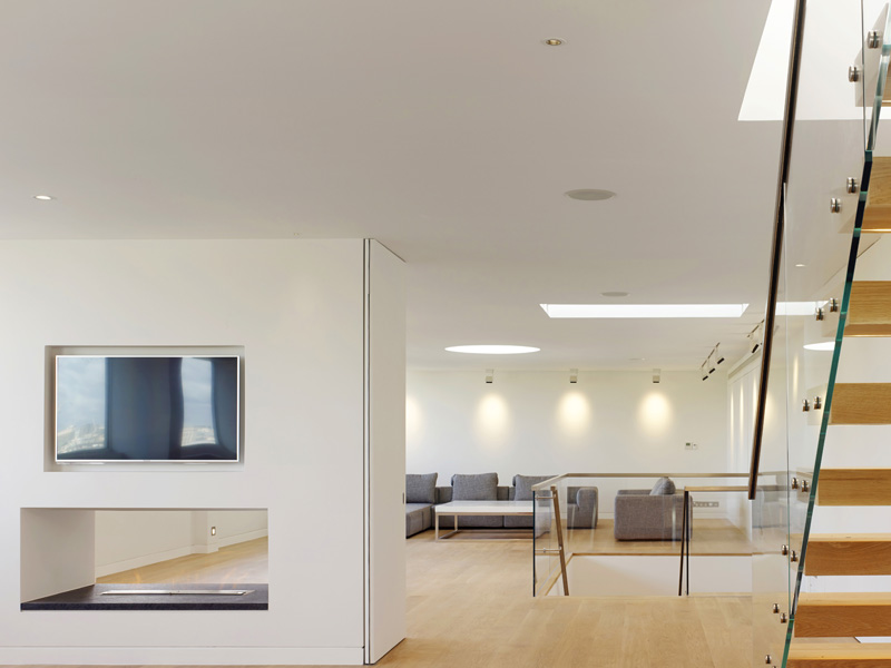 Refurbishment of 430sq.m penthouse flat on the top two floors of a 1960s residential block in Victoria, including the construction of a new glazed rooftop studio structure. Competitive appointment. This property was purchased as a one bedroom flat in need of complete refurbishment and updating. The whole apartment was stripped out to its concrete shell whilst the extensive necessary permissions were acquired to construct a glazed studio room and terrace on the previously unoccupied rooftop. New stairs were installed to draw the eye up to this dramatic addition, and new partitioning installed to create a four bedroom home with generous living areas. All the joinery was purpose designed. Loose furnishings were selected by the owners. The project was completed on time and within budget.