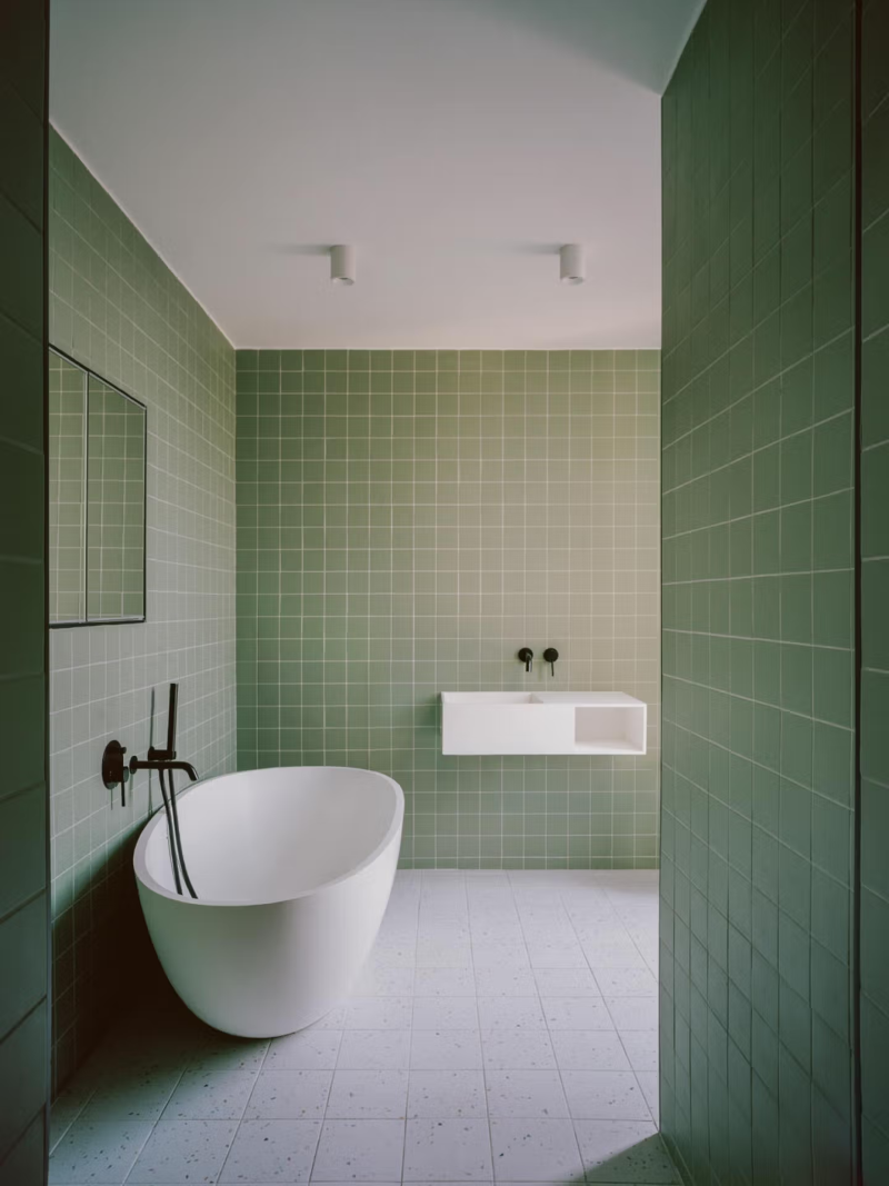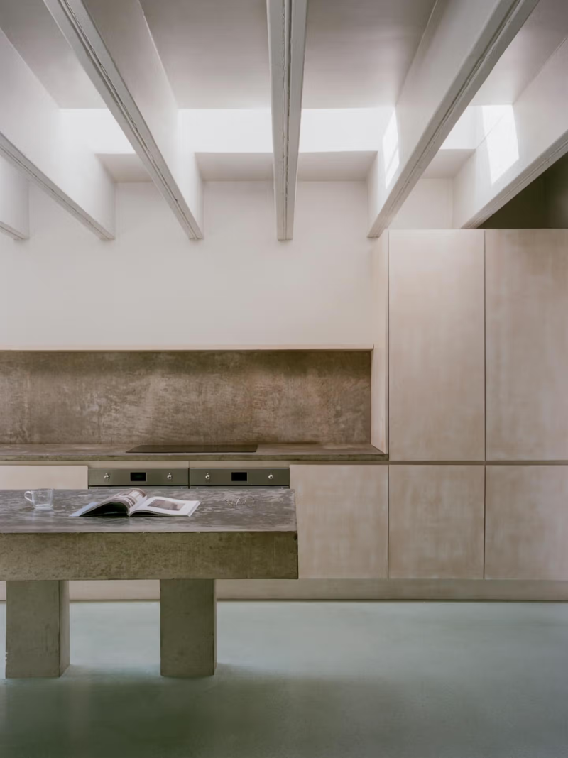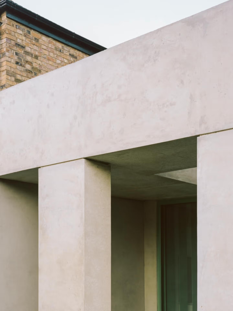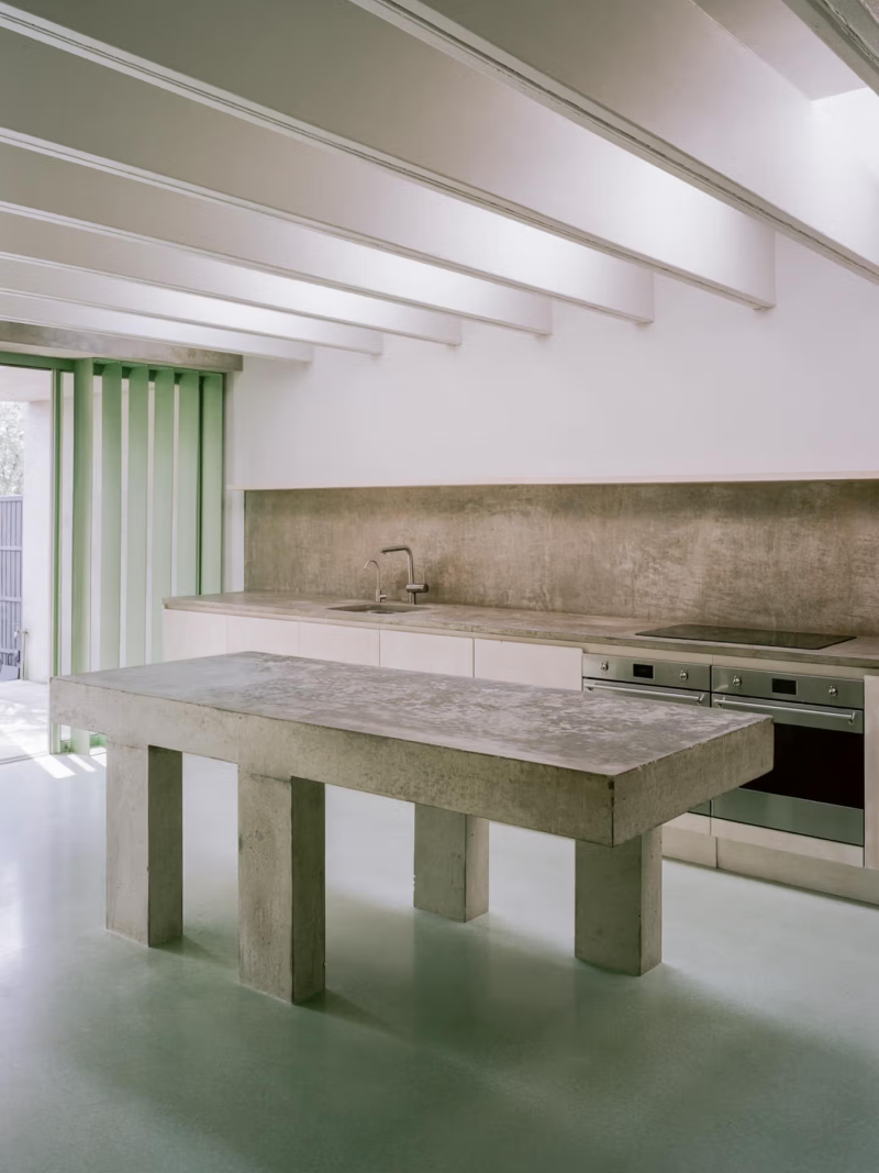 Introducing an in-situ concrete extension to a traditional Edwardian terraced house in Acton, this project explores ideas of structure and symmetry. The rear extension consists of a four-column concrete pavilion, supporting the roof slab and the existing home. This structure becomes a recurring motif; inside, the kitchen island takes on this same design, becoming a scaled-down version of the extension. With monolithic, yet airy, proportions, it avoids the bulkiness of a standard kitchen island, letting space flow through below. In each case, a concurrent feeling of something light and something heavy is created. The front and rear elevations are also mirrored. This creates two pockets of space that face the garden – a courtyard on one side, and a study on the other. Generous roof lights allow natural light to pour into the open-plan kitchen and dining room, and colour is introduced through a soft green concrete floor that runs the entire length of the ground floor. Green steel screens carefully layer the windows, and an unexpected steel-clad dormer, housing a new top-floor bathroom, creates an intriguing contrast against the traditional roofline. The conventional strategy for a side infill and rear extension is to prop the existing walls with steel beams. Inspired by the spirit of the original dwelling, this project takes an alternative approach by incorporating deep timber beams that take the load of the two storeys above. At every turn, the project pushes beyond conventional structural methodologies while utilising repetition of forms to create contrast and intrigue. The project was delivered while working at Teatum + Teatum.