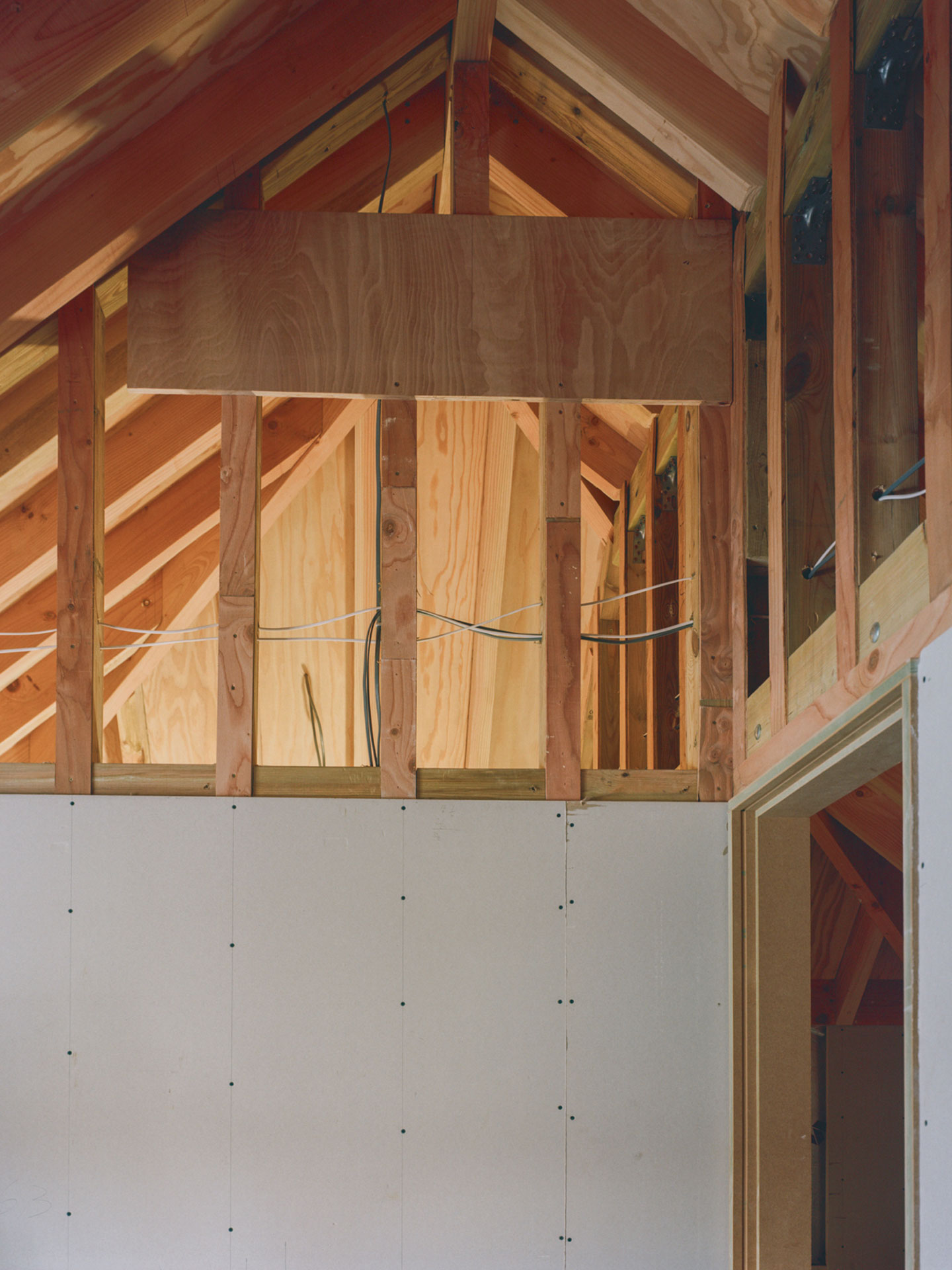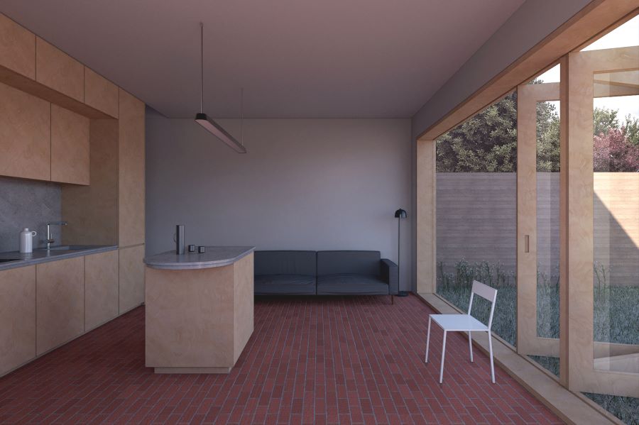 A new-build home that embraces its existing context, this detached house in Ruislip takes on the form of the surrounding suburban housing, while crisp, considered detailing elevates the design for a modern context. Celebrating the interplay of patterns, textures and materials, the exterior is divided into thirds, with brick on the ground floor, rough-cast lime render above, and clay tiles on the hipped roof. Contrasting brown and red tiles result in an eye-catching roof pattern that creates an almost pixelated effect from afar. Internally, this project makes clever use of space, creating a two-storey, two-bedroom home within the absolute minimum footprint outlined by The London Plan. An open-plan living area at ground floor maximises the layout, while the upstairs bedrooms gain vertical space through high ceilings that open up to the roof’s structure.