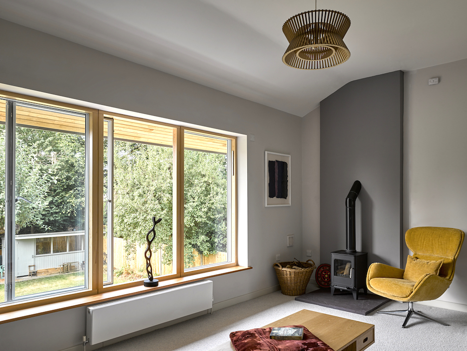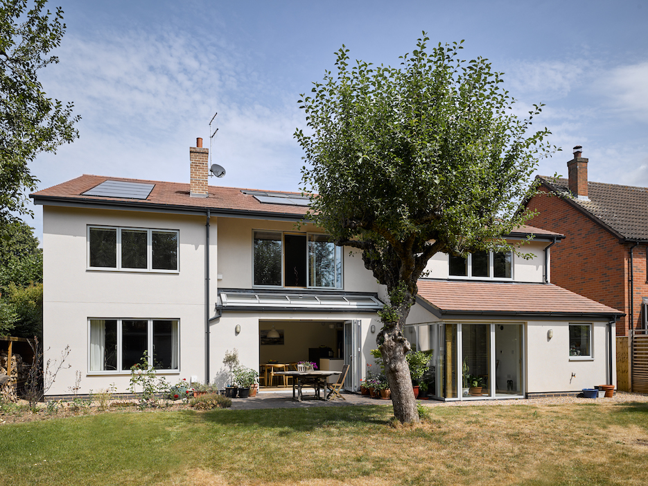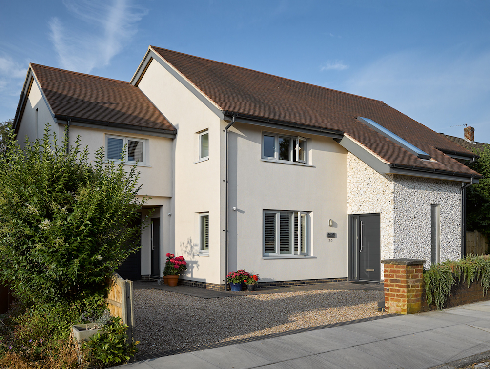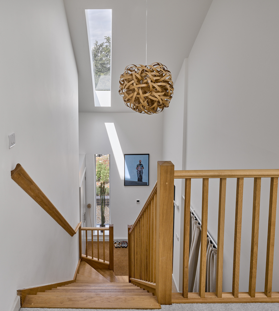 A rare example of a new build house on a tight site in the St Albans conservation area. It faced really tough and conservative planning constraints. Designed to low-carbon and passive-design principles and uses off-site manufactured Hemcrete panels together with wood-fibre insulations to give a 'breathable' house to high insulation standards. Designed for multi-generational use and home-working. Unusual first floor living room over a kitchen/dining snug below facing south over the garden - with deep overhangs to the first floor to protect the first floor living room from high summer sun. Ground floor also includes a WC suitable for conversion to wheelchair use, together with an office/bedroom and a guest bedroom with ensuite shower room which all face north. Energy saving features also include a solar thermal panel and a woodburning stove linked to a thermal store, topped up by a conventional boiler. There is also a solar photo-voltaic array. Winner of the St Albans Civic Society Award 2018. Photos by Lance McNulty