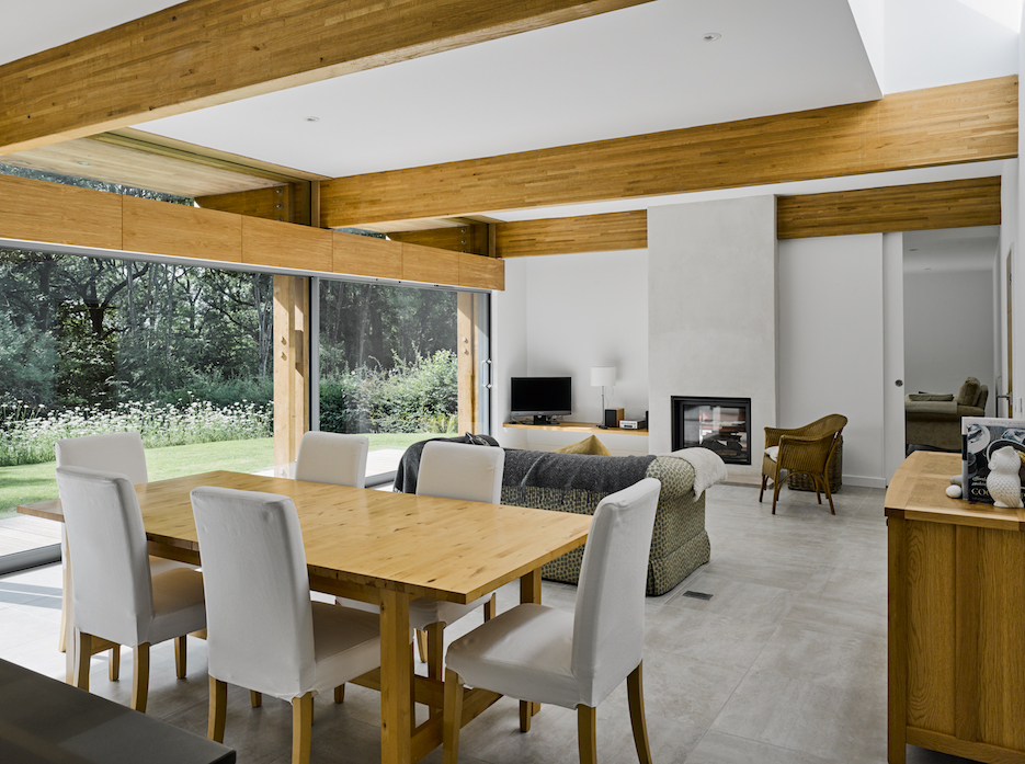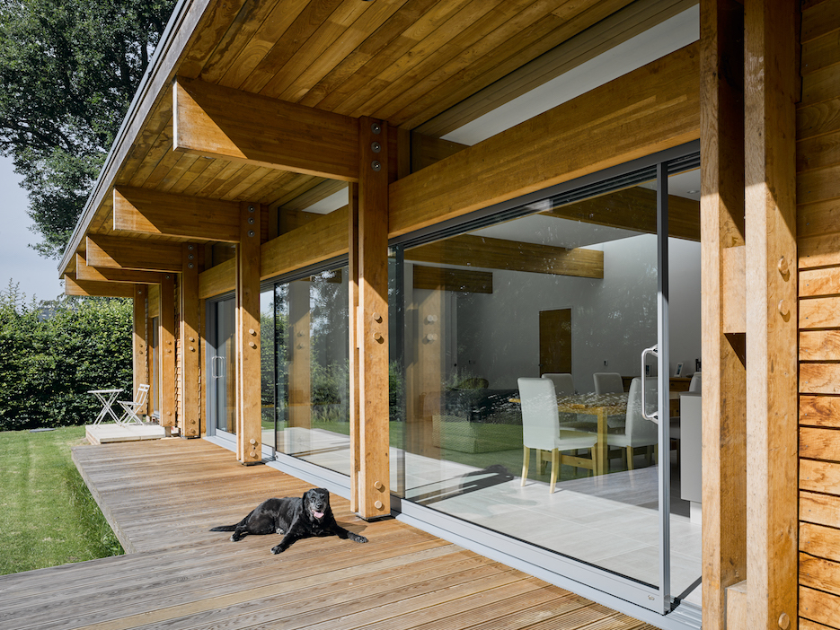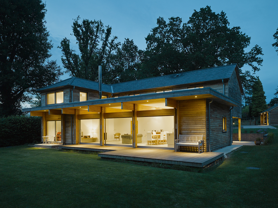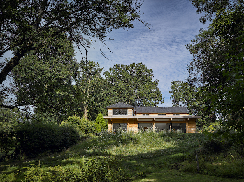 This family house enjoys dramatic views over woodland. This timber-framed home, clad in chestnut cladding, is designed to be low energy and is heated by an airsource heat pump. It features a spacious kitchen/dining/living room and a snug linked visually with a through-view stove. It was designed and built to a tight budget.