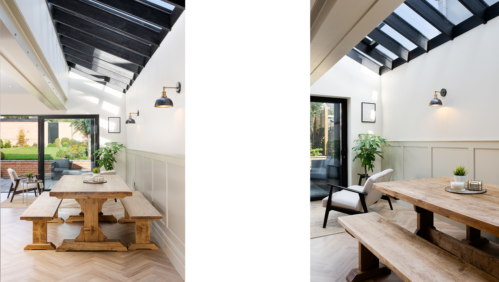 Side return extension and first floor remodeling of a 6 bed end Victorian terrace. The property is situated on a slightly sloping site and the garden faces North - North West. The existing side return wasn’t utilized and the existing kitchen was tucked to the rear of the property. The finished project opens up the rear elevation with a bank of triple sliders, the side wall of the property has been removed and the footprint has been extended into the side return. The new sloping glass roof lets light in over, and a new kitchen living dining space is accommodated in the reconfigured space. The side garden on the opposite side has been largely retained with new windows added to promote views out from the kitchen. It accommodate a new external lobby and boot room which enable access out from the kitchen and from the new utility. As part of the works the clients were keen to improve the thermal performance of their home. Internal wall insulation has been added to the existing walls in the rear section of the house and all windows to the side and rear have been replaced. (We adopted internal wall insulation as the existing window positions and the existing stone cladding made the use of external wall insulation unsuitable). All the existing ground floors have been dug up and replaced with solid floors, new insulation and underfloor heating. The insulation to the roof spaces has been increased to 300mm and the stone pointing replaced throughout. In order to maintain adequate levels of ventilation dMEV (Decentralised mechanical extract ventilation) has been added to the newly insulated wet spaces. The existing system boiler has been retained for now but a new PV ready water cylinder has been added. In due course (5-10 yr plan) the clients plan to upgrade the windows and insulation to the front section of the house, install PVS and, once the boiler has reached the end of its lifespan, they will look to replace it with a new air source heat pump.