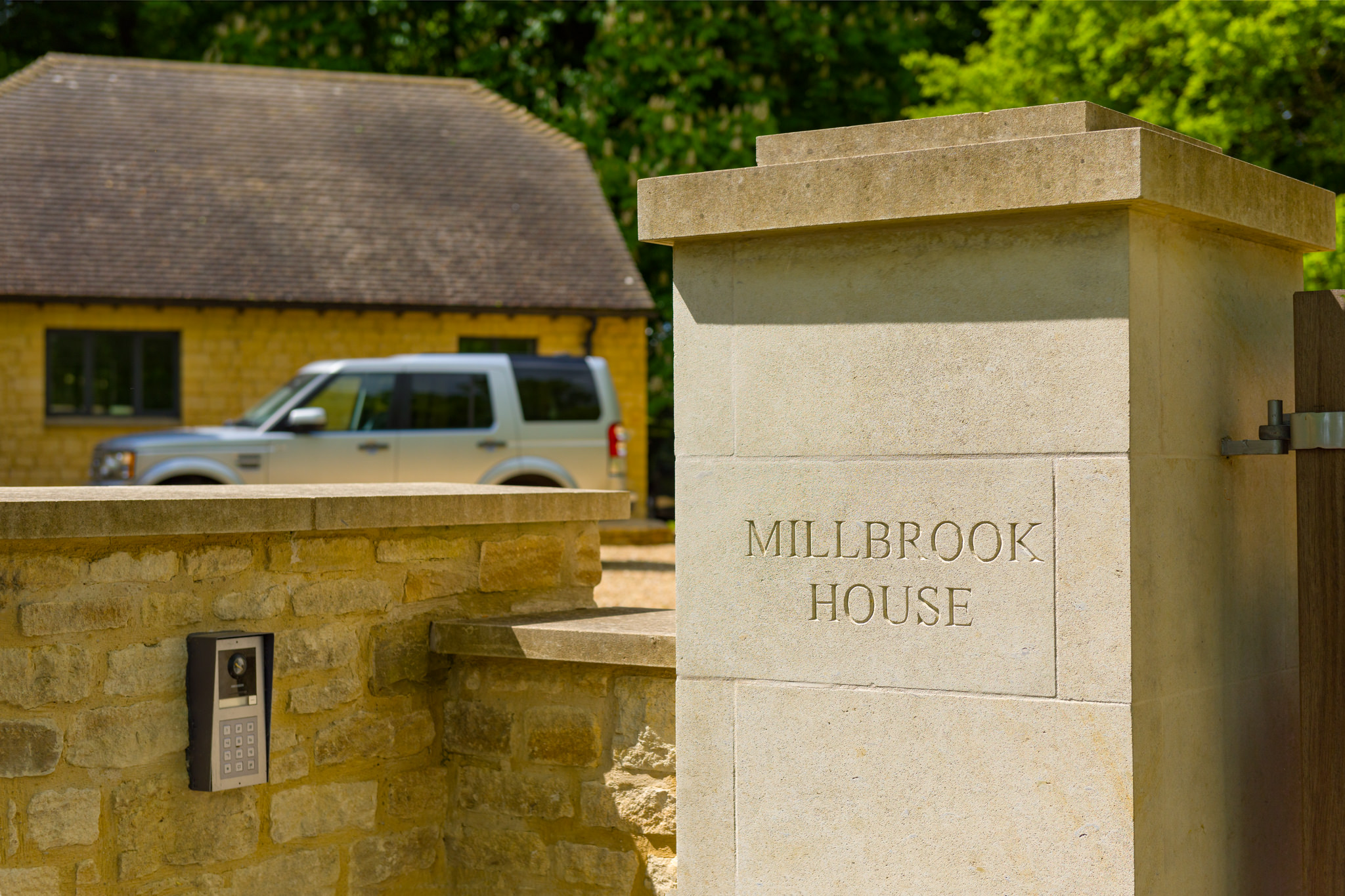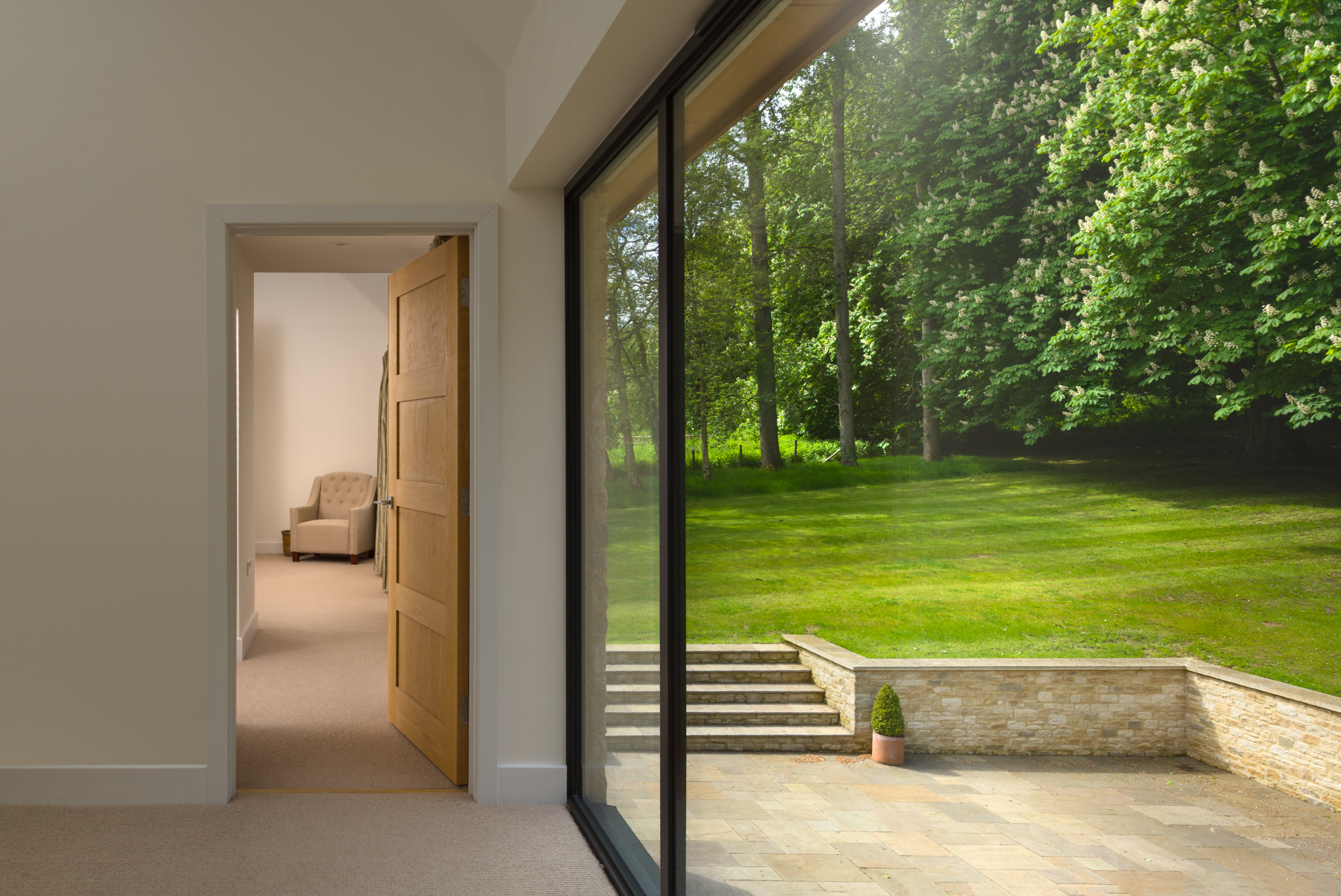 Our clients wanted to build a new house on the edge of their commercial and agricultural land in Middle Aston, Oxfordshire to replace a tired 1950s bungalow. They had planning approval to develop the bungalow but wanted us to come up with a new plan that would give them a much larger house suited to a farming setting. Oriented to make the most of the amazing views, the new house uses the best of the local vernacular architectural styles in a modern and contemporary way and is full of interesting design details that our clients absolutely love. The site extends to four acres, overlooking the Cherwell valley on one side and a beautiful avenue of horse chestnut trees on the other. The aim was to open up the views and make the most of the garden to the rear. The property is a house of two sides. The public, street-facing elevation is the grander of the two. Window reveals are in bespoke dressed stone. A continuous stone corbel surrounds the base of the property, stamping the property onto its site. A cut stone modern porch draws the eye and clearly identifies the main entrance. The design of the back of the house is simpler, with large expanses of glass opening the home up to a series of terraces. As you walk into the house you enter an amazing triple-height hallway with a bridge over. The hallway slices through the house from front to back, with a double-height glass wall at the rear giving far-reaching views of the garden, the avenue of chestnut trees and the countryside. This space helps orientate the plan and expresses the flow of the house. Off the hallway to the left are the more formal reception rooms. To the right is the kitchen and family room, featuring a glazed corner window with an unusual glass-to-glass junction. This creates a point of interest and provides stunning views of the garden. The master suite occupies one side of the first floor. From here you walk across the bridge over the hallway and turn right toward two bedrooms and a family bathroom. Turn left and you find two guest suites in the rear wing of the house. As you walk across the bridge between the bedrooms, a slot window above the main entrance frames a single tree on the far hillside - an inspired design feature that links the house to its very special setting. The existing garage was retained and linked to the new house with a covered arcade that opens to a courtyard, a log store and a boot room entrance. Detailing is key but unfussy with limited junctions. The result is a blend of simplicity and grand proportions.