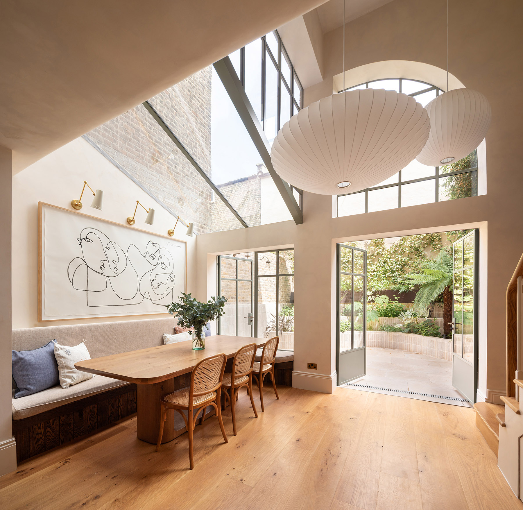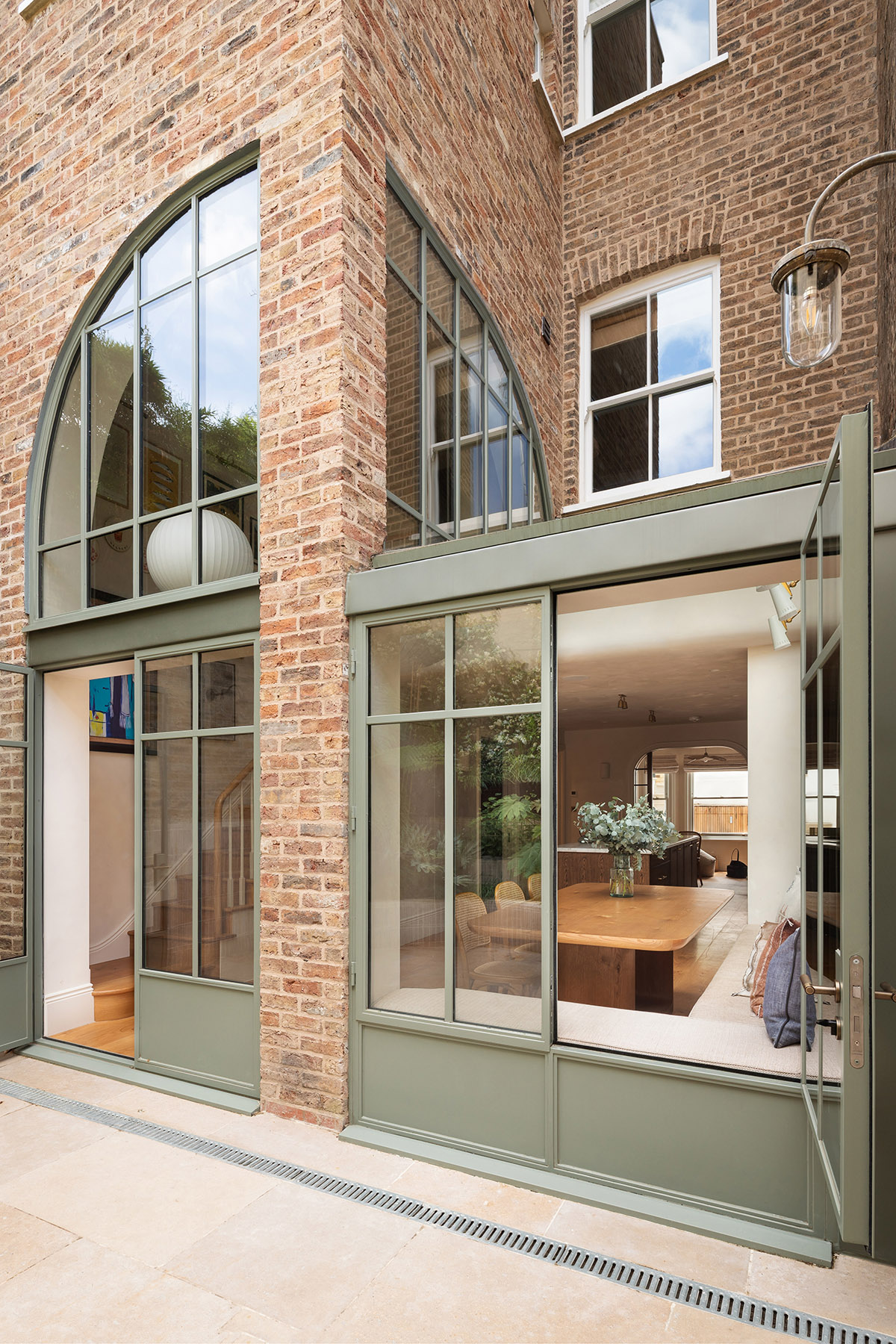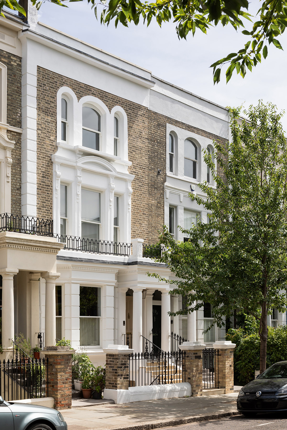 Creating a four bedroom family home in Notting Hill / Ladbroke Grove that completely transformed a dilapidated 1870s terraced house. The brief opened up family kitchen and living spaces split over two floors. The creation of a double height space leading onto a new garden was made possible through the excavation and underpinning of the garden walls. Creation of a roof terrace after Conservation Area consent and rebuilding of the old butterfly roof. The double height space features unique curved glazed openings with curves then referenced back around the house and garden through details and fixtures. Restoration of the original brick walls with lime pointing. Insulation with breathable materials using wood fibre internal wall insulation, allowing the historic walls to move moisture rather than trapping it.